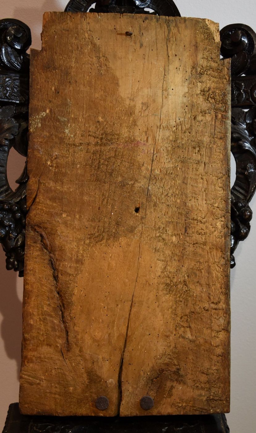 L’eccellente stato di conservazione del supporto ligneo, con alcune mancanze e piccole cadute di colore, permettono di apprezzarne appieno la qualità, con ancora tracce della policromia e della doratura.
