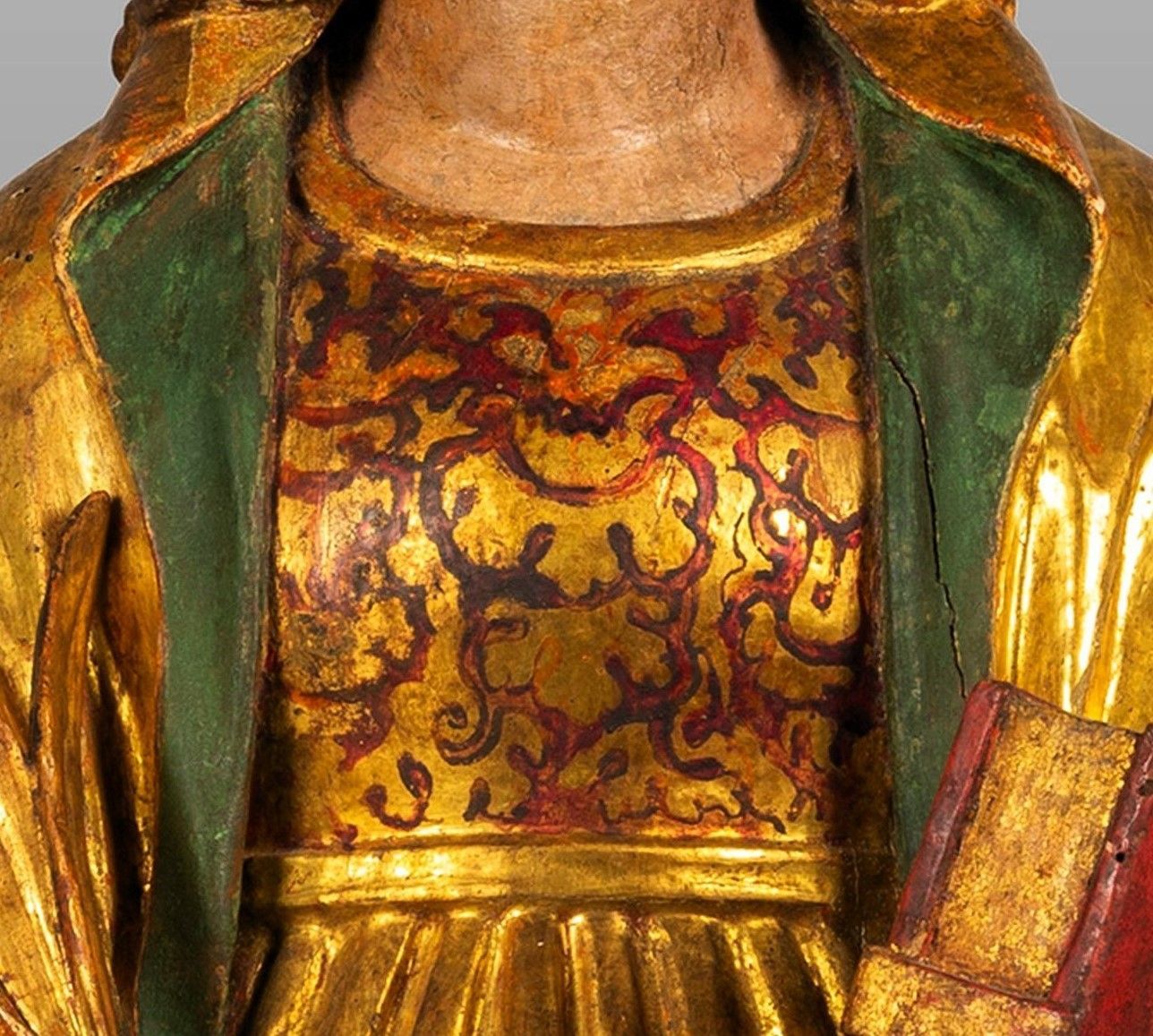 Lo stato di conservazione della policromia e della doratura conferiscono all'opera una immagine davvero splendida. L'eccellente qualità scultorea, evidenziata da una perfetta descrizione delle pieghe verticali e da un notevole realismo del viso e delle mani, è supportata da una finissima policromia e da una magnifica estesa doratura. In effetti è proprio la superficie pittorica che dona alla scultura un effetto di eleganza soprannaturale e la rende così rara e preziosa.