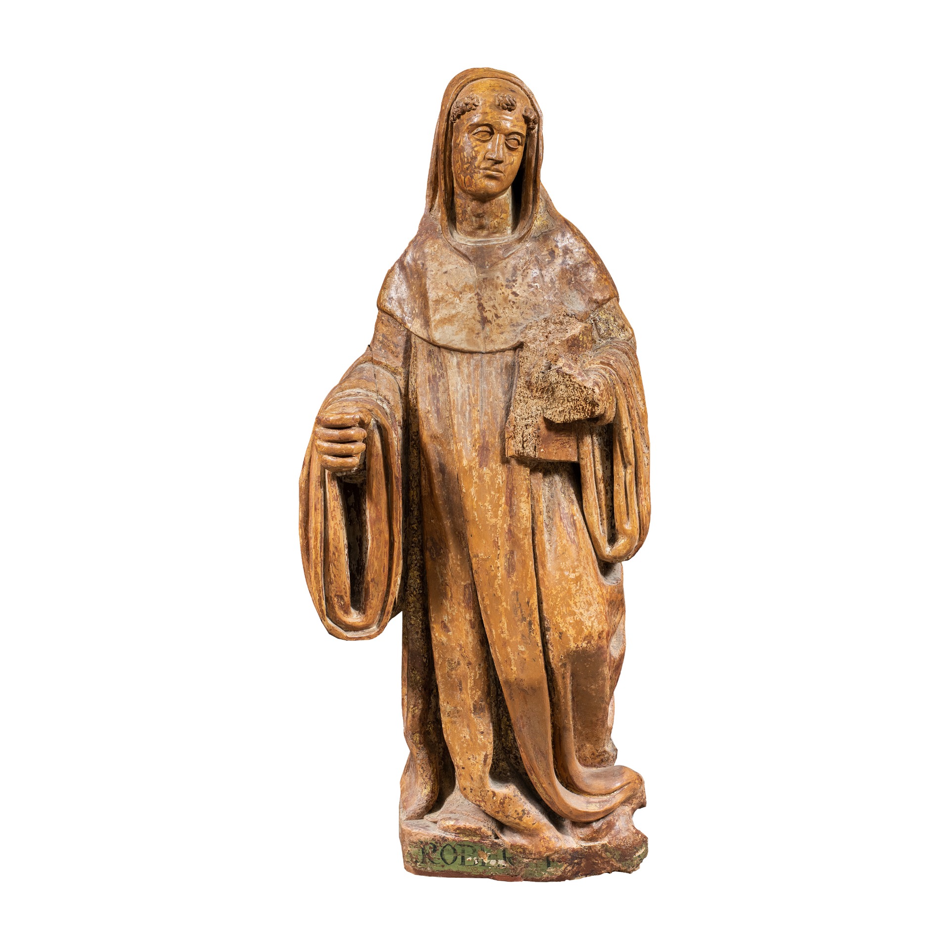 Condition report: Quasi totale perdita della superficie policroma e della dorata. Struttura in buone condizioni, con tracce di invecchiamento, usura ed alcune mancanze.