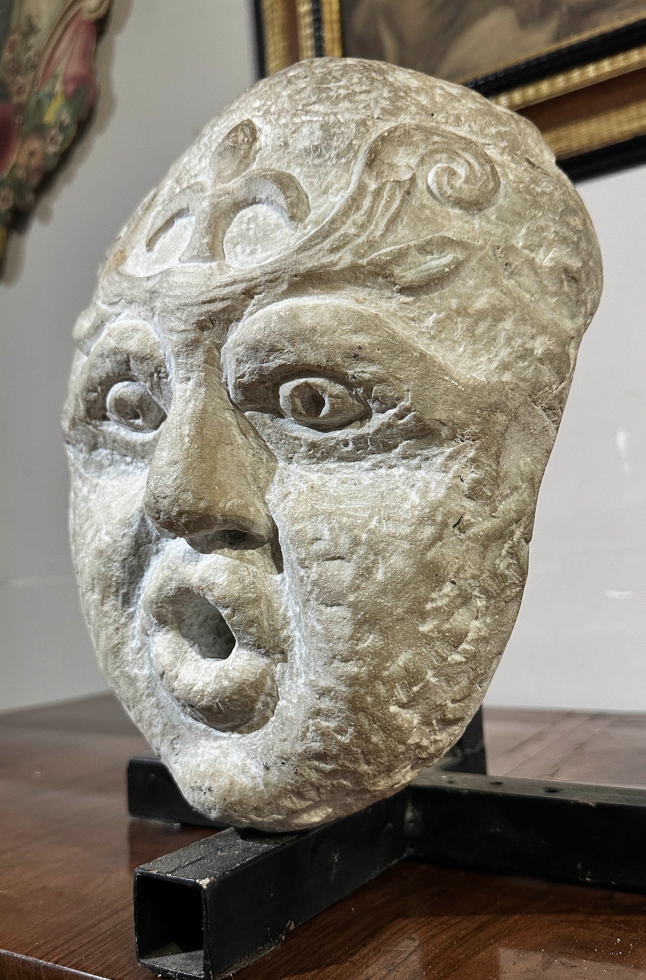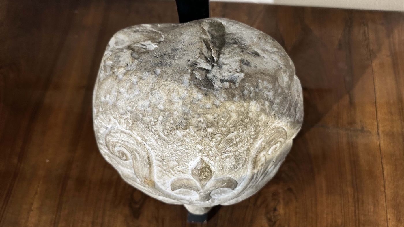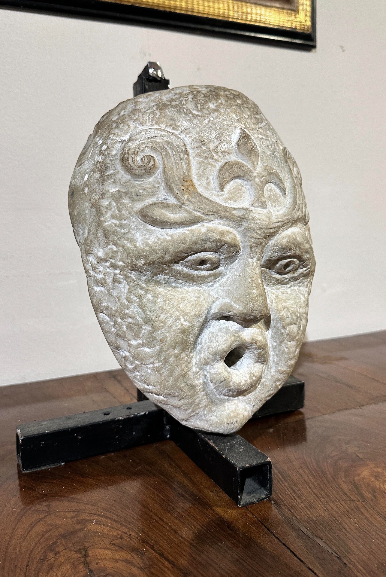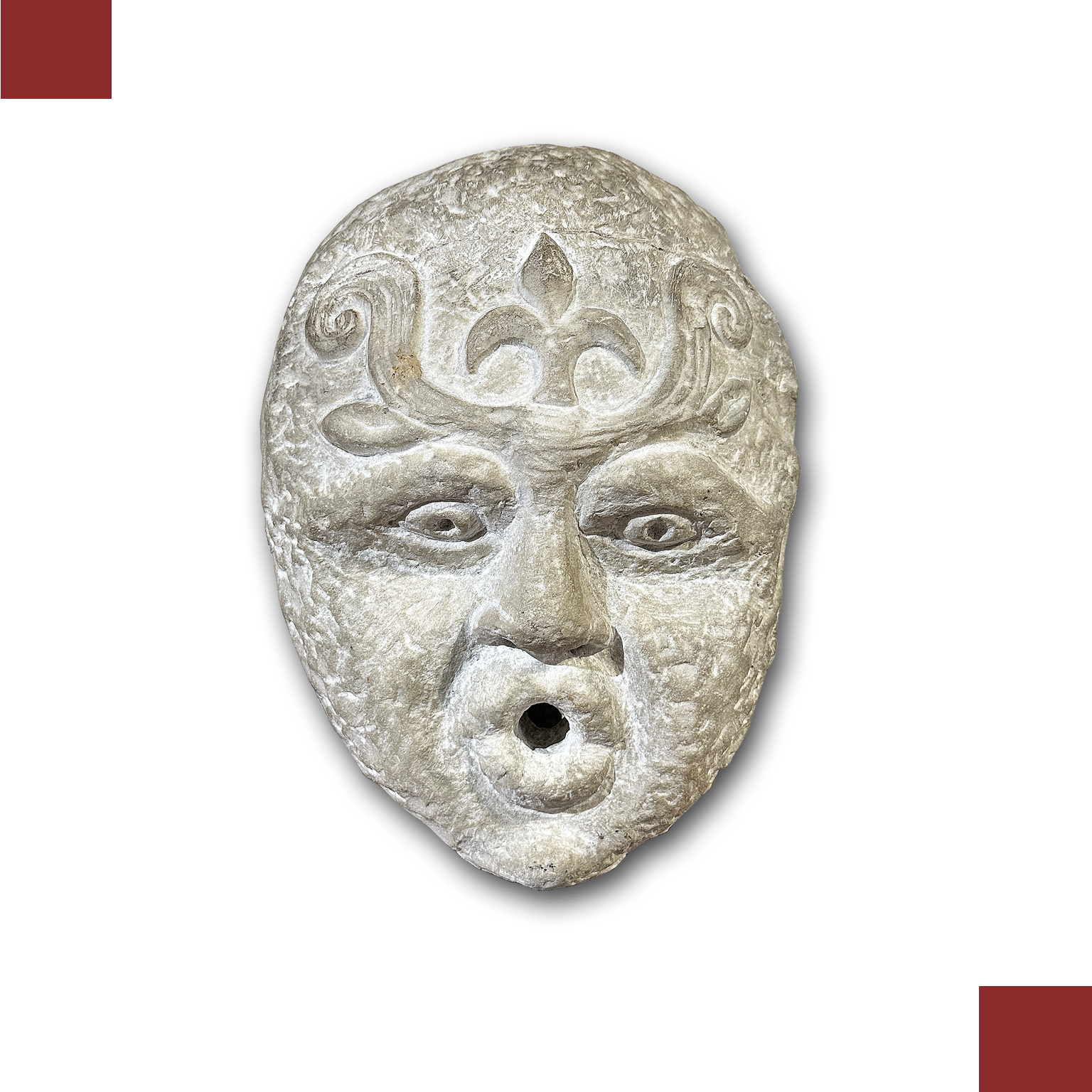 Unica e preziosa scultura in marmo bianco scolpito, raffigurante probabilmente Eolo, il dio del vento. La scultura nasce come mascherone da fontana, come evidente dall'apertura sulla bocca destinata alla fuoriuscita dell'acqua. Il retro è più levigato, mentre il fronte presenta occhi e naso ben delineati; le sopracciglia assumono la forma di giochi ad ali, e la testa si completa con al centro, sulla fronte, un giglio che impreziosisce ulteriormente la decorazione. Proveniente da una dimora fiorentina, questa scultura rappresenta un oggetto di grande antichità e gusto, in grado di arricchire con un tocco di storia ed eleganza qualsiasi ambiente. Manifattura toscana di ispirazione classica, del XVI secolo.