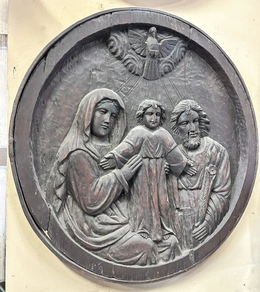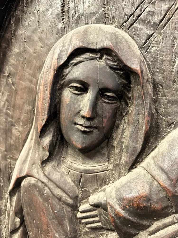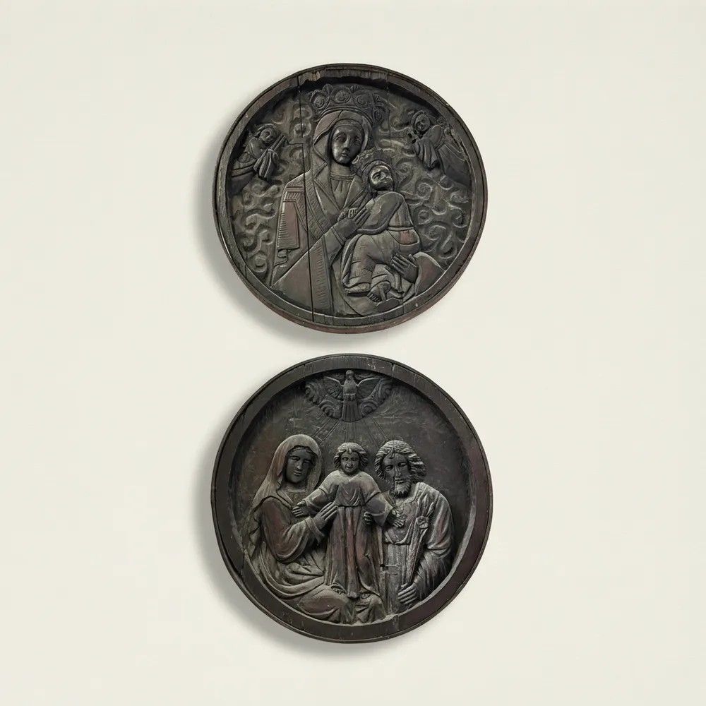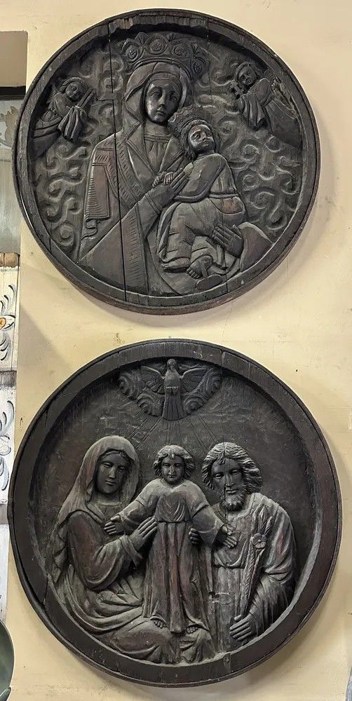 Questa coppia di bassorilievi lignei proveniente da un atelier toscano della metà del XVII secolo incarna il sentire devozionale e la raffinatezza plastica del barocco italiano. I due tondi, ricavati da massello di legno di noce brunito, mostrano una patina antica con sottili tracce di policromia, segno della loro lunga storia.Il primo presenta la Madonna col Bambino incoronata e circondata da cherubini fra nubi turbinose; le linee fluide delle vesti si animano di pieghe vivaci, mentre lo sguardo sereno di Maria invita alla contemplazione. Il secondo raffigura la Sacra Famiglia con la Colomba dello Spirito Santo: Maria e Giuseppe sorreggono il giovane Gesù in un gesto di reciproca protezione e tenerezza.Diametro: circa 100 cm ciascunoMateriale: legno di noce scolpito a manoProvenienza: Toscana, ItaliaEpoca: XVII secolo (circa 1650)Condizione: crettature, piccole lacune e antiche fessurazioni coerenti con l’etàI bassorilievi possono essere appesi uno sopra l’altro, come in un itinerario visivo ascendente, o collocati lateralmente per dialogare con arredi d’epoca, boiserie o ambientazioni contemporanee in cerca di un accento di spiritualità.L’espressività dei volti, la resa soffusa dei panneggi e la composizione circolare – simbolo di perfezione divina – conferiscono a queste opere un forte impatto emotivo. Ideali per collezionisti, antiquari, interior designer e per tutti coloro che desiderano portare in casa un frammento di storia sacra.Pezzo unico nel suo genere: la presenza di due scene complementari permette di creare un percorso narrativo completo, dalla protezione materna alla comunione familiare, rendendo questa coppia un investimento culturale e decorativo di rara qualità.Materiale: LegnoDiametro: 101Epoca: XVII Secolo - 1600