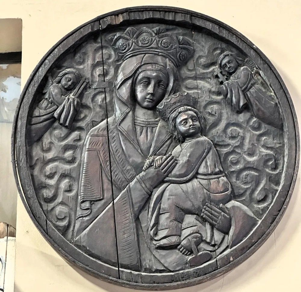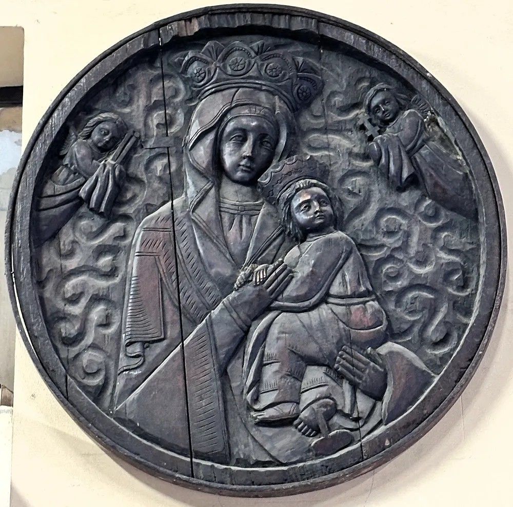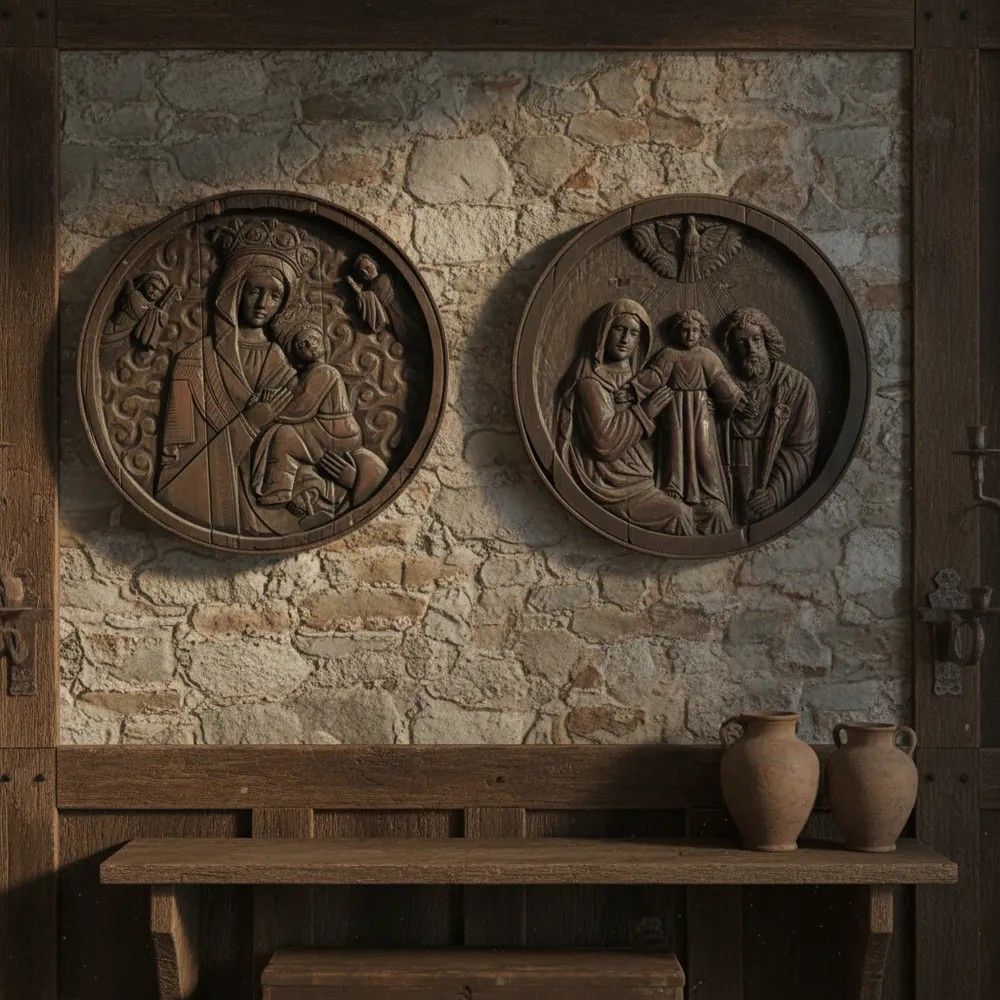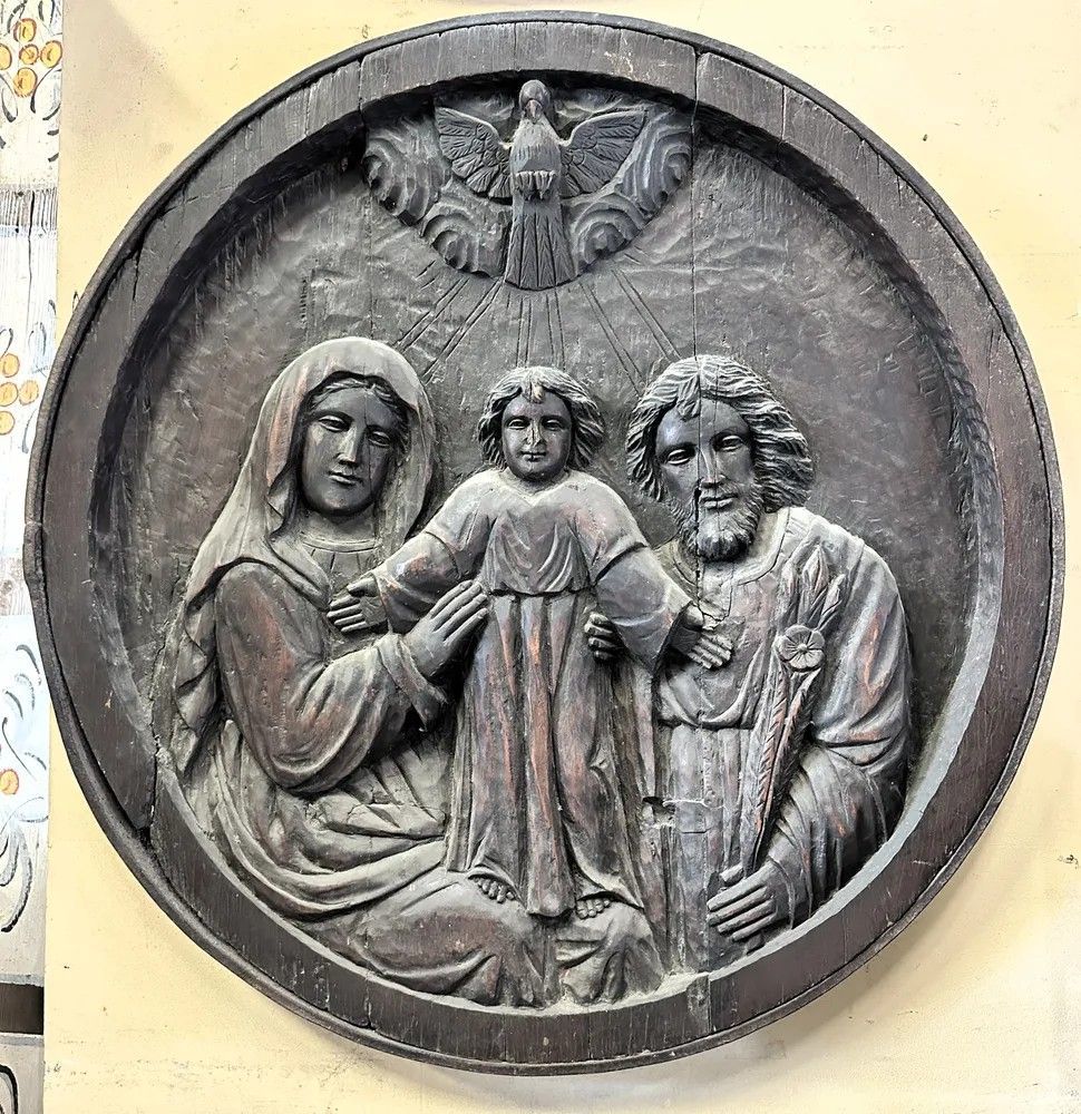 Questa coppia di bassorilievi lignei proveniente da un atelier toscano della metà del XVII secolo incarna il sentire devozionale e la raffinatezza plastica del barocco italiano. I due tondi, ricavati da massello di legno di noce brunito, mostrano una patina antica con sottili tracce di policromia, segno della loro lunga storia.Il primo presenta la Madonna col Bambino incoronata e circondata da cherubini fra nubi turbinose; le linee fluide delle vesti si animano di pieghe vivaci, mentre lo sguardo sereno di Maria invita alla contemplazione. Il secondo raffigura la Sacra Famiglia con la Colomba dello Spirito Santo: Maria e Giuseppe sorreggono il giovane Gesù in un gesto di reciproca protezione e tenerezza.Diametro: circa 100 cm ciascunoMateriale: legno di noce scolpito a manoProvenienza: Toscana, ItaliaEpoca: XVII secolo (circa 1650)Condizione: crettature, piccole lacune e antiche fessurazioni coerenti con l’etàI bassorilievi possono essere appesi uno sopra l’altro, come in un itinerario visivo ascendente, o collocati lateralmente per dialogare con arredi d’epoca, boiserie o ambientazioni contemporanee in cerca di un accento di spiritualità.L’espressività dei volti, la resa soffusa dei panneggi e la composizione circolare – simbolo di perfezione divina – conferiscono a queste opere un forte impatto emotivo. Ideali per collezionisti, antiquari, interior designer e per tutti coloro che desiderano portare in casa un frammento di storia sacra.Pezzo unico nel suo genere: la presenza di due scene complementari permette di creare un percorso narrativo completo, dalla protezione materna alla comunione familiare, rendendo questa coppia un investimento culturale e decorativo di rara qualità.Materiale: LegnoDiametro: 101Epoca: XVII Secolo - 1600