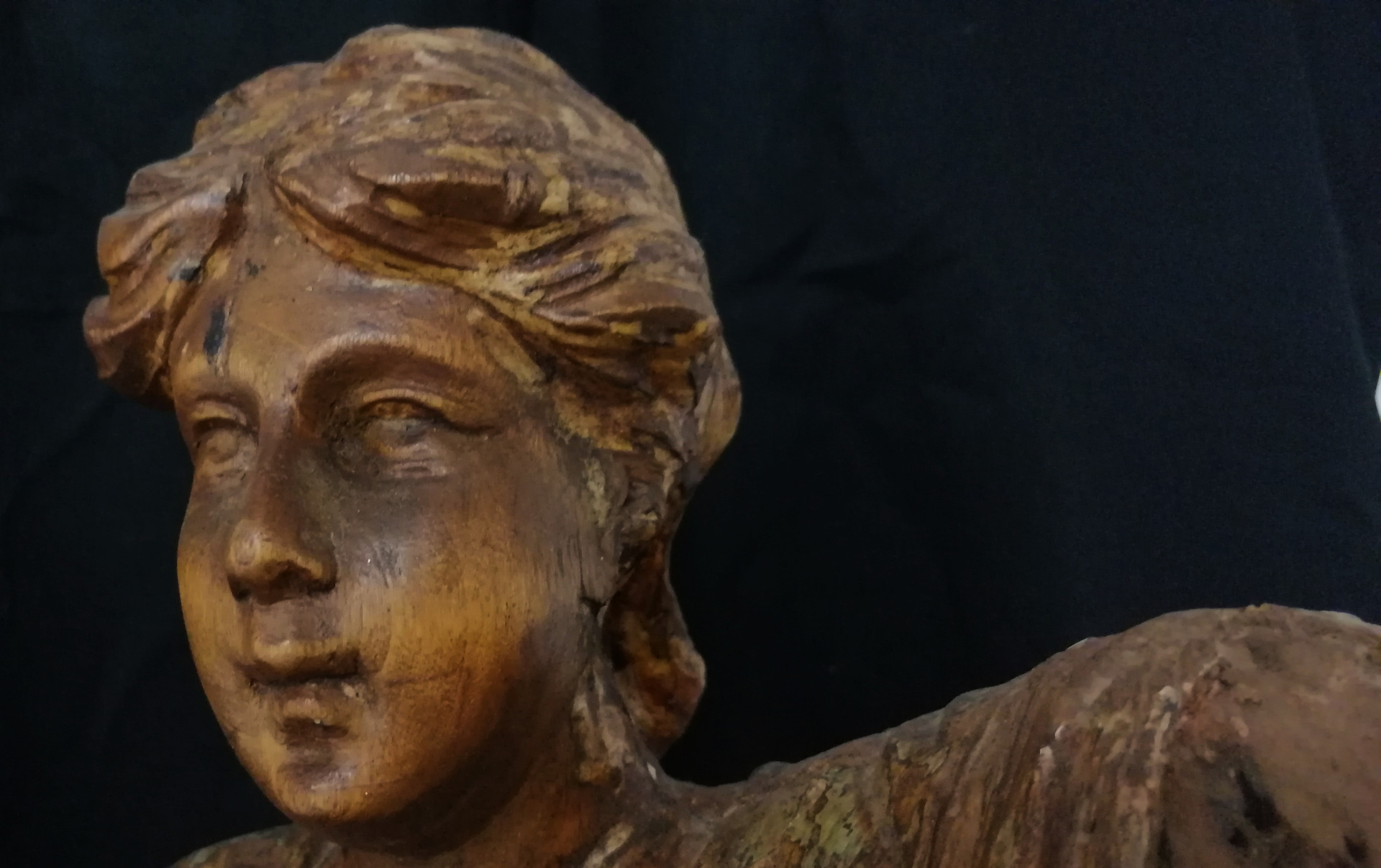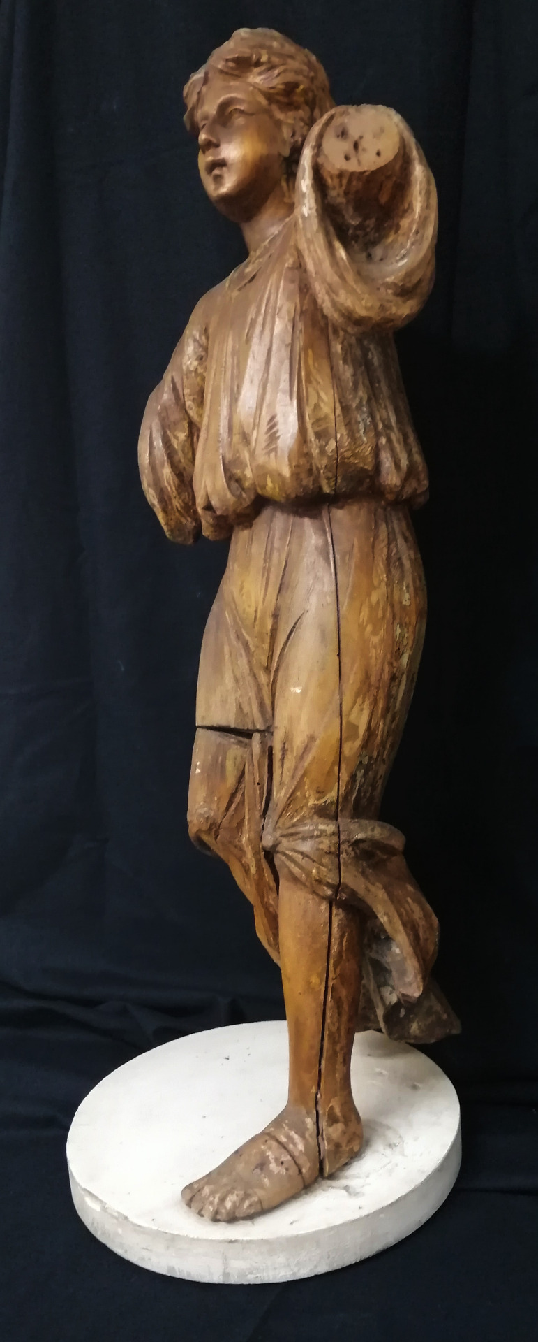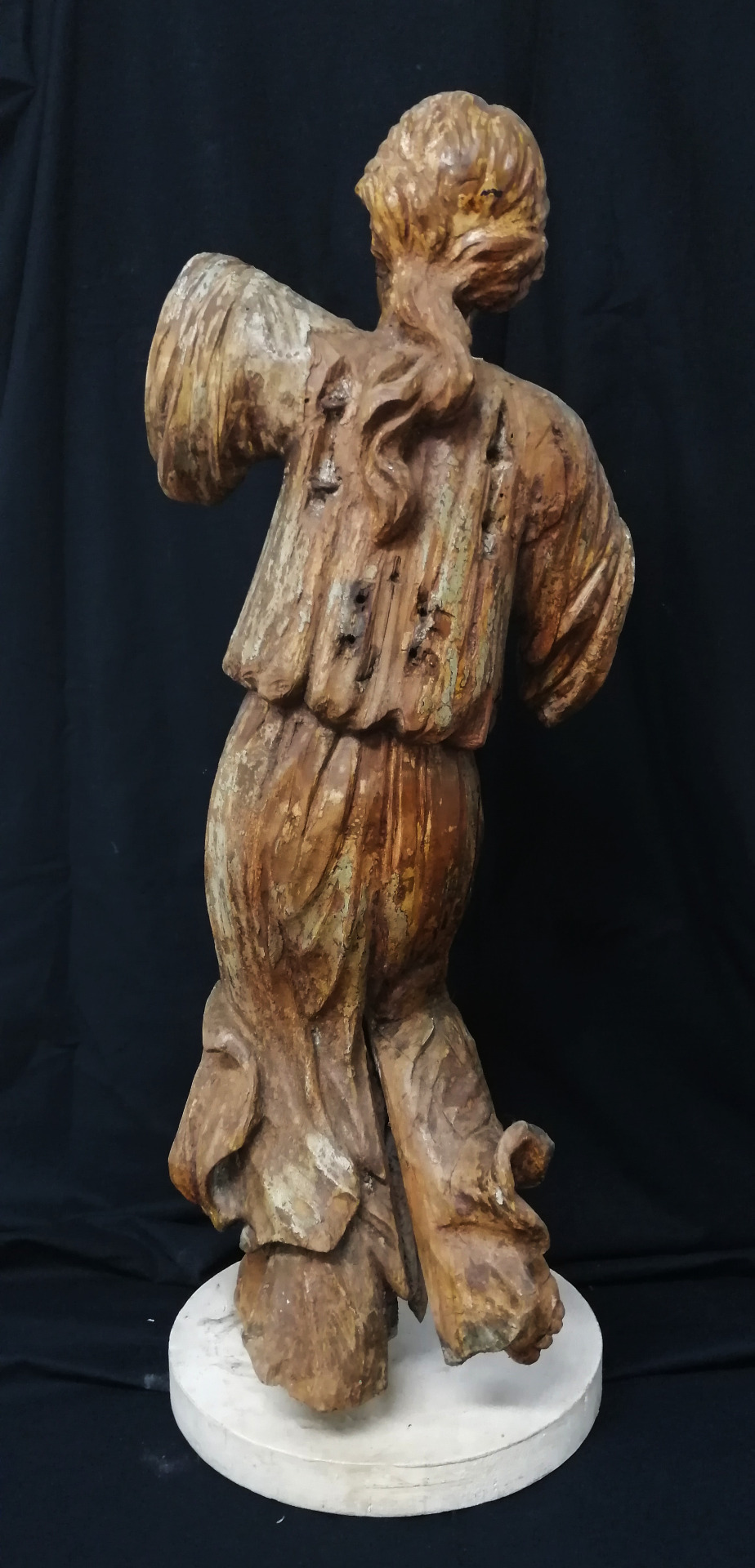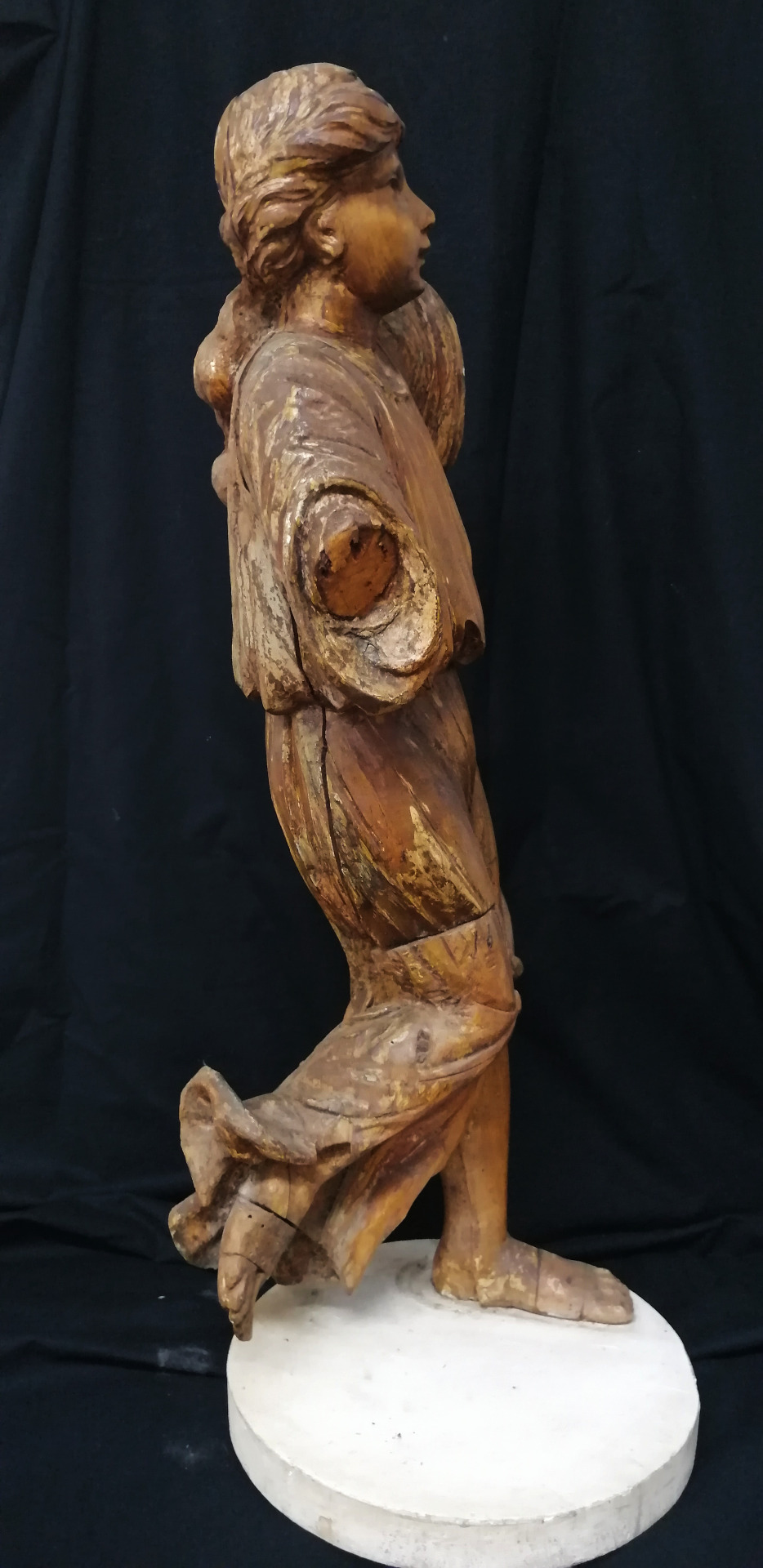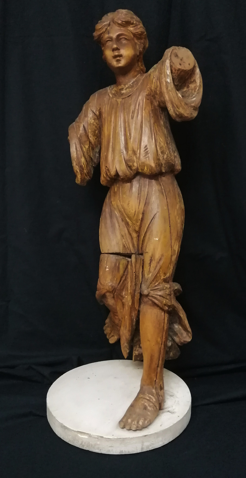 Scultura di Angelo di ambito ligure realizzata in legno di cirmolo con tracce di laccatura.