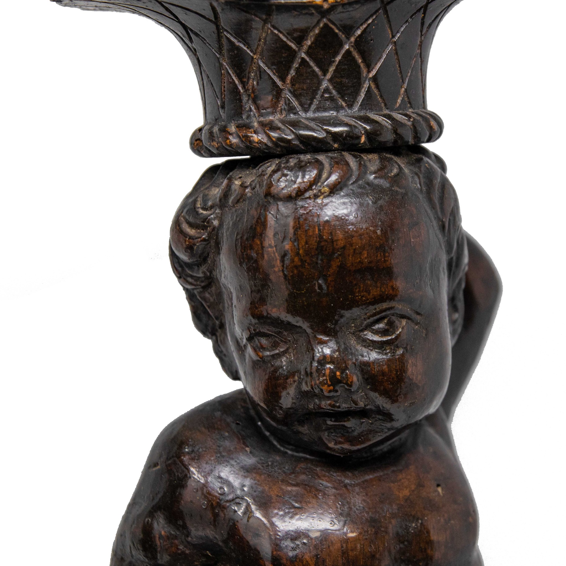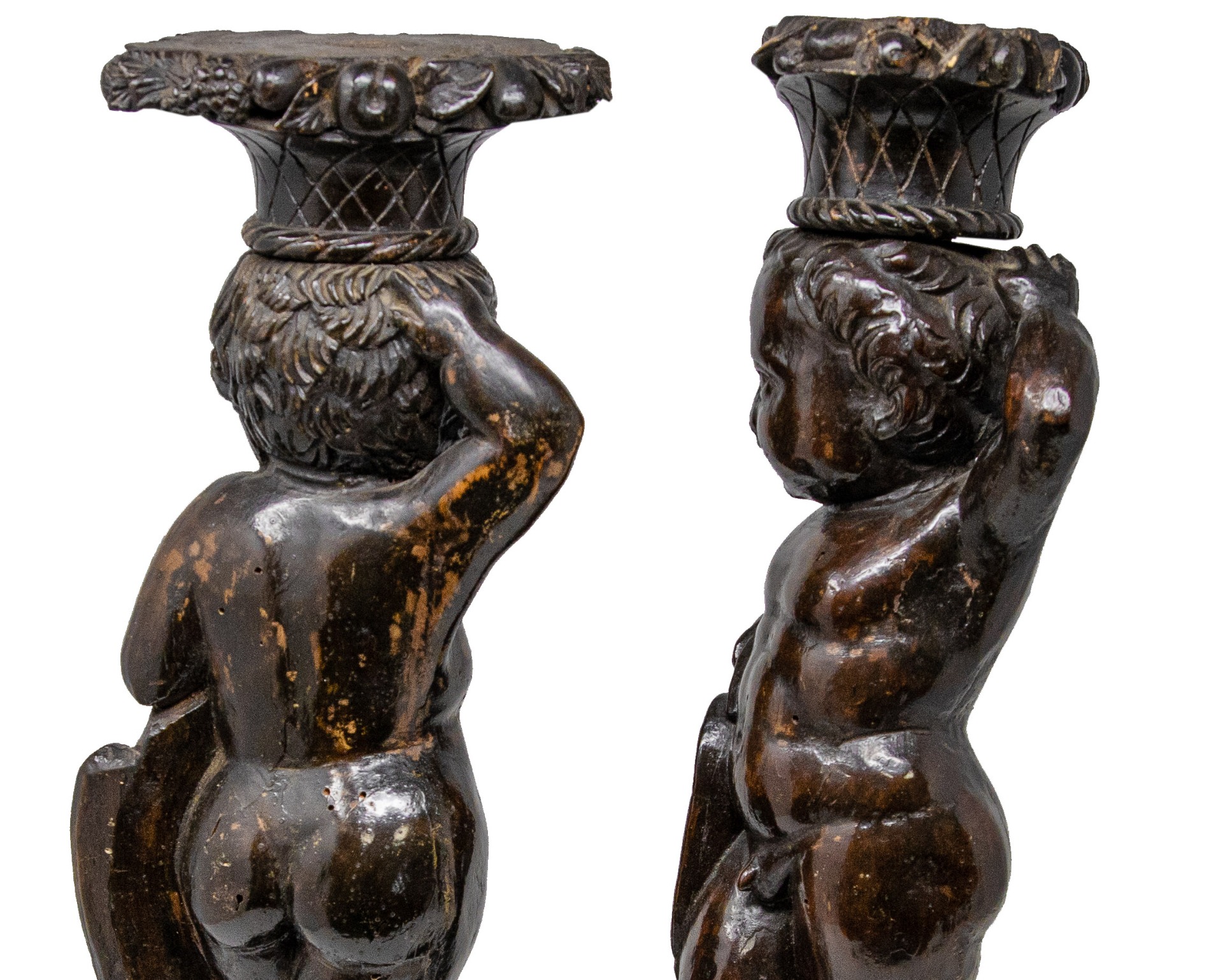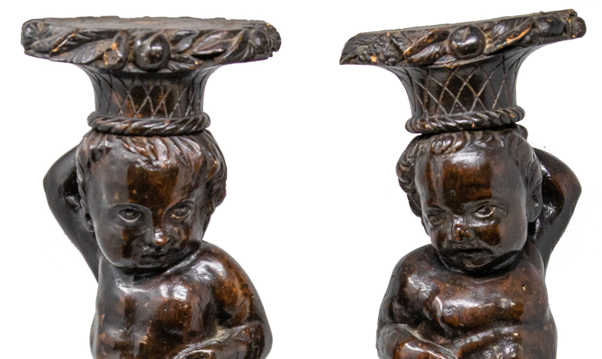 Coppia di putti finemente intagliati in legno di noce scuro: reggono stemmi araldici centrati da un leone rampante e poggiano su base rocciosa. Con movenze fluide reggono un canestro sopra il capo che funge da base per il cero. La posa speculare e serpentinata, con gli arti inferiori piegati a sorreggere lo stemma, denota un senso profondo della conoscenza della statuaria e il raggiungimento di un naturalismo reale e veritiero.