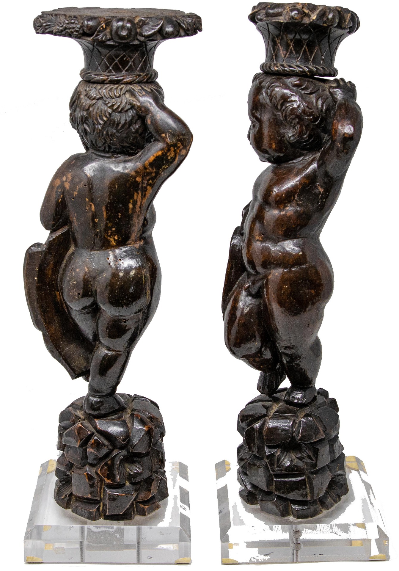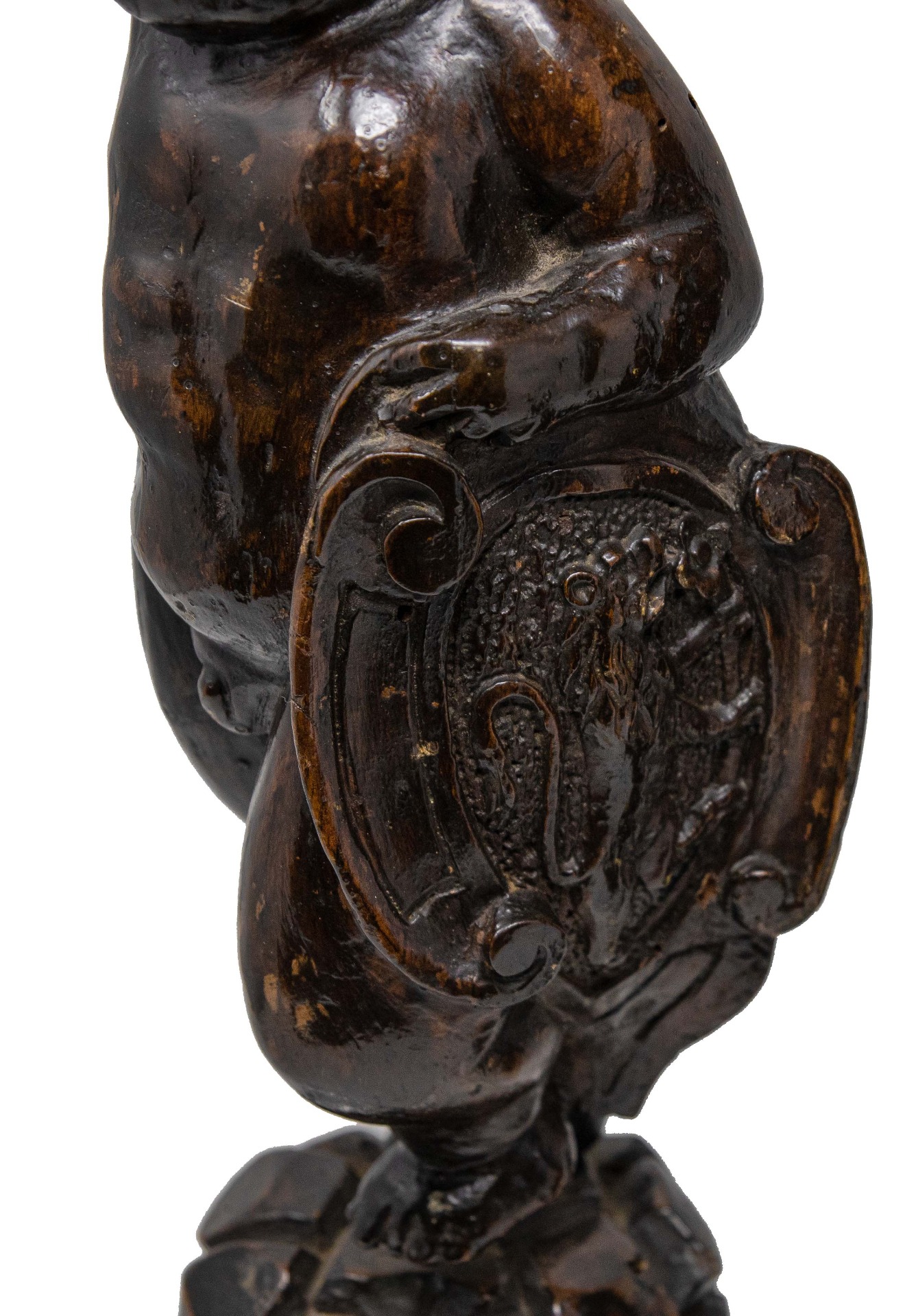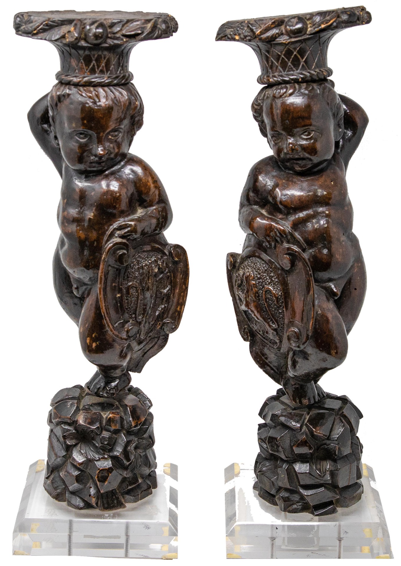 Coppia di putti finemente intagliati in legno di noce scuro: reggono stemmi araldici centrati da un leone rampante e poggiano su base rocciosa. Con movenze fluide reggono un canestro sopra il capo che funge da base per il cero. La posa speculare e serpentinata, con gli arti inferiori piegati a sorreggere lo stemma, denota un senso profondo della conoscenza della statuaria e il raggiungimento di un naturalismo reale e veritiero.