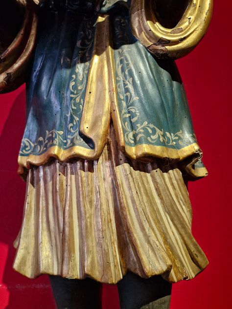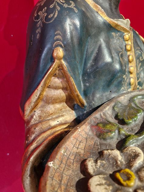 Nella Venezia del XVIII secolo, il "Moro" era spesso raffigurato in scultura, in particolare come servitore in abiti esotici, spesso intento a sorreggere mobili, candelabri e vassoi. Queste sculture, realizzate in materiali come il legno laccato o l'ebano, erano molto apprezzate per la loro eleganza e l'immagine esotica che trasmettevano all'ambiente circostante. Queste sculture, spesso realizzate in legno ebanizzato, dorato e policromo, erano particolarmente apprezzate per il loro aspetto esotico e per la capacità di aggiungere un tocco di eleganza e opulenza agli ambienti veneziani del XVIII secolo. Nel XVIII secolo, i "Mori" erano spesso raffigurati in scultura come servitori, con un'estetica esotica e lussuosa, mentre il termine "Mori" a Venezia si riferisce principalmente ai mercanti del passato e alle loro leggende. misure base 45cm scultura 103 altezza totale 148