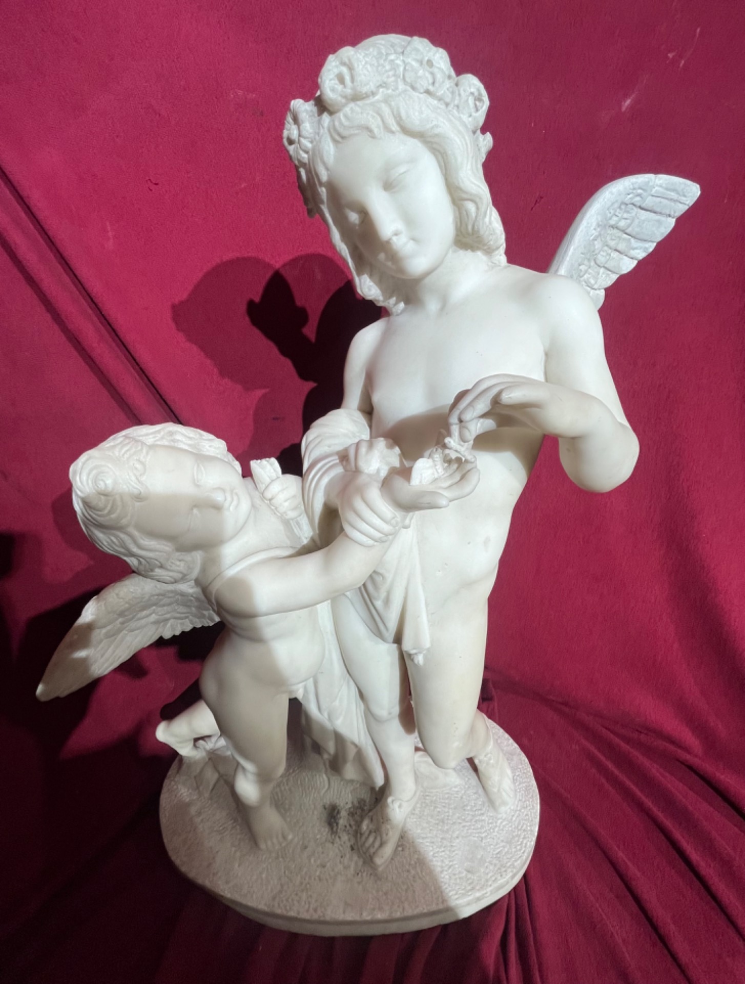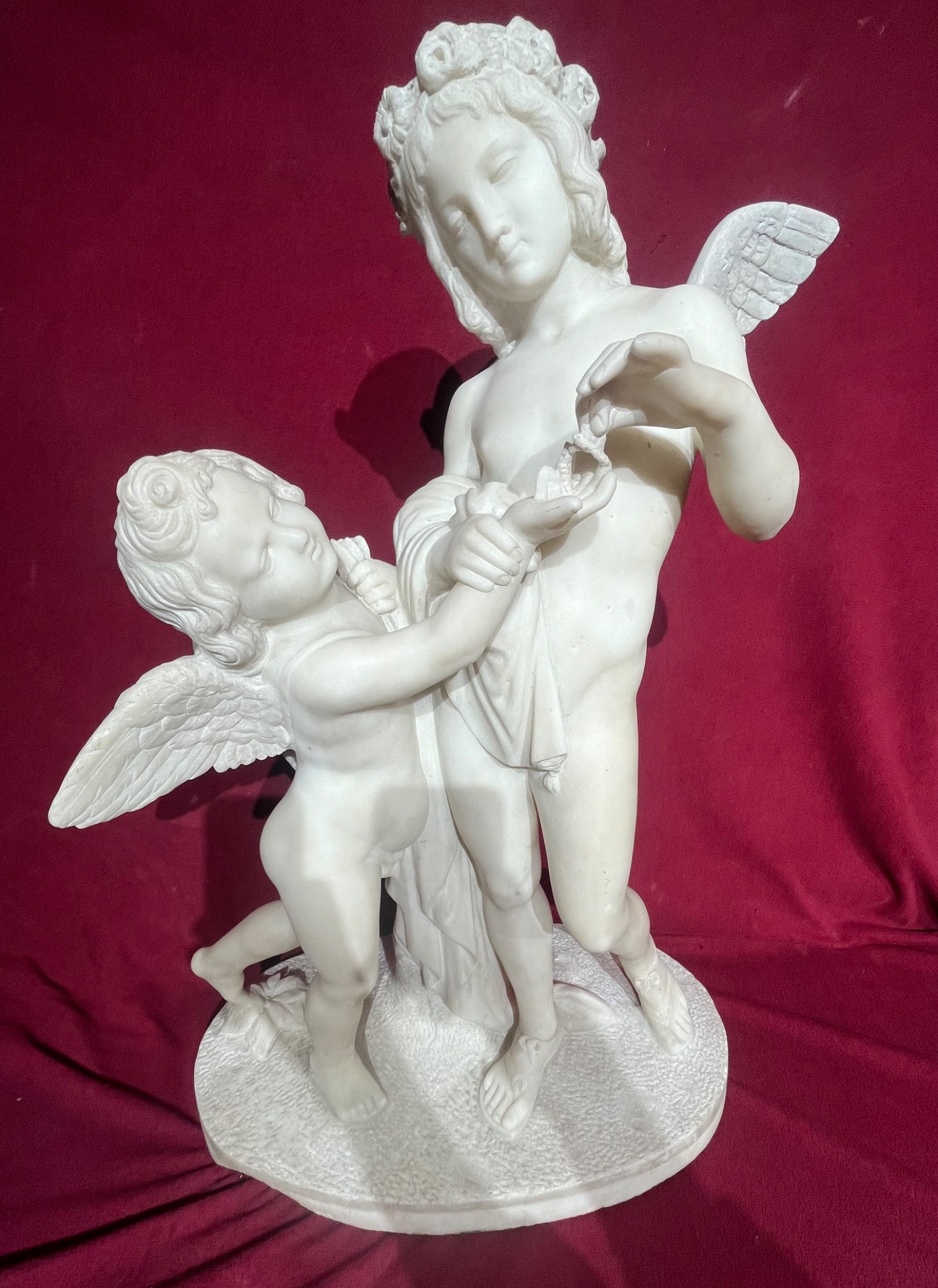 Spettacolare scultura "Psuche e Cupido " . Marmo statuario di Carrara . H. Cm 80. Corredata da certificato di autenticità in base alla legge n 1062 art 2
