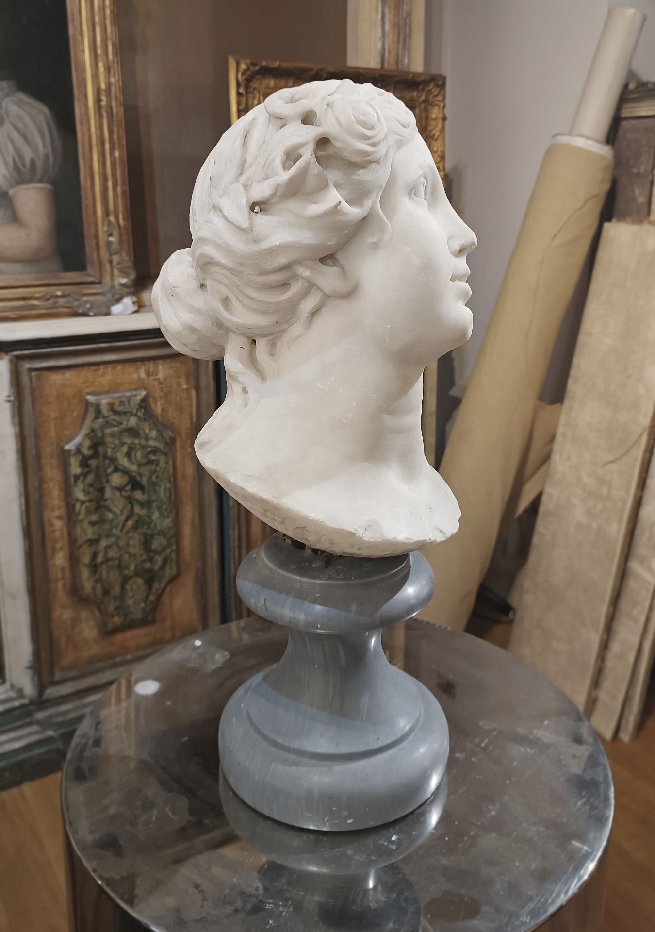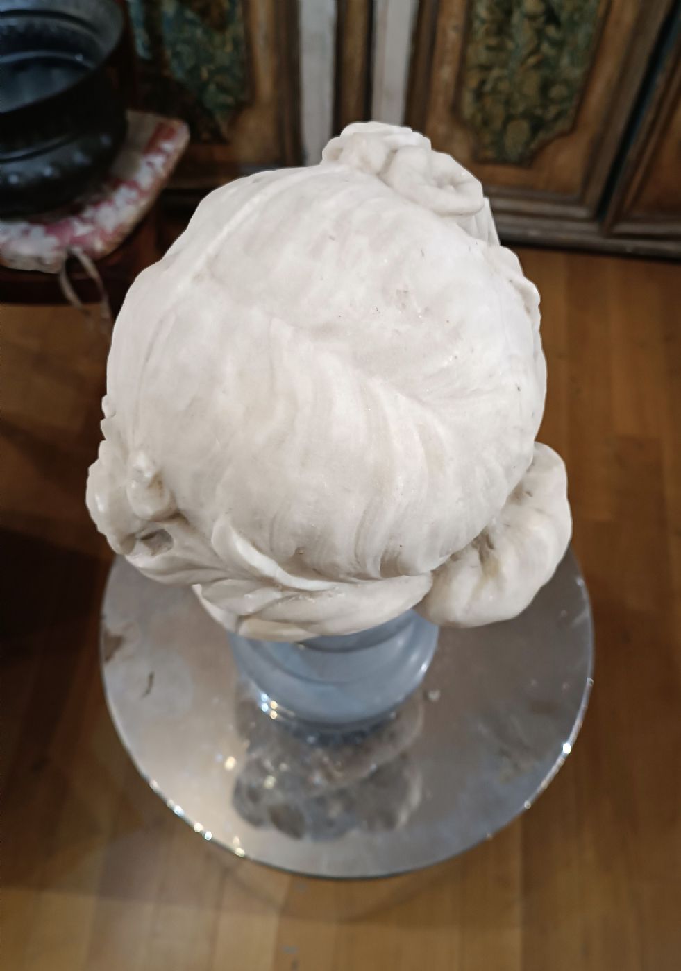 Raffinata scultura in marmo statuario di Carrara su basamento tornito in marmo grigio bardiglio. La scultura rappresenta l’allegoria della primavera, raffigurata come una donna con il viso leggermente inclinato all’indietro e capelli ricci raccolti in una crocchia. Si può apprezzare la qualità della resa stilistica e dei dettagli del viso, che conferiscono all’opera un grande gusto e classe, capace di arredare con eleganza e un tocco di antichità qualsiasi ambiente. Manifattura toscana (Toscana, Italia) del periodo neoclassico, intorno alla seconda metà del XVIII secolo.