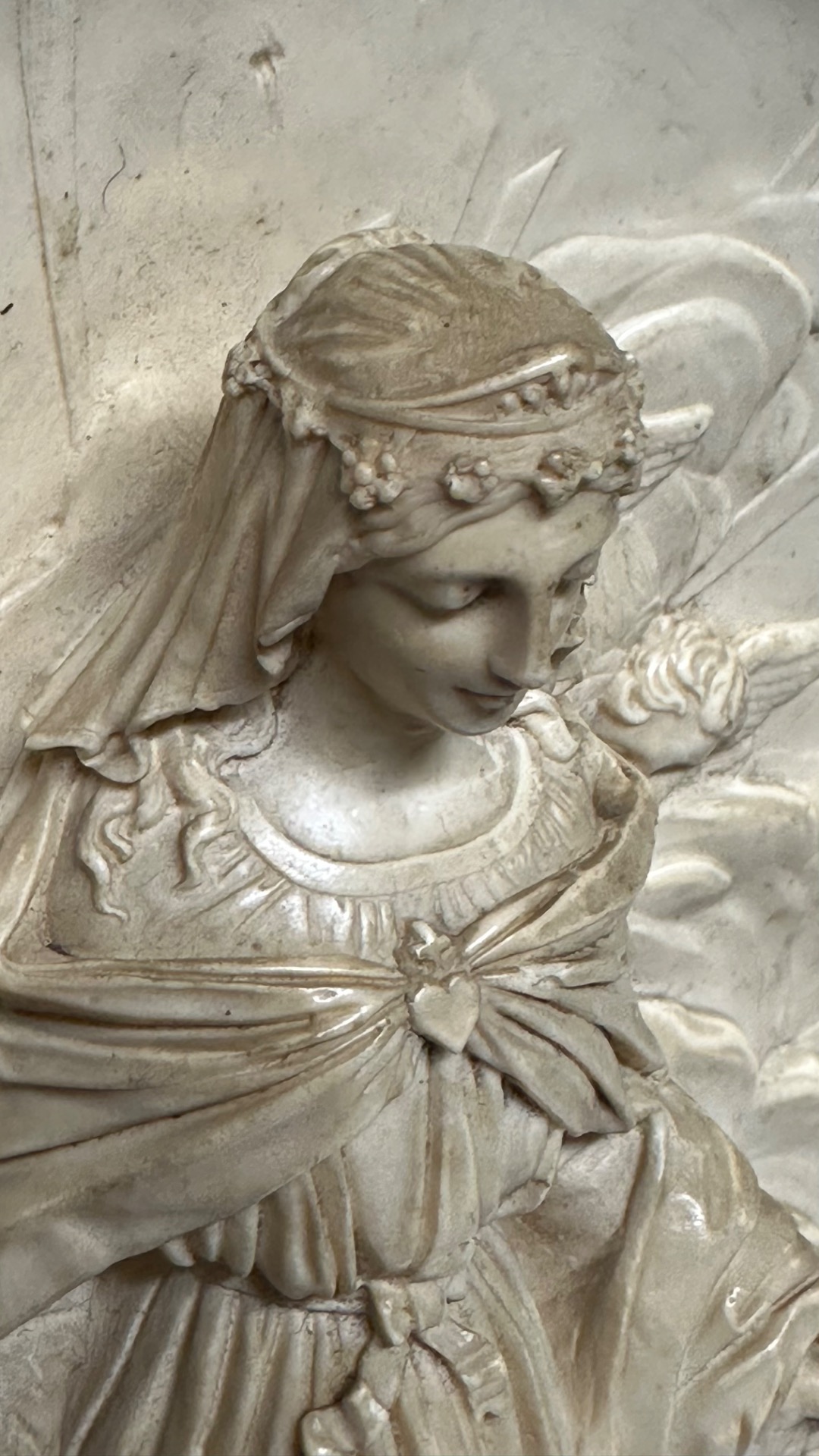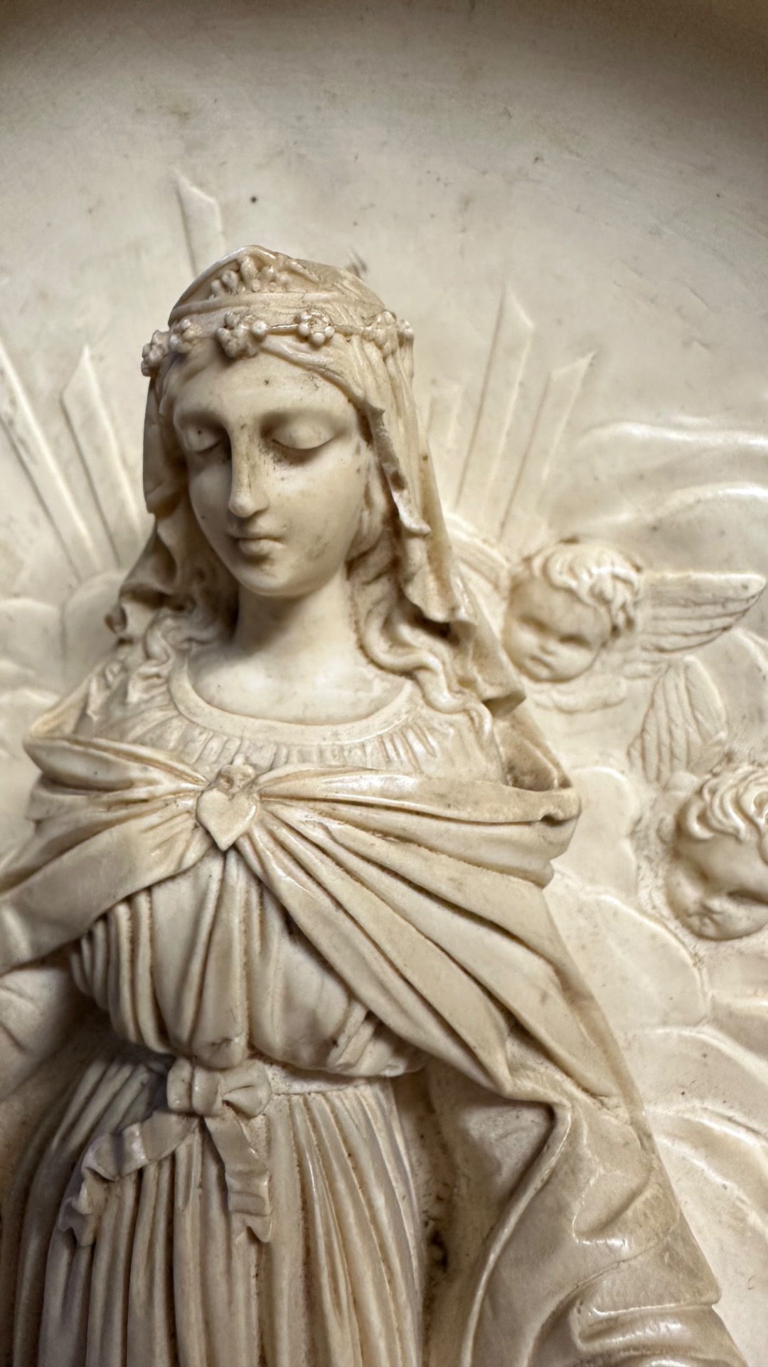 Altorilievo in schiuma di mare (silicato idrato di magnesio, calcite) - Luigi Filippo. Splendido altorilievo raffigurante la Vergine Maria circondata da angeli. Scolpita in schiuma di mare, pietra calcarea pietrificata, detta anche calcite. L'artista ha creato una matrice e poi uno stampo...