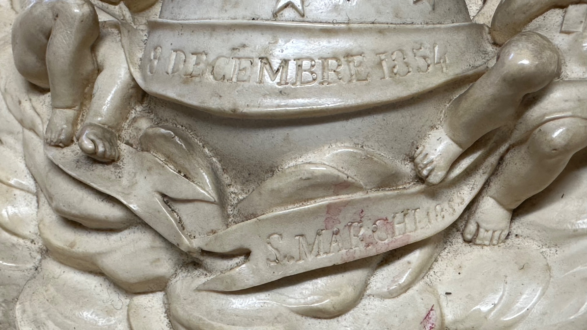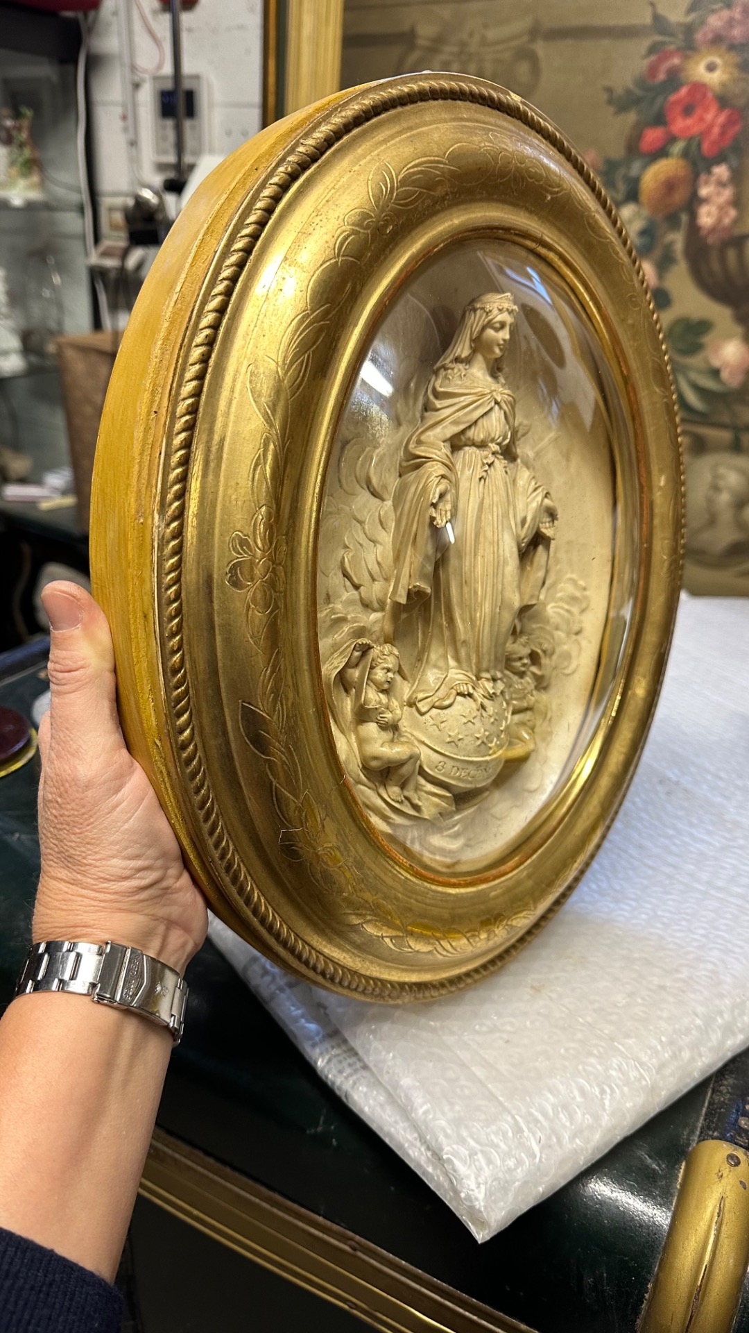 Altorilievo in schiuma di mare (silicato idrato di magnesio, calcite) - Luigi Filippo. Splendido altorilievo raffigurante la Vergine Maria circondata da angeli. Scolpita in schiuma di mare, pietra calcarea pietrificata, detta anche calcite. L'artista ha creato una matrice e poi uno stampo negativo. Lo stampo è stato posto sotto l'acqua pietrificante ricca di carbonato di calcio (stalattite) , che lo ha ricoperto interamente di calcare, tolto dallo stampo è stato tolto l’eccesso di calcare. La lavorazione è precisa, con dettagli ben definiti che conferiscono profondità e movimento alla scena. Lo stato di conservazione è perfetto, ha una patina bellissima. Si trova all'interno di un’elegante cornice ovale in legno dorato a foglia oro e sotto il suo vetro a cupola originale, la scultura è straordinariamente realistica e di squisita fattura. È datata 8 dicembre 1854 e firmata "S. Marchi. 1855". Dimensioni: con cornice cm. 38 x 32 - schiuma 29,5 x 22 Epoca: Luigi Filippo Oggetto corredato da certificato d'autenticità. Questo articolo, come tutti i nostri oggetti, viene venduto accompagnato da certificato fotografico di autenticità e lecita provenienza. Tale documento identifica l'oggetto aggiungendo più valore all'articolo. Ci occupiamo del trasporto e organizziamo personalmente l'imballaggio e la spedizione delle opere d'arte in tutto il mondo. ???? Antichità DELMONTE ???? https://www.instagram.com/delmonteantichita/ CONTATTI: PER QUALSIASI INFORMAZIONE AGGIUNTIVA NON ESITATE A CONTATTARMI! Cell. Anna 338 4989679 EMAIL: annadelmonteantico@libero.it