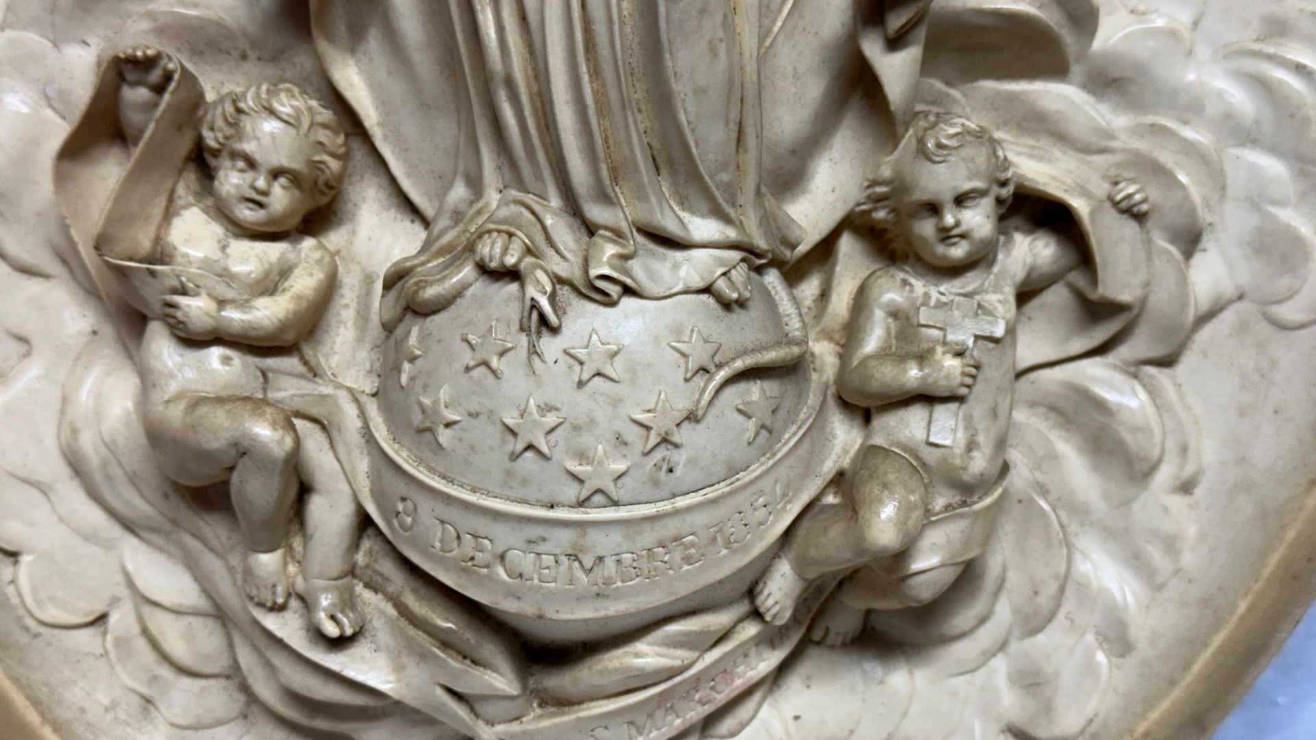 Splendido altorilievo raffigurante la Vergine Maria circondata da angeli. Scolpita in schiuma di mare, pietra calcarea pietrificata, detta anche calcite.