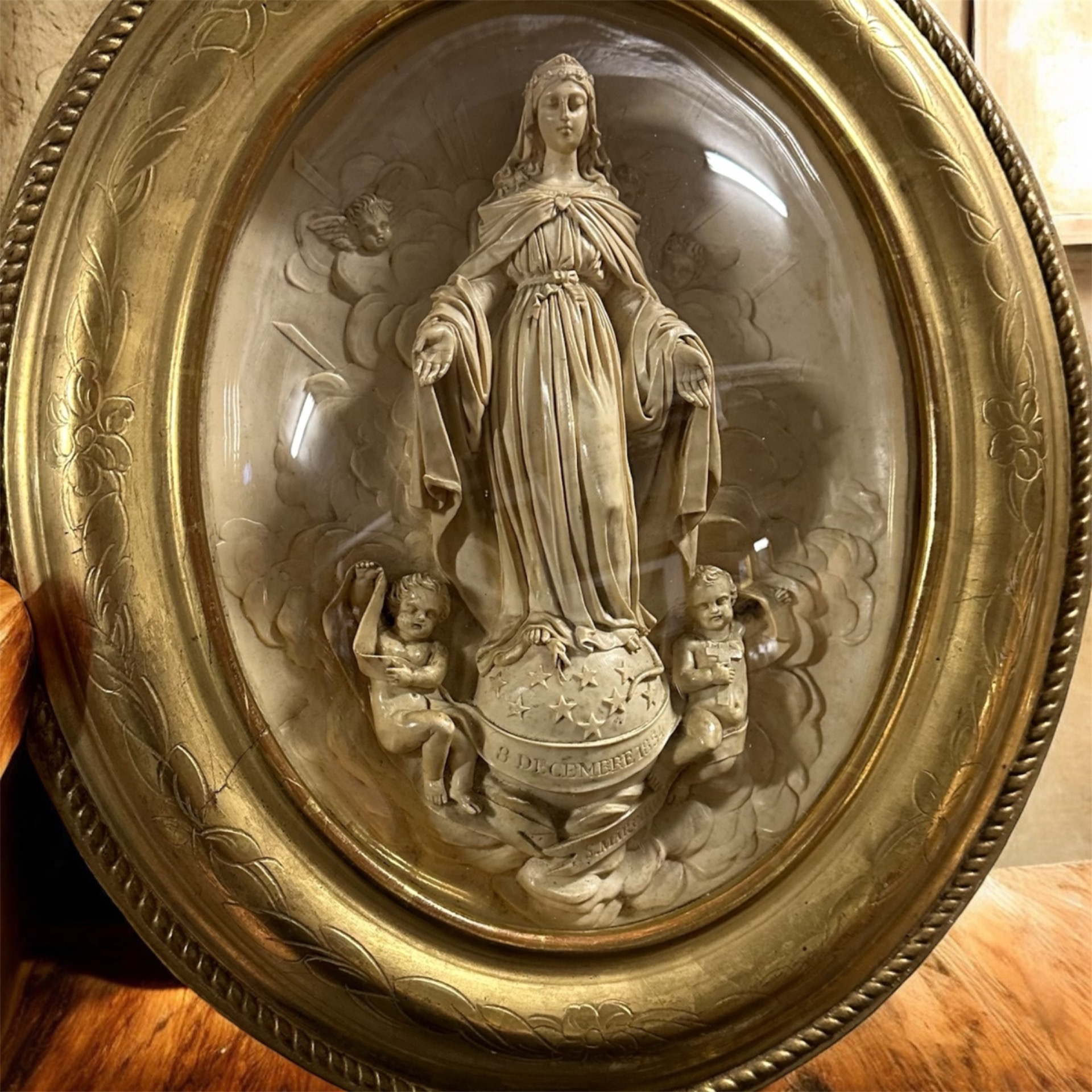 Si trova all'interno di un’elegante cornice ovale in legno dorato a foglia oro e sotto il suo vetro a cupola originale, la scultura è straordinariamente realistica e di squisita fattura.