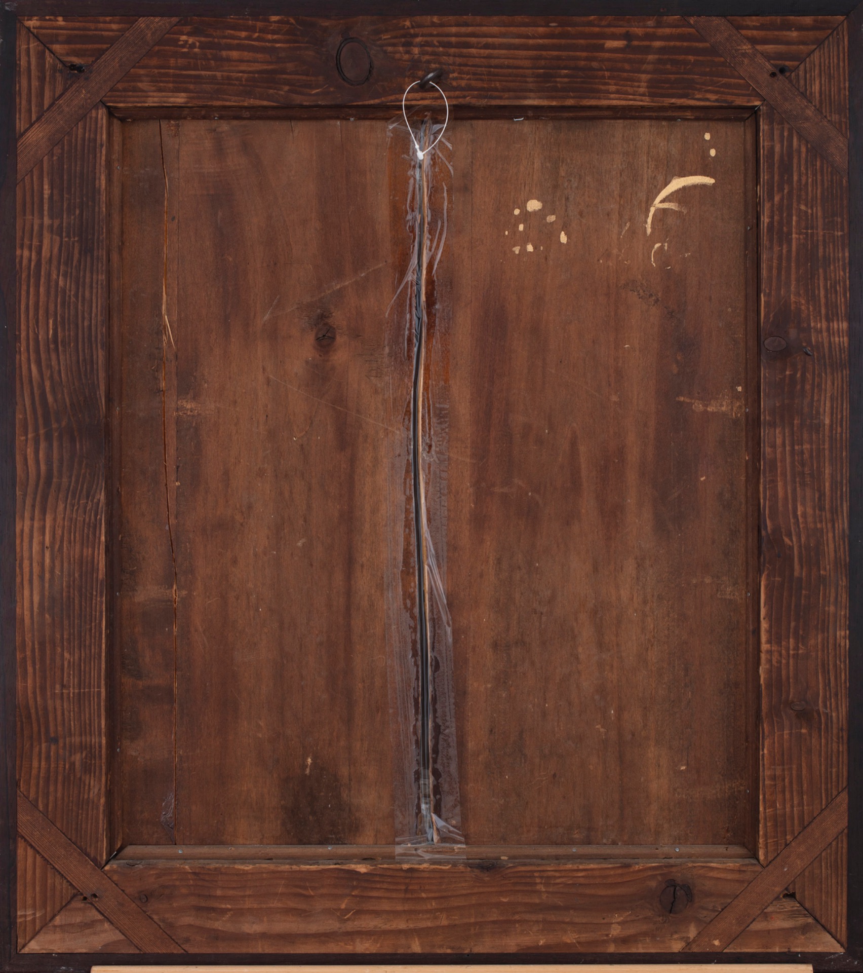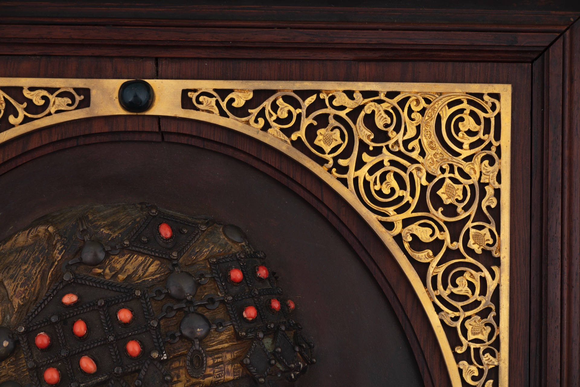Bronzo dorato e patinato, smalti e cornice lignea, 66x60 cm.