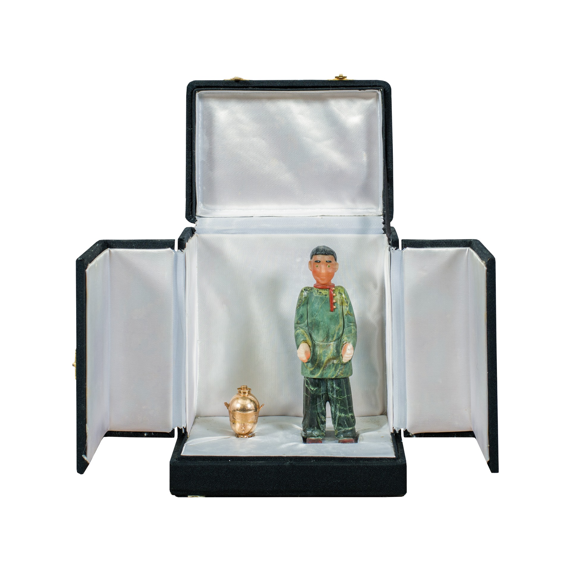 Realizzata interamente in marmi diversi e pietre dure. Raffigurante una figura di giovane ragazzo reggente un samovar entro cofanetto espositivo.