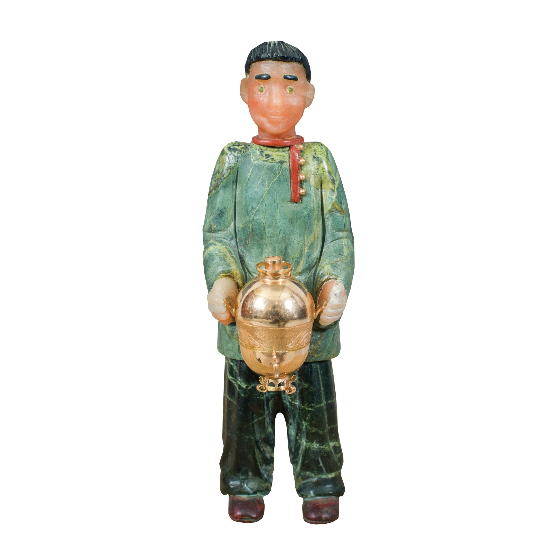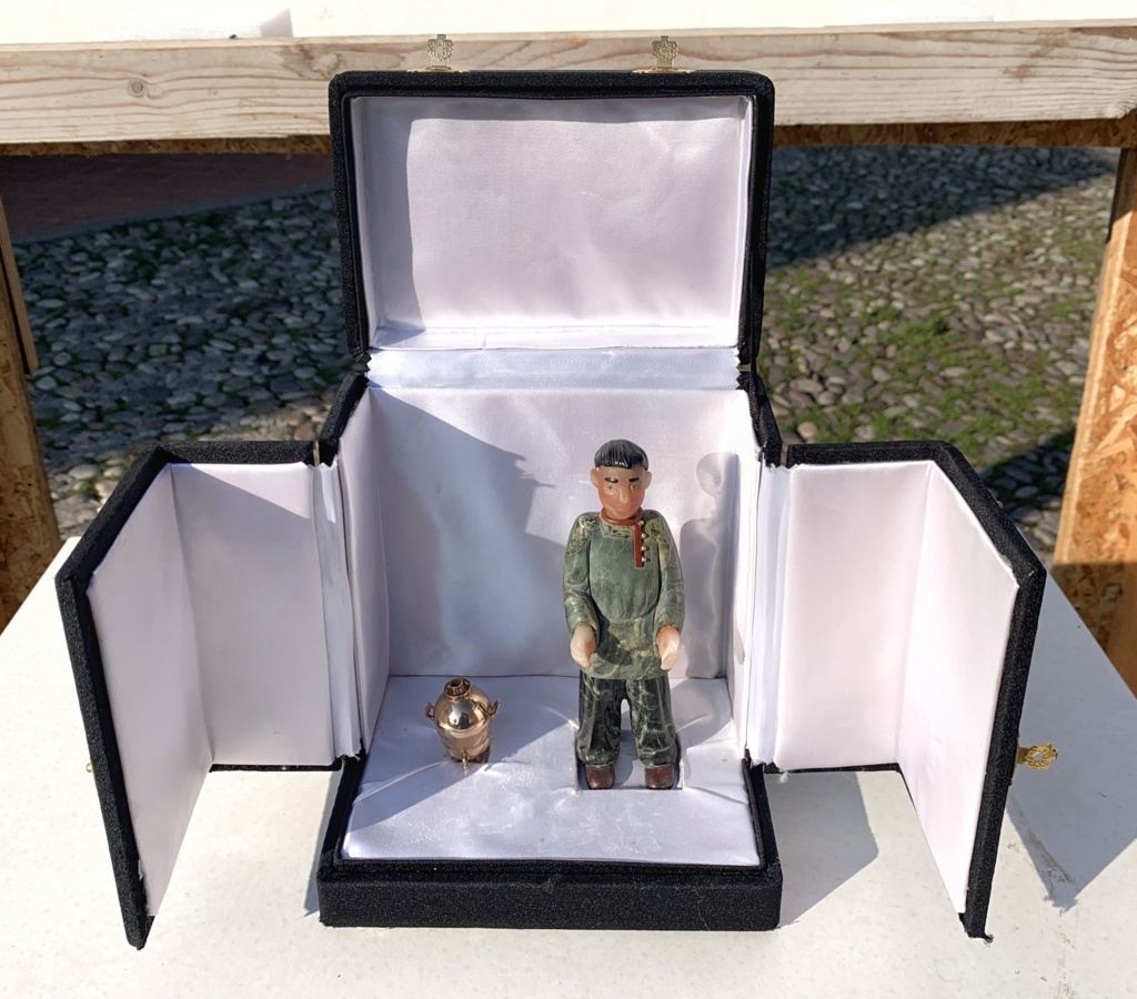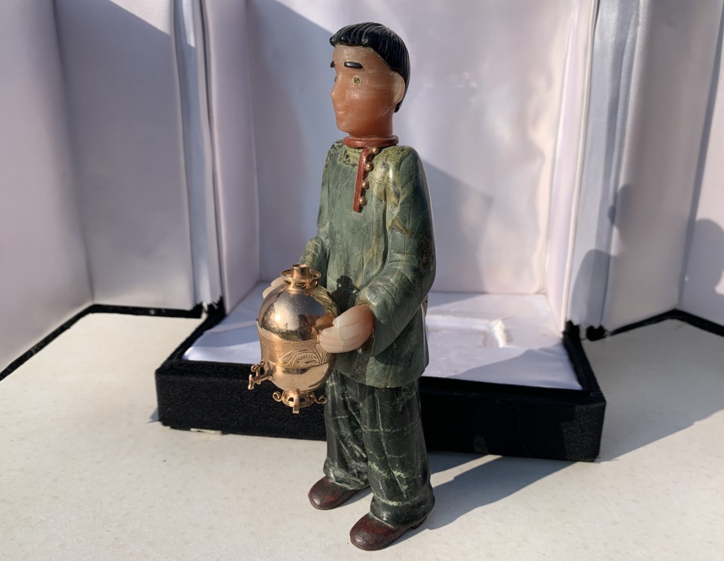 Realizzata interamente in marmi diversi e pietre dure. Raffigurante una figura di giovane ragazzo reggente un samovar entro cofanetto espositivo.