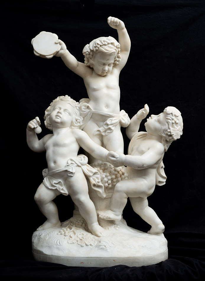 Descrizione: Scultura antica in marmo bianco statuario raffigurante la festa degli amorini firmata" Clodion 1738-1814" appartenente agli inizi XIX secolo. La composizione ritrae una scena movimentata con tre amorini che si contendono dei grappoli d'uva. L'atmosfera giocosa è esaltata dalle pose...
