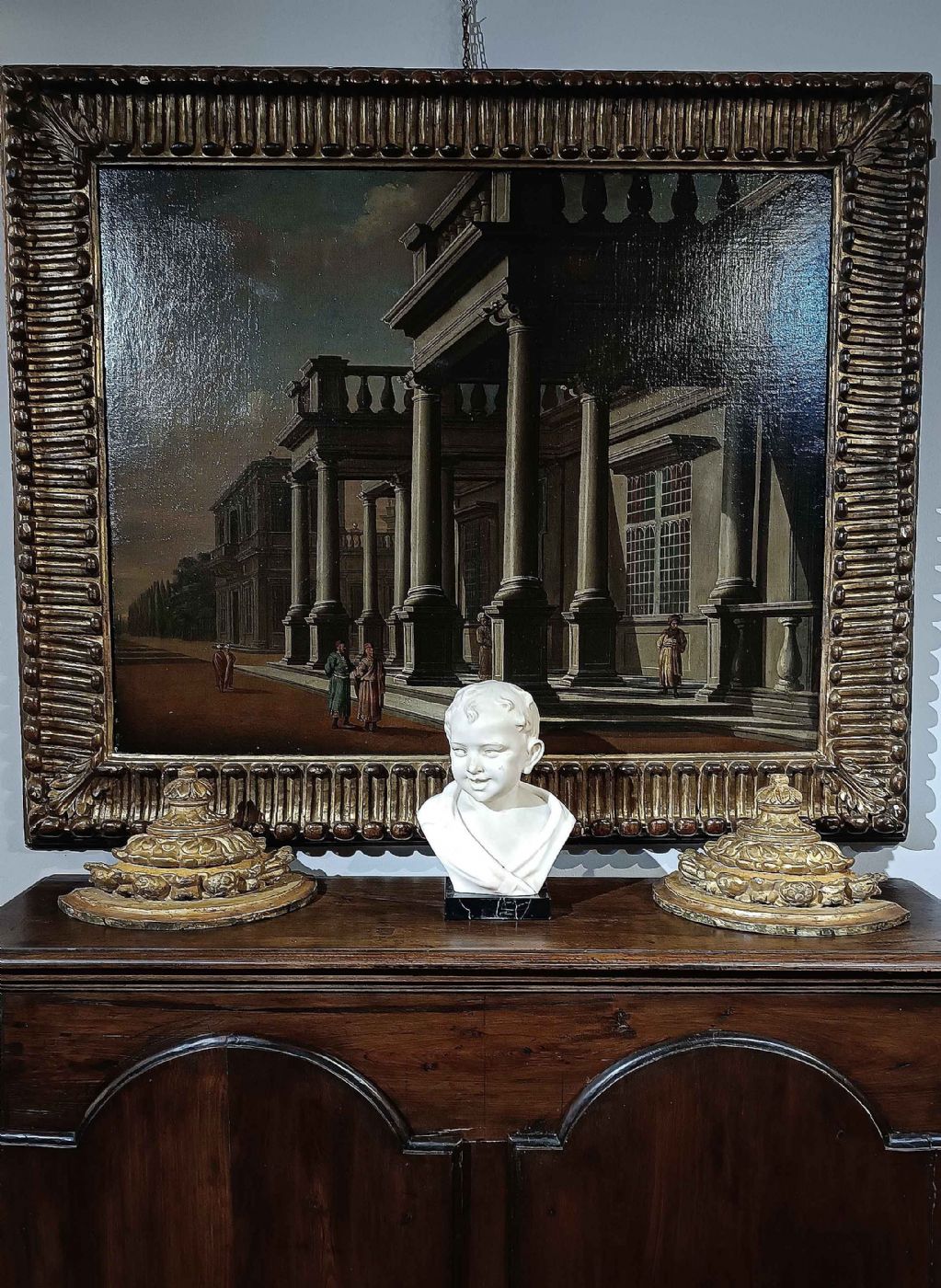 Bellissima scultura in marmo bianco, caratterizzata da poche venature grigie, montata su una base in marmo nero con piccole venature bianche. La scultura raffigura un bambino sorridente, con il volto leggermente girato e a mezzo busto, vestito con dei panni a fascia sul corpo. La particolarità risiede nella rappresentazione del volto, in cui si evidenzia la grande maestria nella resa scultorea dei dettagli, tra cui i riccioli dei capelli, gli occhi e la bocca che si apre in un sorriso. Si tratta di un'opera di grande bellezza e raffinatezza scultorea, capace di donare un tocco di eleganza e di aria antica a qualsiasi ambiente. Manifattura italiana della fine del XIX secolo, in stile neo-rinascimentale.