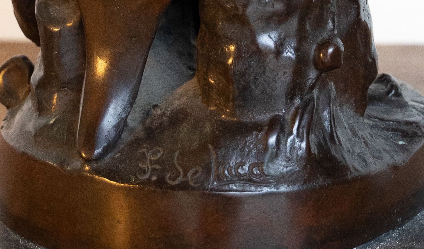 Scultura in bronzo di nudo maschile con bambino – Ferdinando De Luca, Napoli, fine XIX secolo Epoca: Fine Ottocento Provenienza: Napoli, Italia Tecnica: Bronzo fuso e cesellato Dimensioni: Altezza 60 cm; diametro della base 25 cm Descrizione: Magnifica scultura in bronzo firmata “F. De...