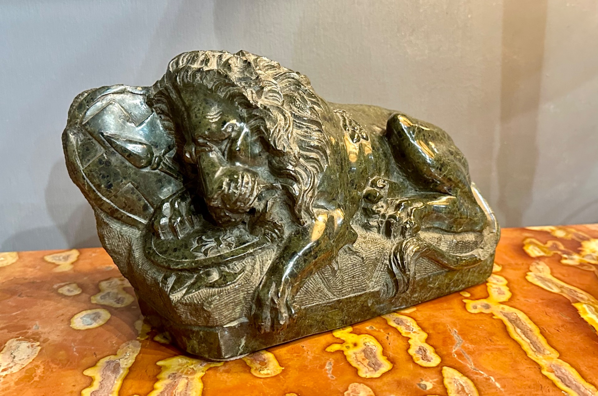 Da Bertel Thorvaldsen: un leone di Lucerna in marmo serpentino finemente scolpito. Nel 1818-1819, il famoso scultore danese Bertel Thorvaldsen (1770-1844) realizzò un modello per un monumento alle Guardie Svizzere che avevano combattuto a Parigi in difesa di Re Luigi XVI durante la presa delle Tuileries da parte delle forze rivoluzionarie il 10 agosto 1792.
