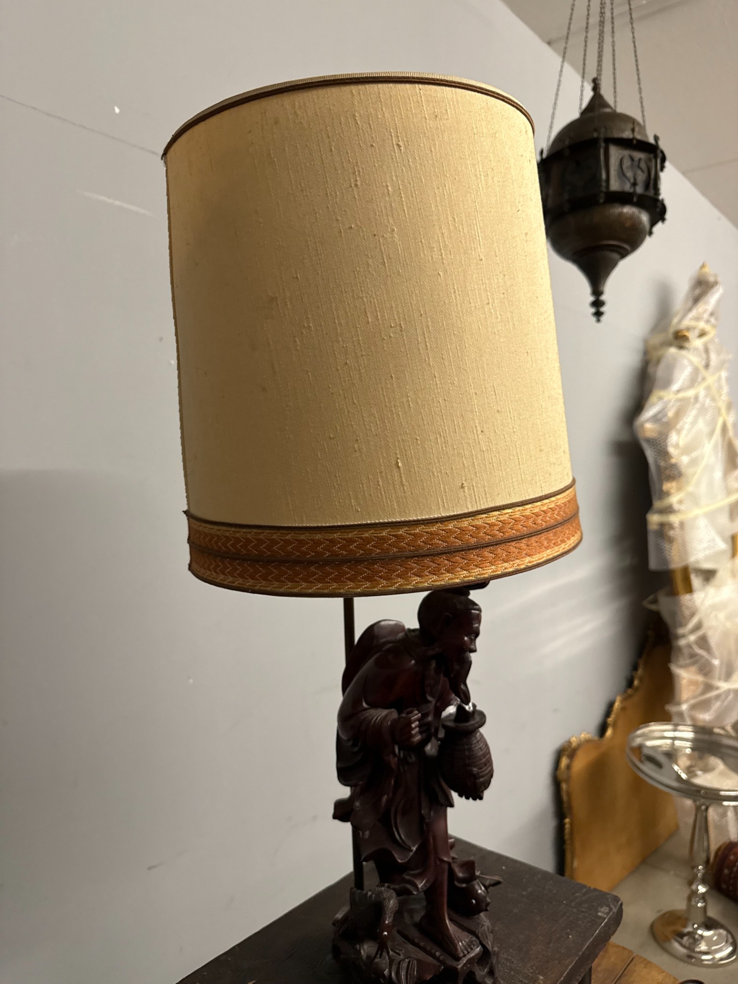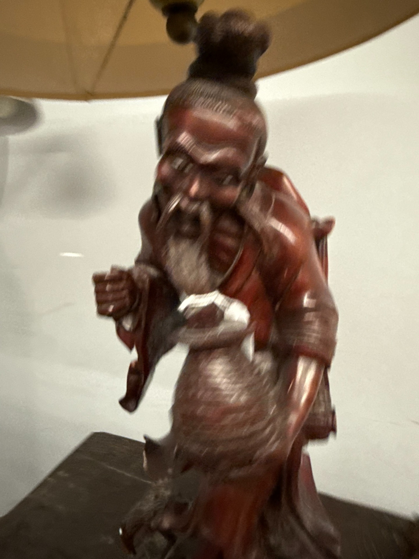Antica scultura a lampada in legno cinese personaggio primi'900, 70x36cm. H tot 70, h statua 36, diametro paralume 30cm. Buono stato di conservazione.