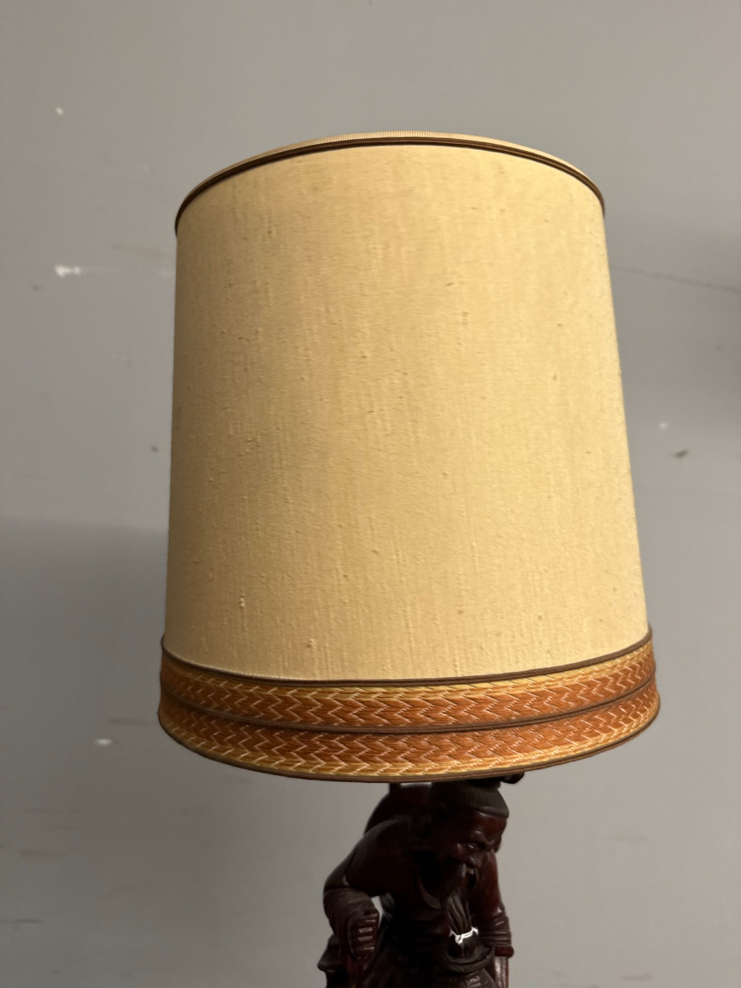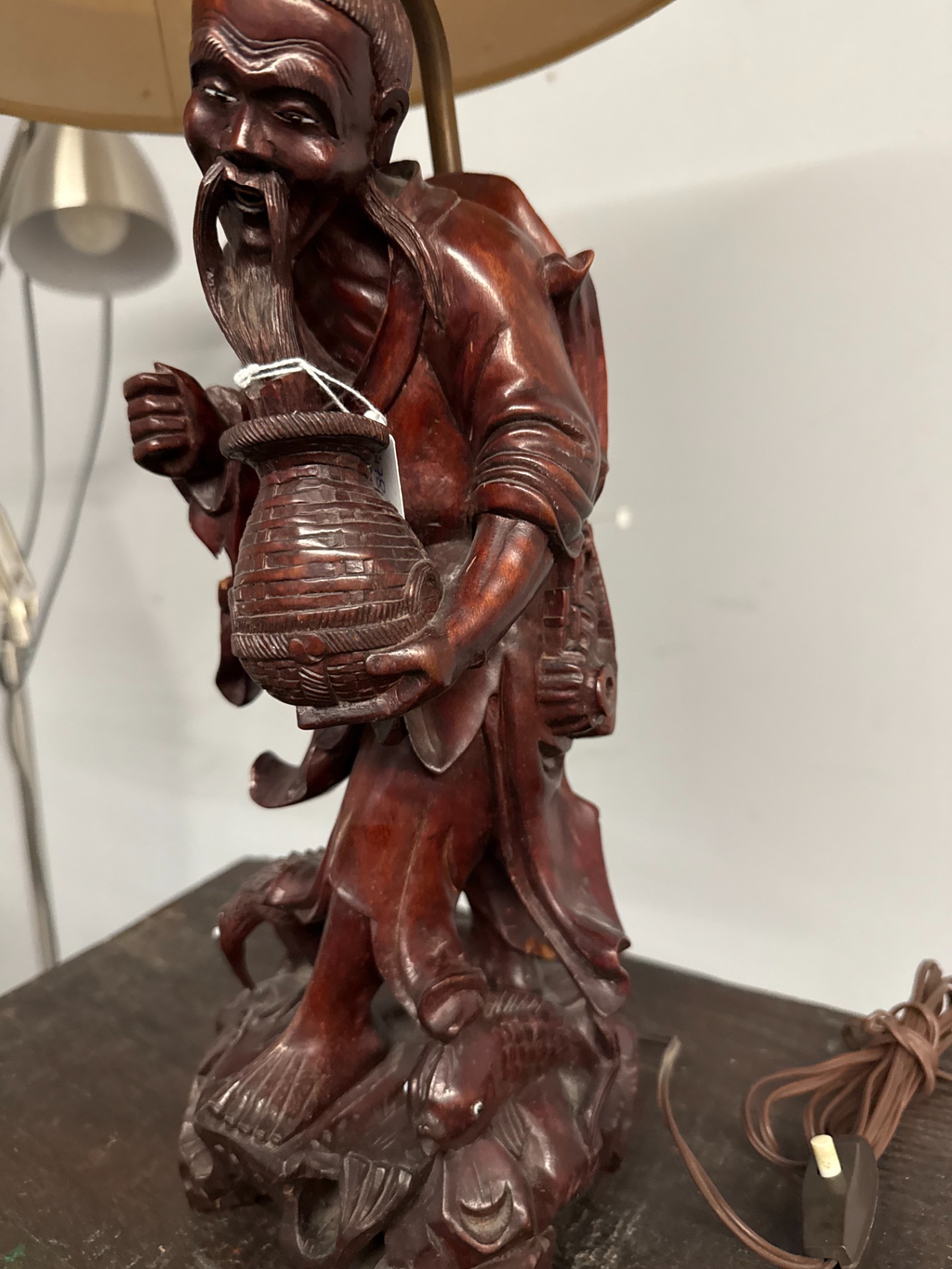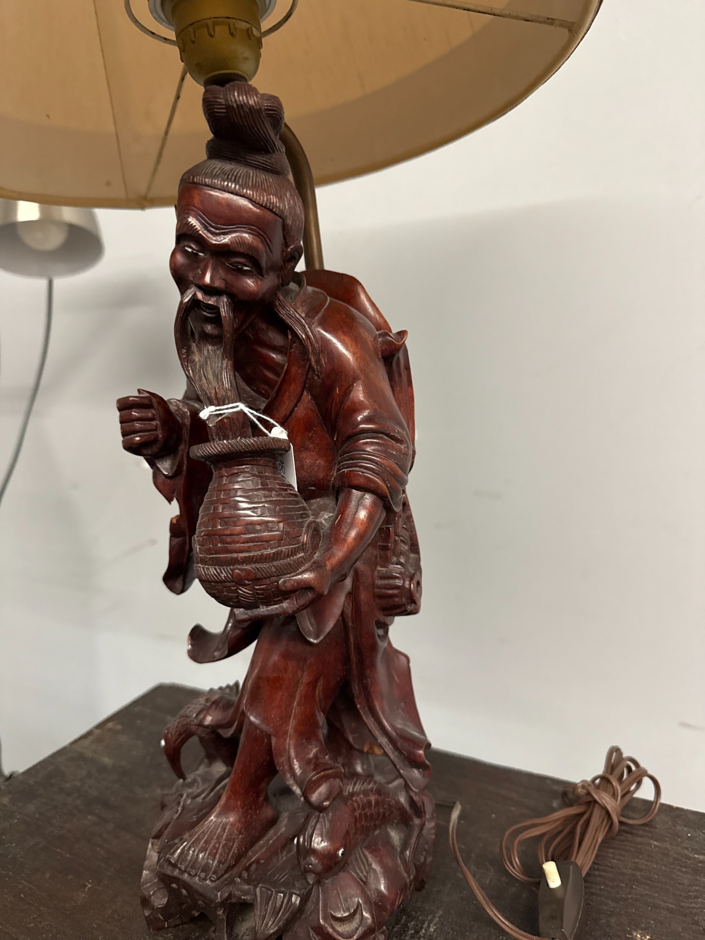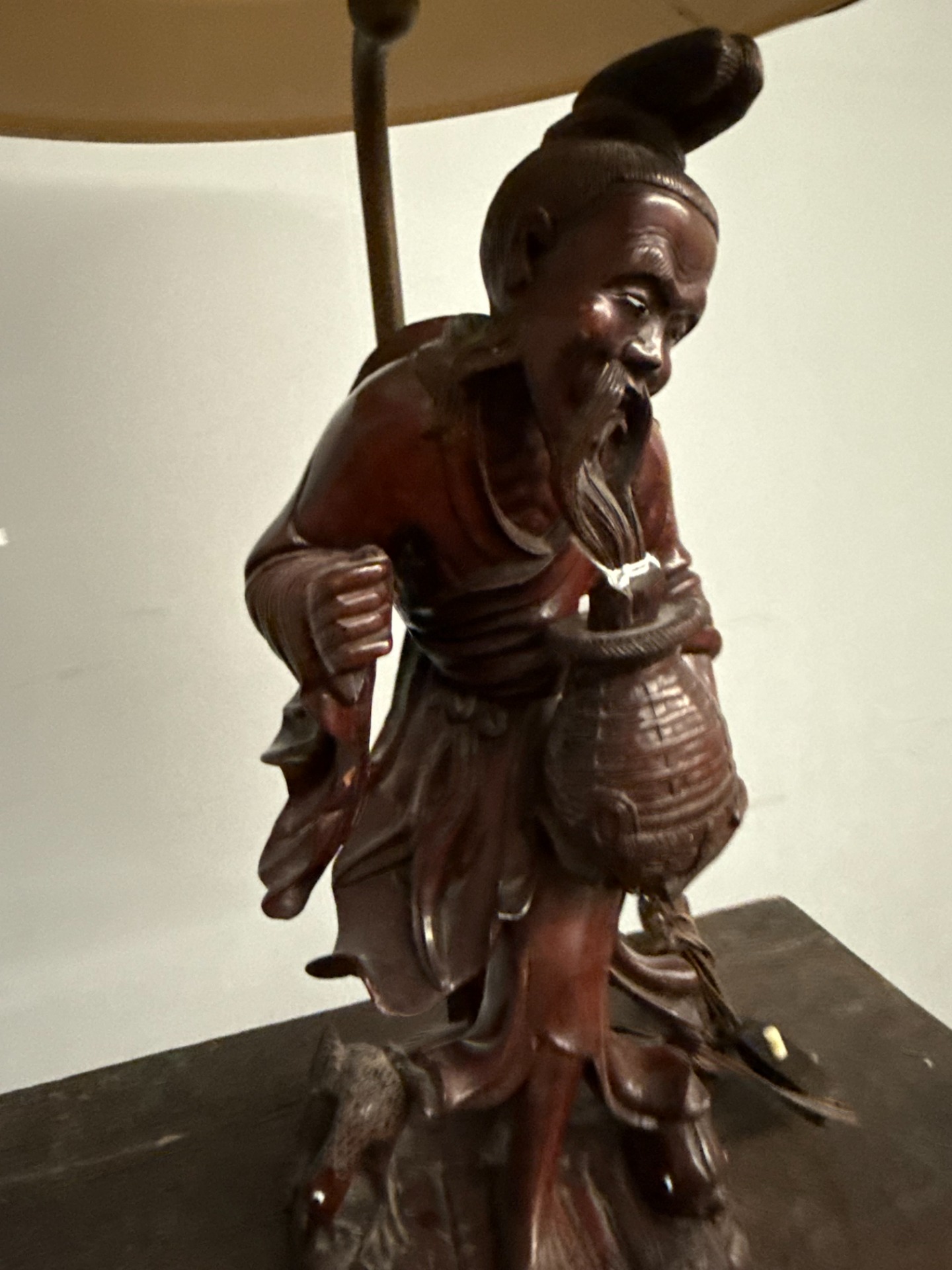 Antica scultura a lampada in legno cinese personaggio '900, 70x36cm