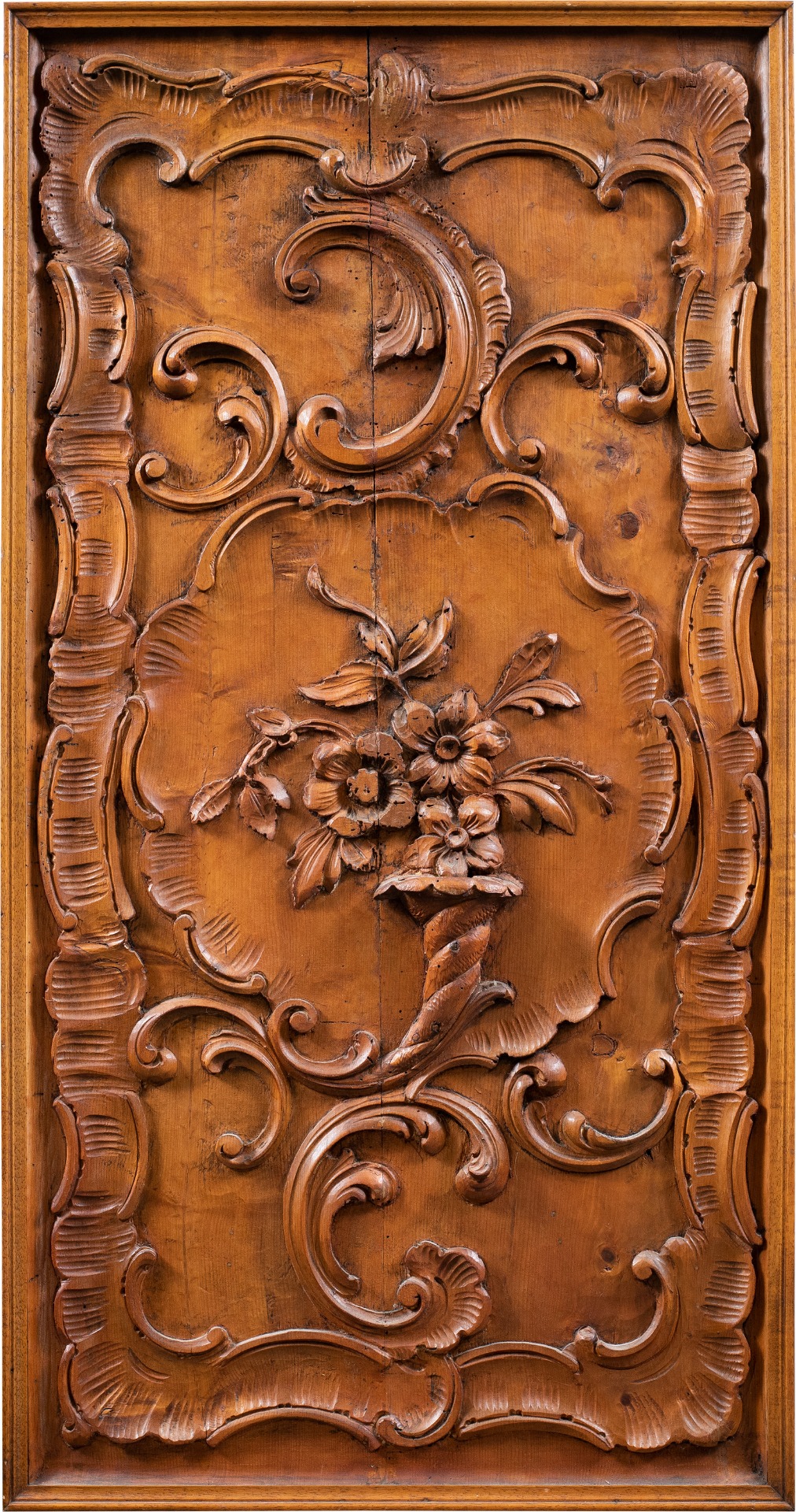 Realizzati interamente in legno finemente intagliato. Decorazioni vegetali in stile Rococò con al centro due cornucopie con fiori.