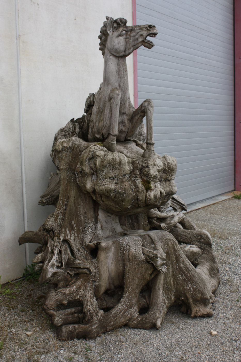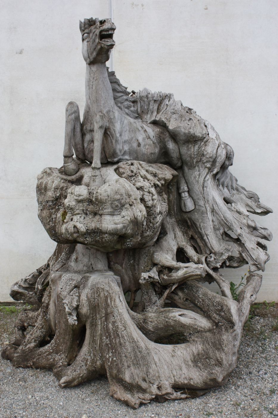 Strepitosa scultura asiatica del XX secolo. Opera museale raffigurante "Cavallo" di grande qualità e misura eccezionale. Scultura ricavata da radice indonesiana splendidamente creata da un unico blocco di legno. Opera tenuta in piedi da un sostegno aggiunto successivamente nella parte posteriore. Scultura ideale per un grande giardino oppure per decorare l'ingresso di un'impresa o locale. In ottime condizioni, non richiede interventi di restauro, da mantenere nella sua bellissima patina.