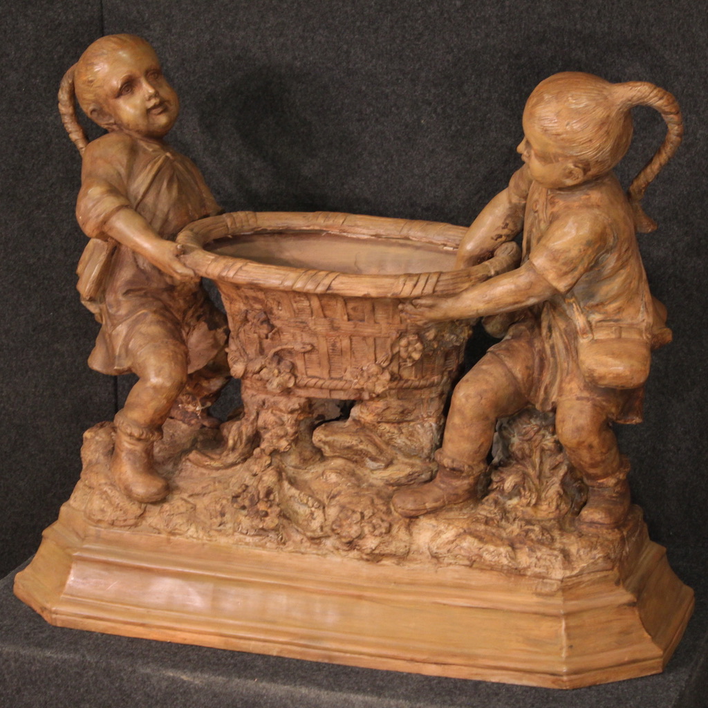 Grande scultura austriaca del XX secolo. Vaso in terracotta portato da due bambini su basamento ottagonale. Scultura di gusto orientaleggiante, finita da centro, finemente rifinita nei minimi dettagli, dai vestiti dei bambini fino al decoro del cesto intrecciato (vedi foto). Opera di grande misura e impatto, ideale da inserire in un salone o studio, anche al centro di un'ambiente. Oggetto che presenta su un lato un timbro, Goldscheider Wien (vedi foto) riferibile alla celebre produzione Goldscheider fondata a Vienna nel 1885 e ancora attiva nella prima metà del 900, mancante di autentica. Non presenta rotture o restauri, scultura in bellissima patina. In ottime condizioni.