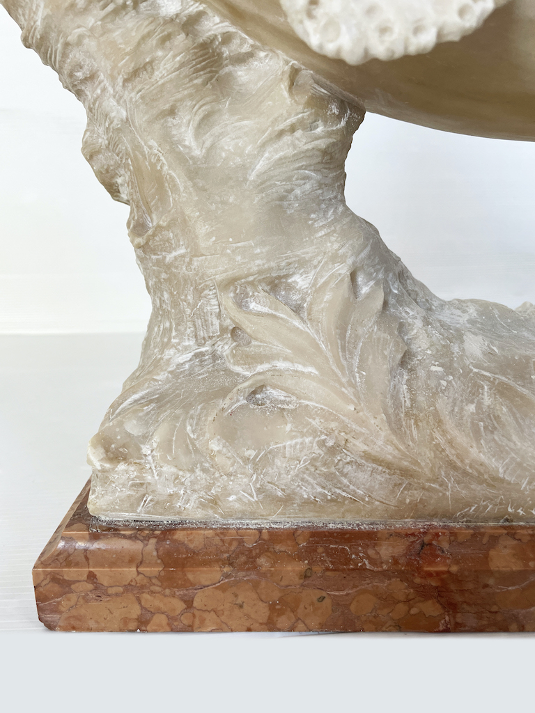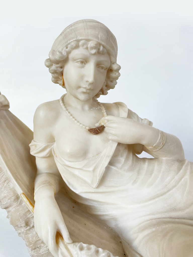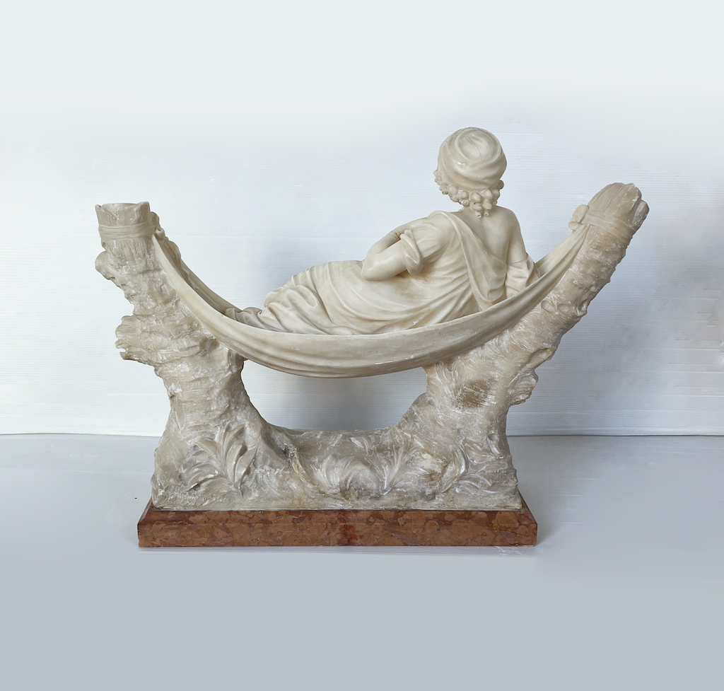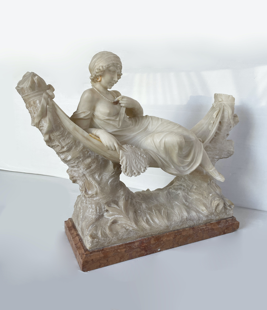 Elegante scultura italiana in alabastro in stile Liberty di inizio Novecento raffigurante una donna seduta su un'amaca sostenuta da due tronchi tagliati. Con il gomito poggiato sul lenzuolo di marmo, tiene in una mano un un ventaglio e con l’altra si accarezza una collana con dettaglio in bronzo. Indossa anche orecchini abbinati, sempre in bronzo. La scultura è sorretta da una base in marmo. colorato.