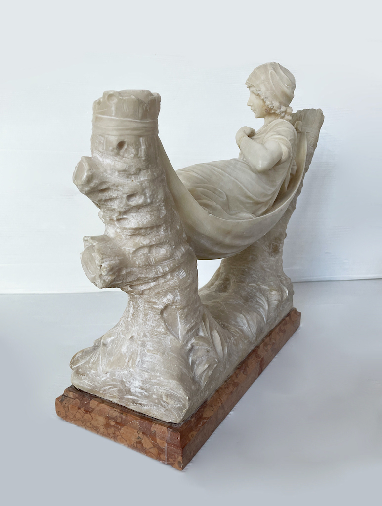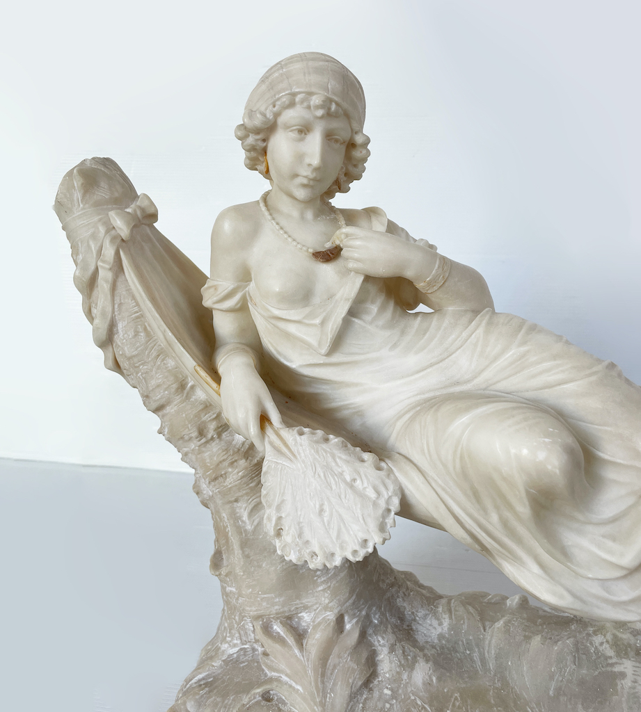Elegante scultura italiana in alabastro in stile Liberty di inizio Novecento raffigurante una donna seduta su un'amaca sostenuta da due tronchi tagliati. Con il gomito poggiato sul lenzuolo di marmo, tiene in una mano un un ventaglio e con l’altra accarezza il ciondolo di una collana a cui è stato aggiunto un tocco cromatico bronzo. Indossa anche orecchini abbinati, sempre color bronzo. La scultura è sorretta da una base in marmo colorato.