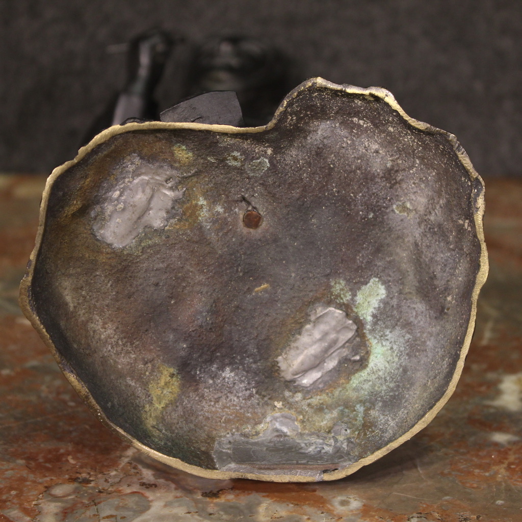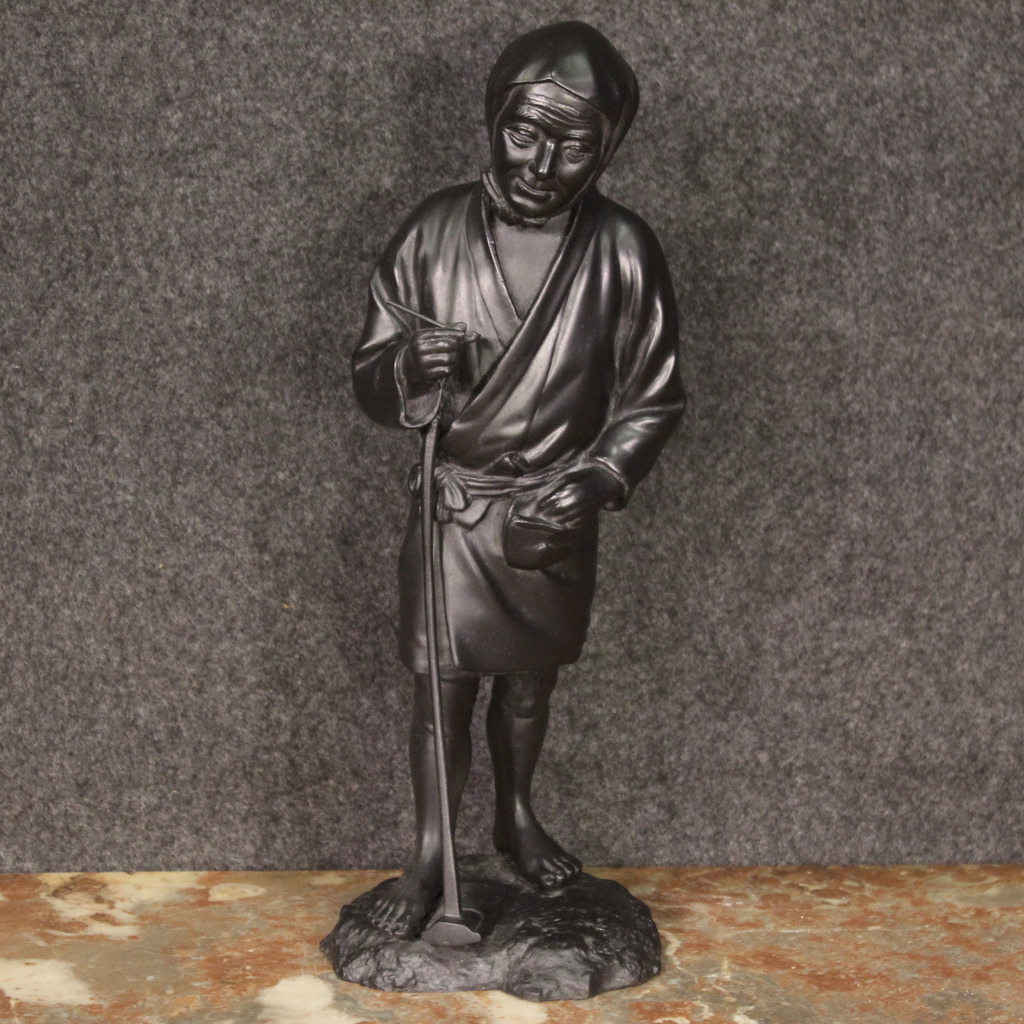 Scultura giapponese del XX secolo. Opera in bronzo cesellato raffigurante fumatore di pipa, contadino orientale con zappa, di bella qualità. Scultura di misura contenuta, per antiquari e collezionisti, ideale da esporre in una collezione di bronzi e porcellane orientali. Oggetto patinato scuro, di grande carattere, finemente cesellato nei minimi particolari. In buone condizioni.