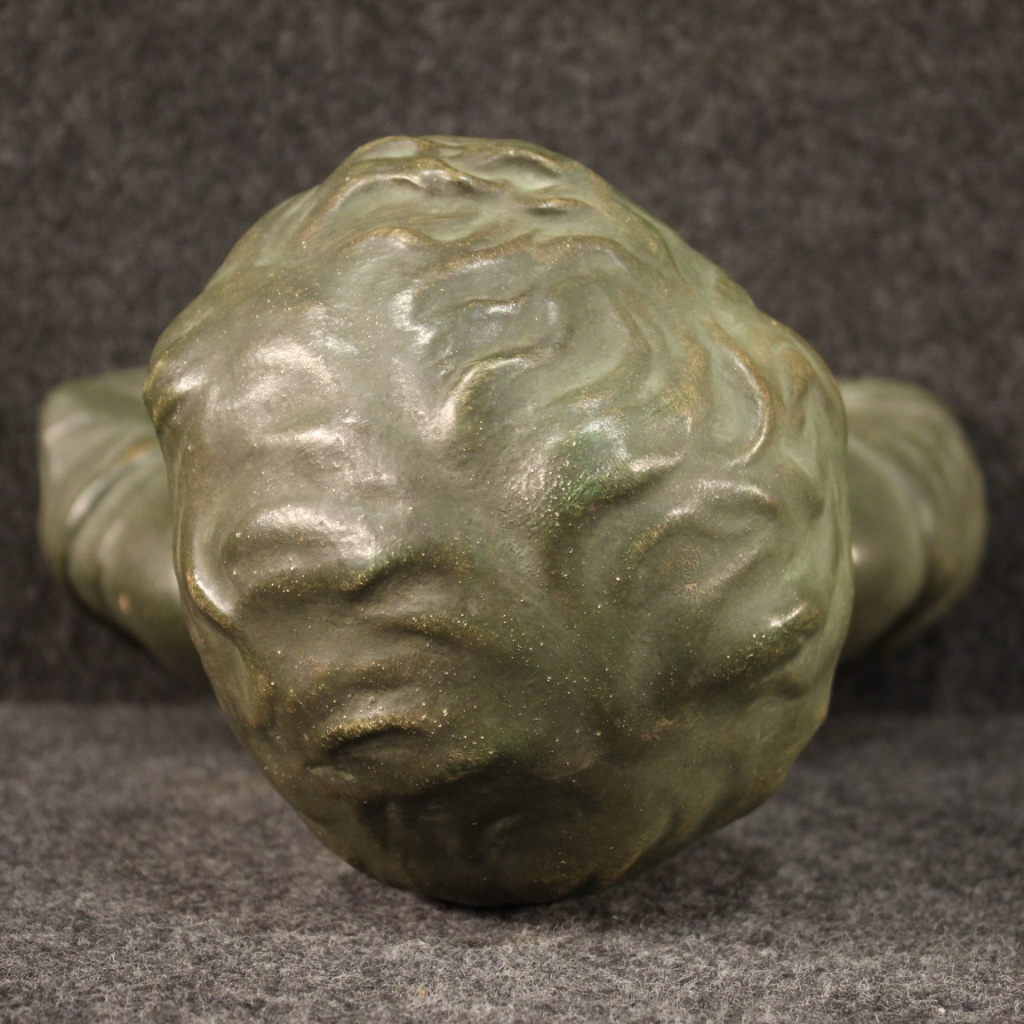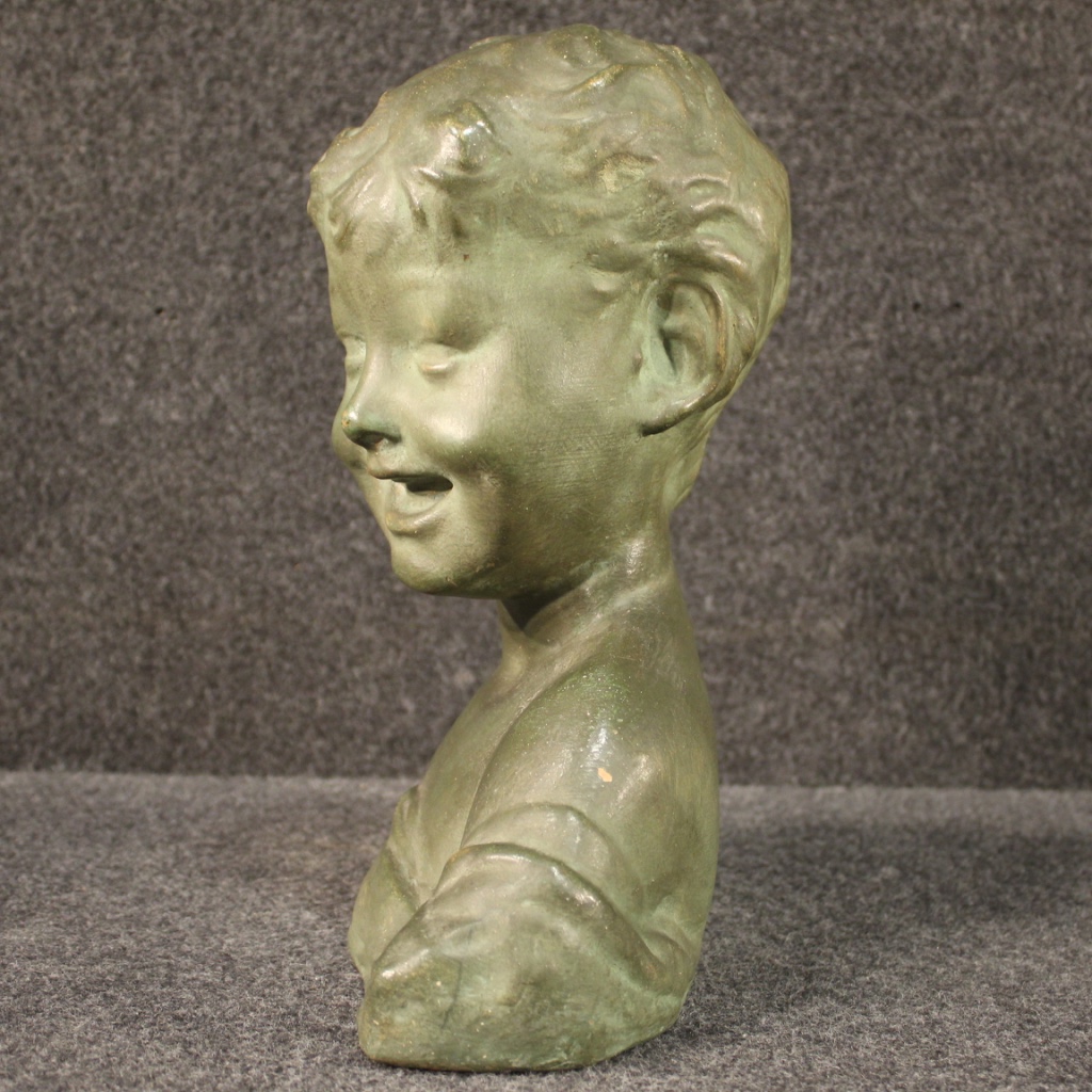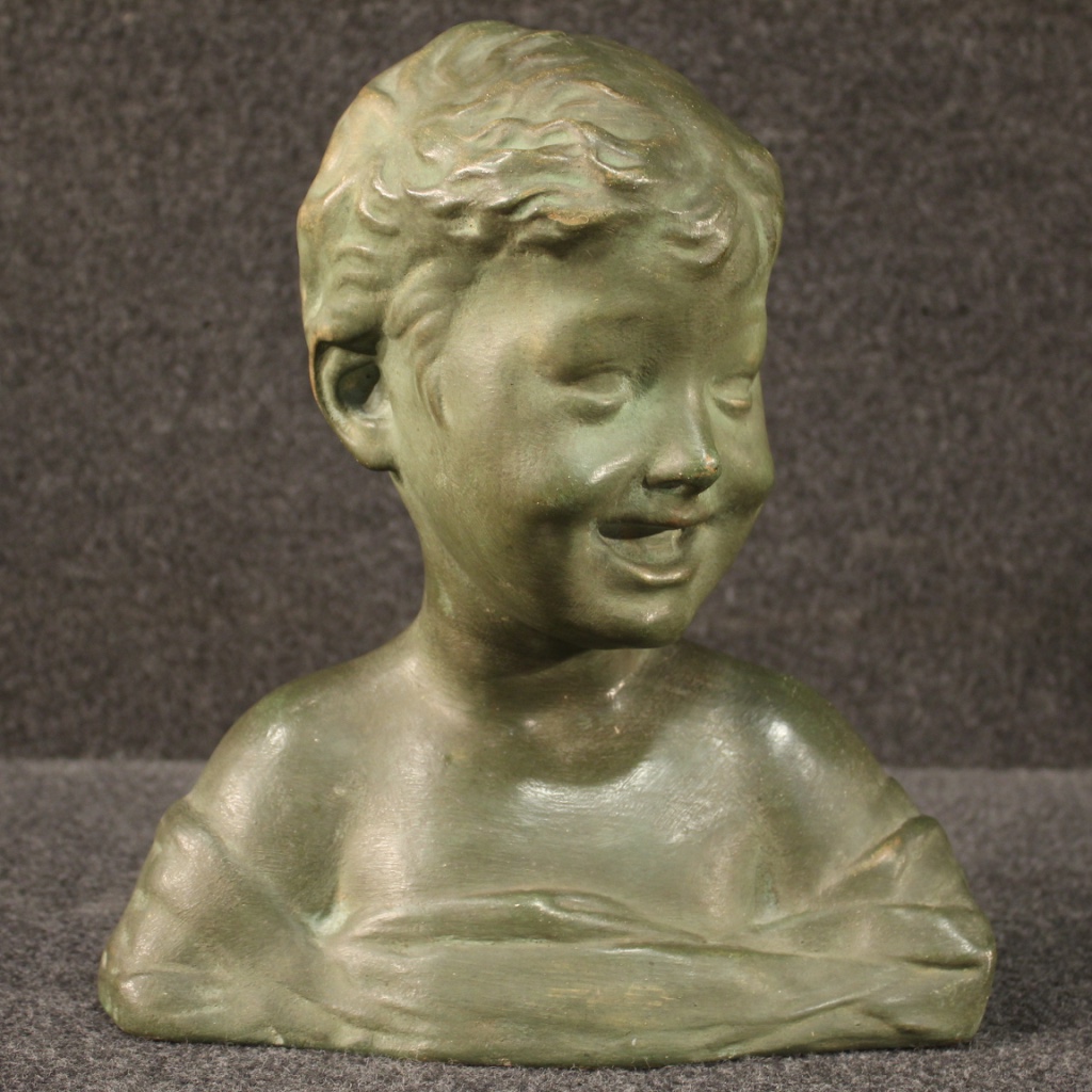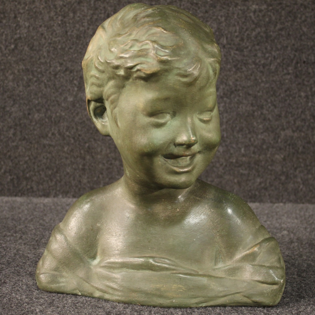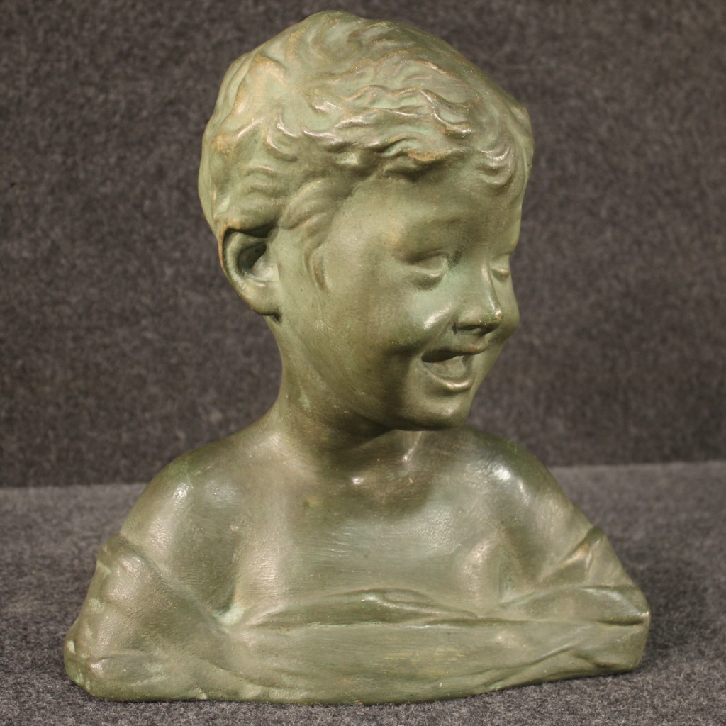 Scultura italiana in terracotta della prima metà del XX secolo. Opera finemente cesellata in terracotta dipinta tinta bronzo raffigurante busto di bambino. Oggetto di bella misura e piacevole arredamento, mancante di timbri o firme. Opera per antiquari, arredatori e collezionisti di sculture italiane. Scultura in buone condizioni con qualche piccolo segno del tempo. Senza rotture o segni di restauro.