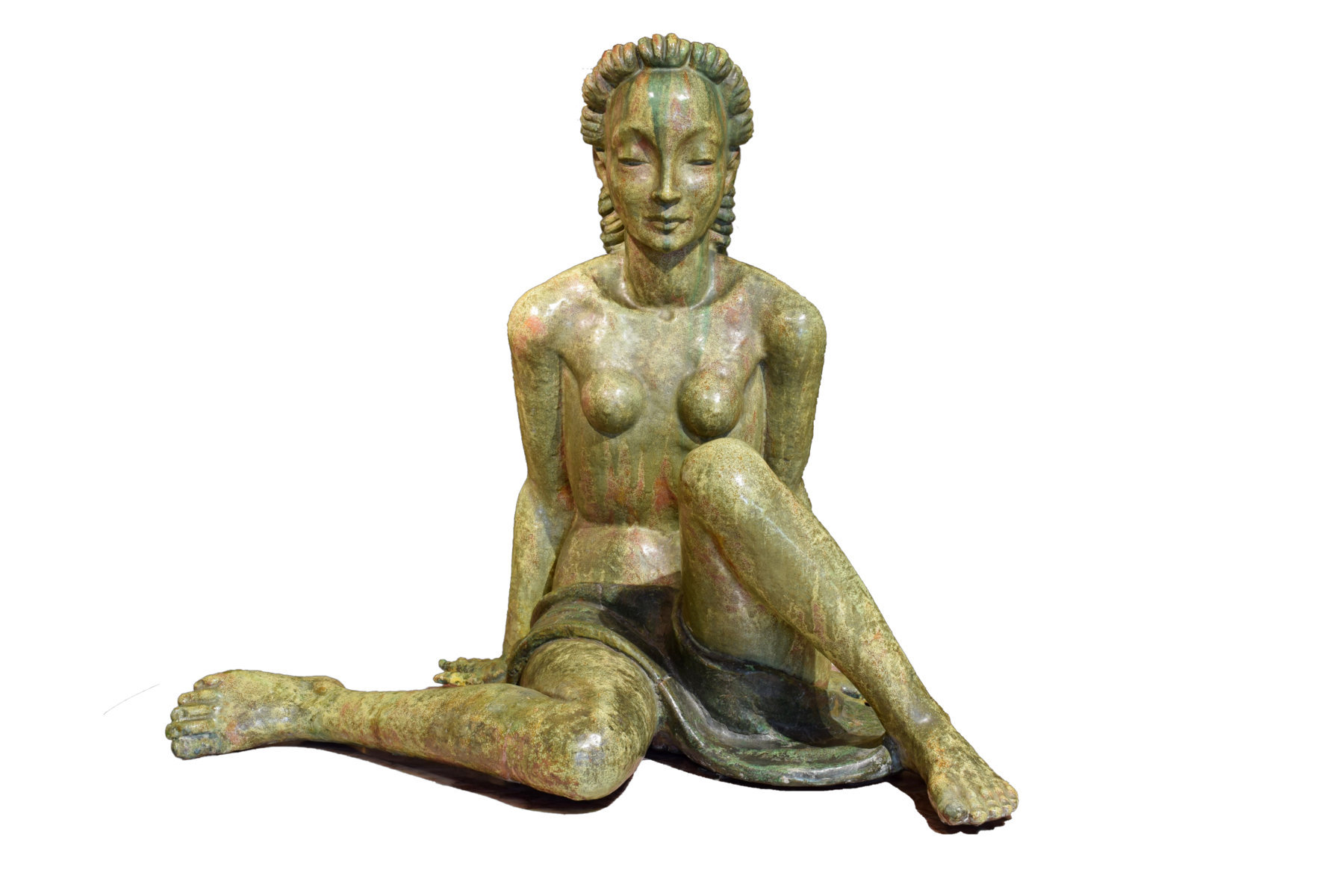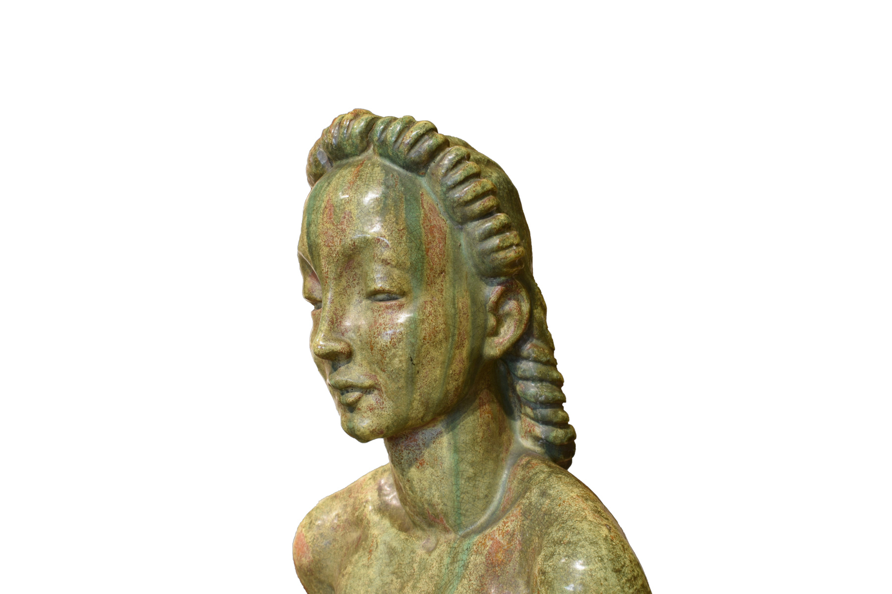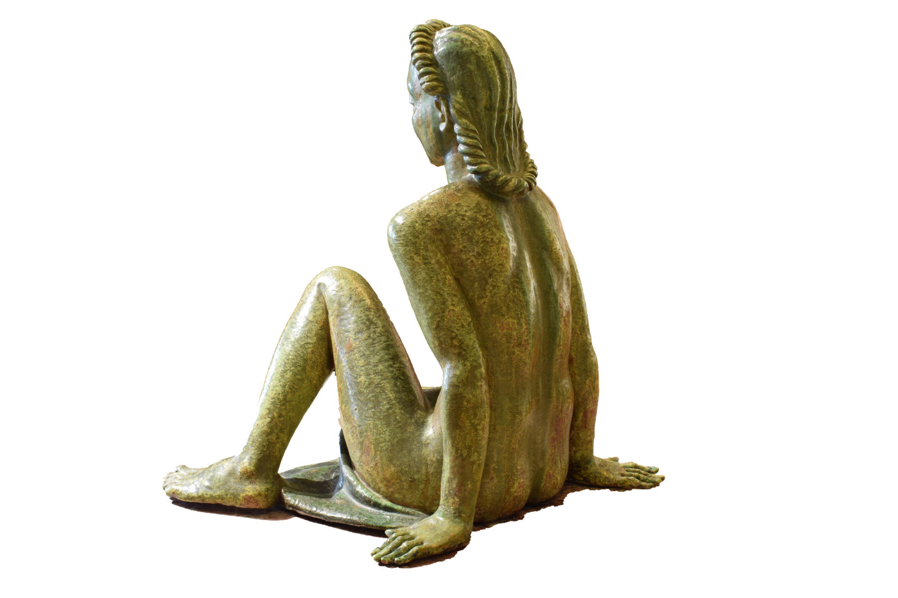 La pregevole scultura, realizzata in terracotta invetriata, è opera della celebre manifattura Lenci di Torino su modello di Helen König Scavini. Di notevoli dimensioni, raffigura una donna nuda, coperta di un solo panno a vita, seduta con le gambe flesse asimmetricamente mentre si sorregge sulle braccia con le mani poggiate al piano. La donna ha un’espressione ieratica, grandi arcate sopraccigliari sotto le quali gli occhi eterei sono socchiusi; le labbra dischiuse nascondono un accenno di sorriso. I capelli sciolti sono rigirati indietro con grandi onde sia sul capo che lungo la schiena. La colorazione dell’invetriatura è sui toni del verde muschiato, che contribuisce a conferire a questa donna l’aspetto di una ninfa o di una figura mitologica. Sotto alla base in terra cotta si trova, dipinto a mano, il marchio della manifattura “Lenci, ITALY”.