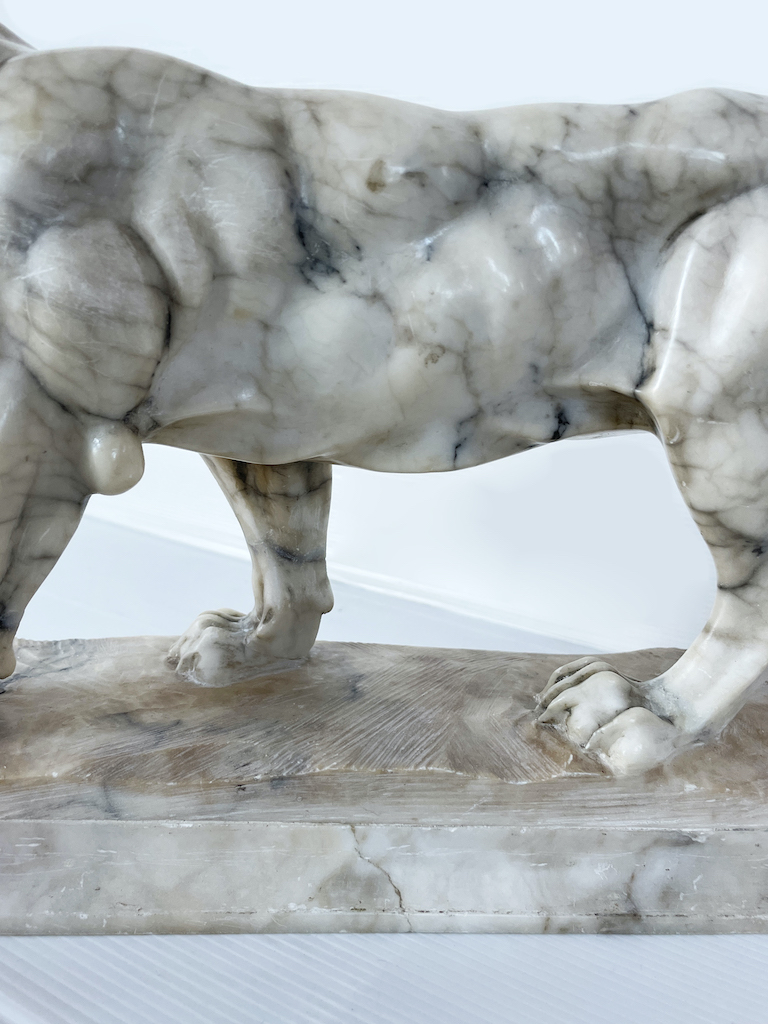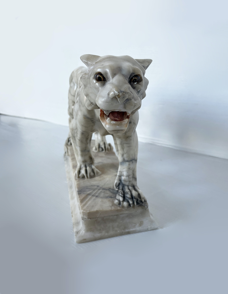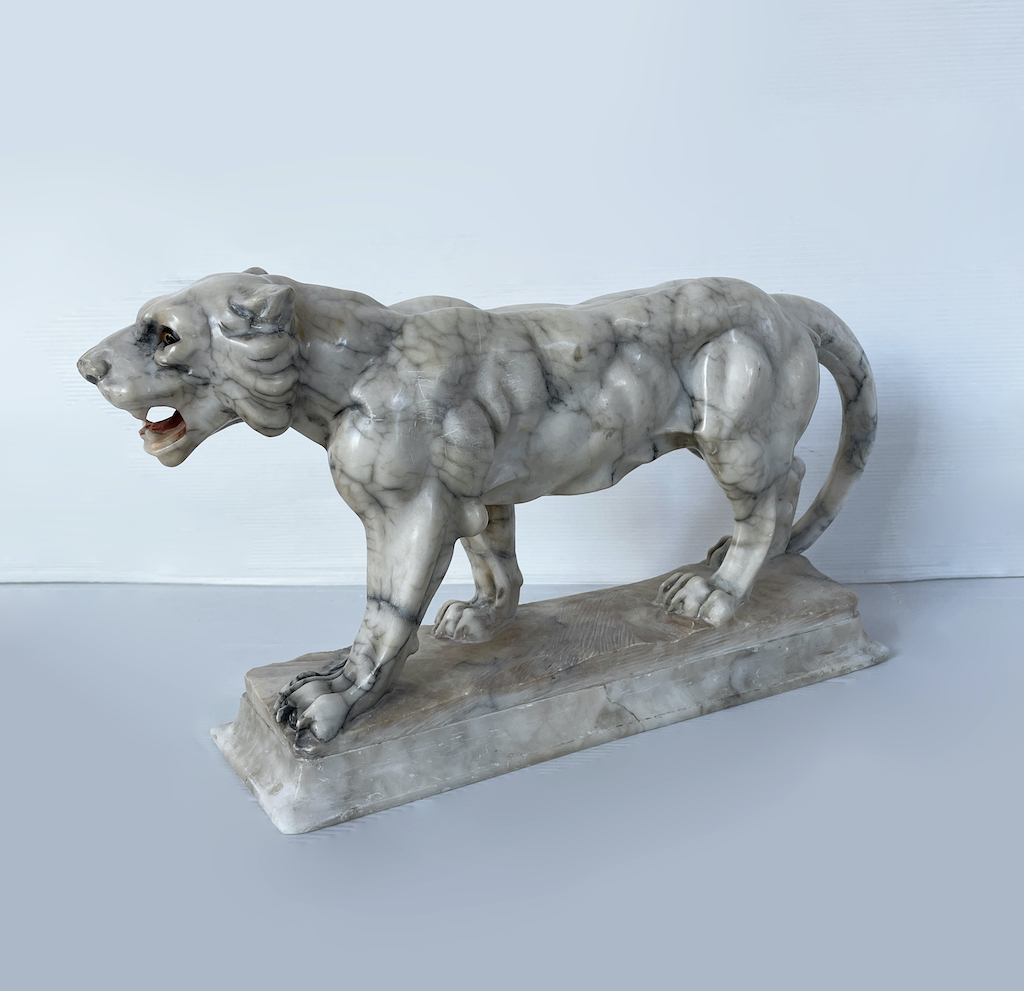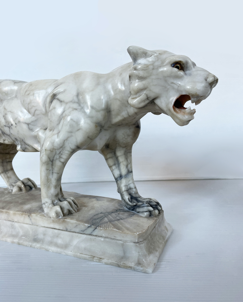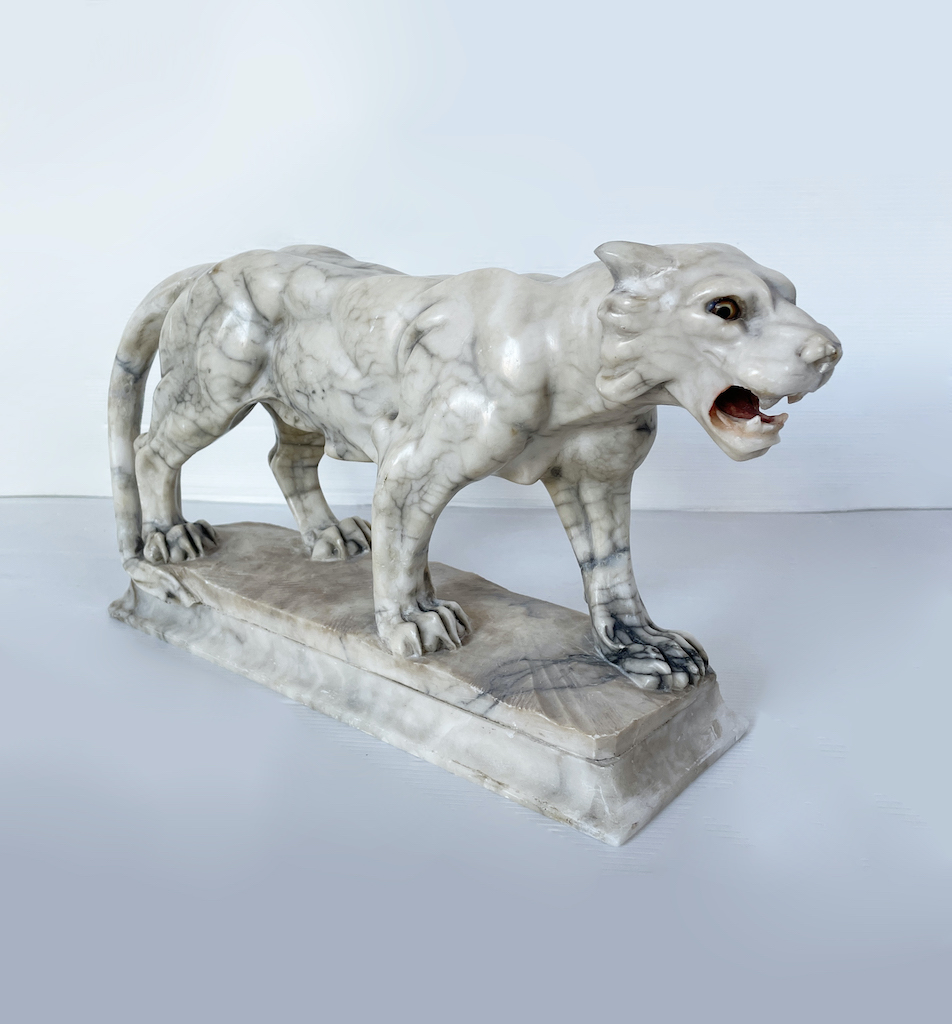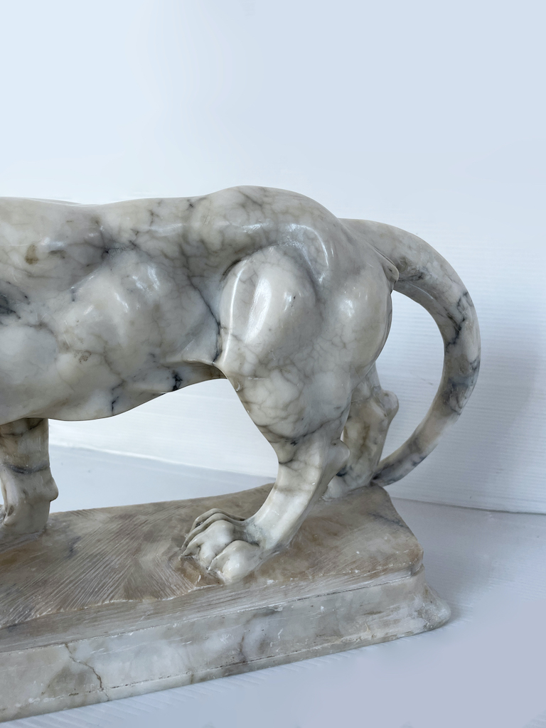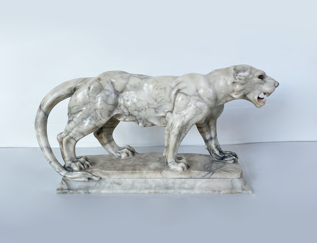 Particolare scultura in alabastro bianco con venature in stile Liberty di inizio Novecento raffigurante un felino, probabilmente una pantera o una leonessa. Presenta inserti in vetro per rendere più realistici gli occhi ed elementi cromatici nella zona della bocca.