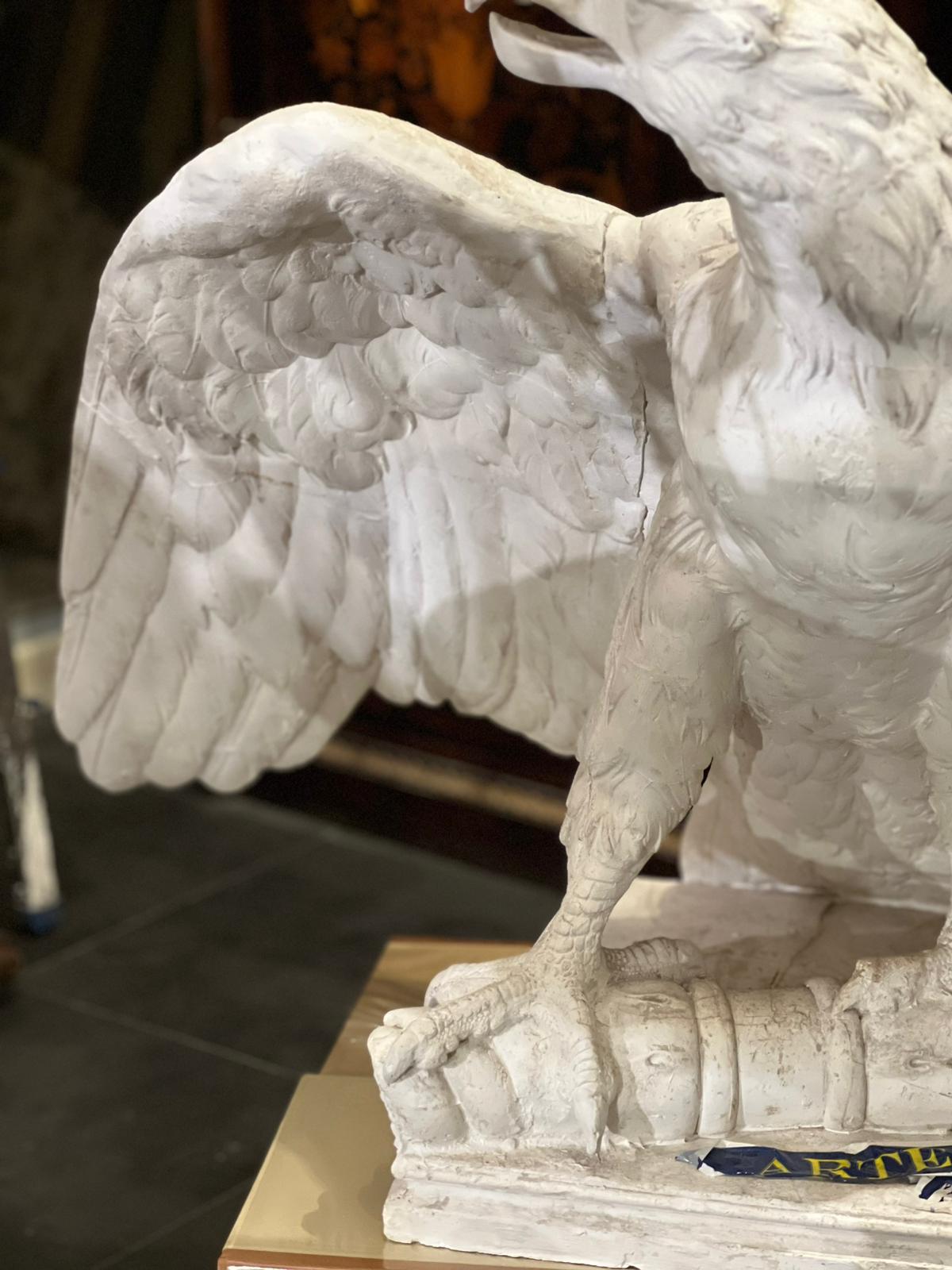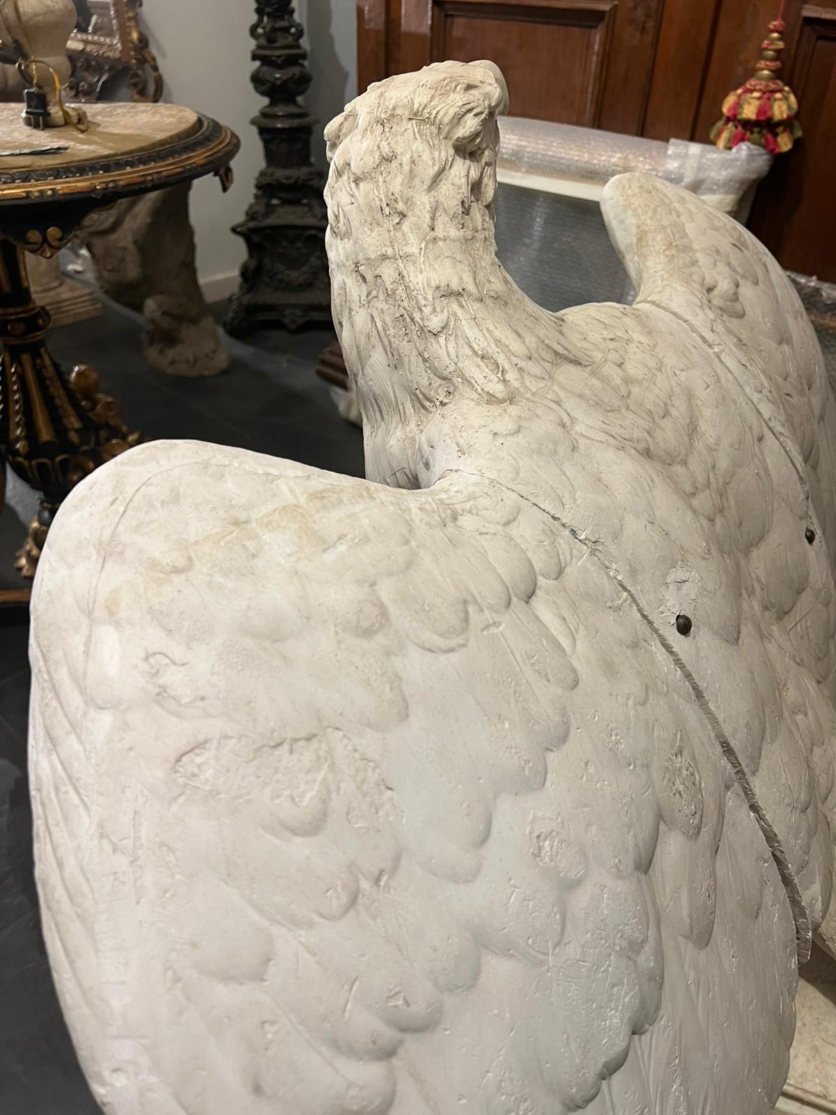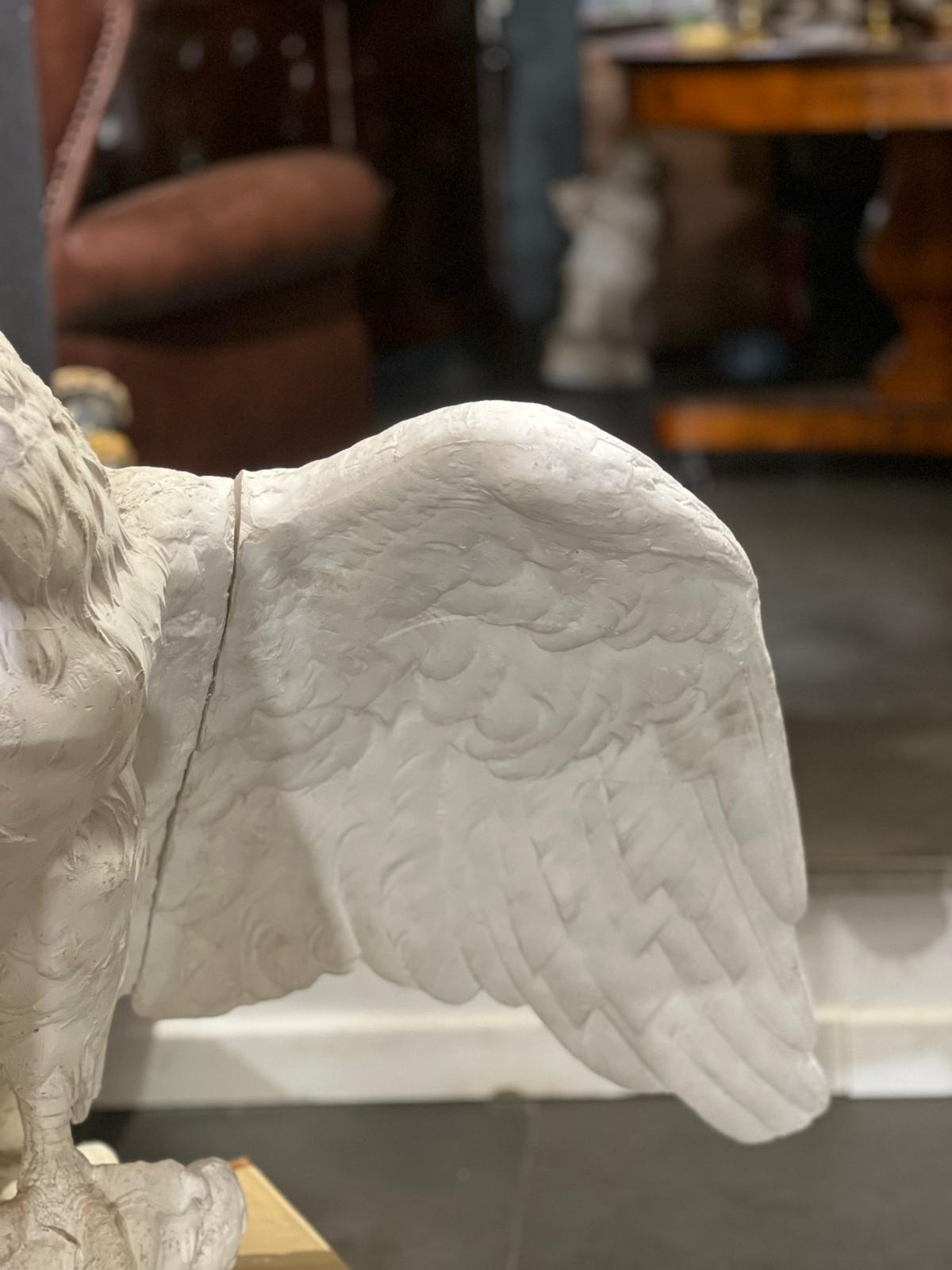 Bellissima scultura in gesso bianco finemente lavorato raffigurante un’aquila ad ali spiegate, simbolo di potenza e vigilanza. L’opera è rappresentata nell’atto di posarsi su un elemento architettonico cilindrico, con la testa rivolta di lato e il becco aperto. Primi del XX secolo. Per ulteriori informazioni o se interessati non esitate a contattarci al numero +393282150796.