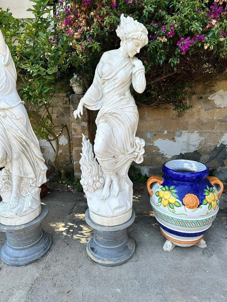Sculture in Marmo Bianco "Le Quattro Stagioni" rappresentano una perfetta sintesi di tradizione e maestria artigianale italiana. Queste sculture sono realizzate con pregiato marmo bianco e rappresentano visivamente l'eleganza e la bellezza di ogni stagione dell'anno.Primavera - simboleggia il rinnovarsi della vita, con dettagli floreali intricati.Estate - cattura la vivacità del sole e la bellezza dei paesaggi estivi.Autunno - esprime la ricchezza dei raccolti e i caldi toni autunnali.Inverno - rappresenta la sublime tranquillità dei paesaggi innevati.Le sculture, realizzate in Italia nei primi del '900, hanno una qualità eccezionale e dettagli minuti. Perfette per decorare interni moderni e classici, queste opere d'arte sono un must-have per gli amanti della scultura.Stile: NeoclassicoMateriale: Marmo/PietraAltezza (cm): 220Diametro: 50Epoca: XX Secolo - 1900