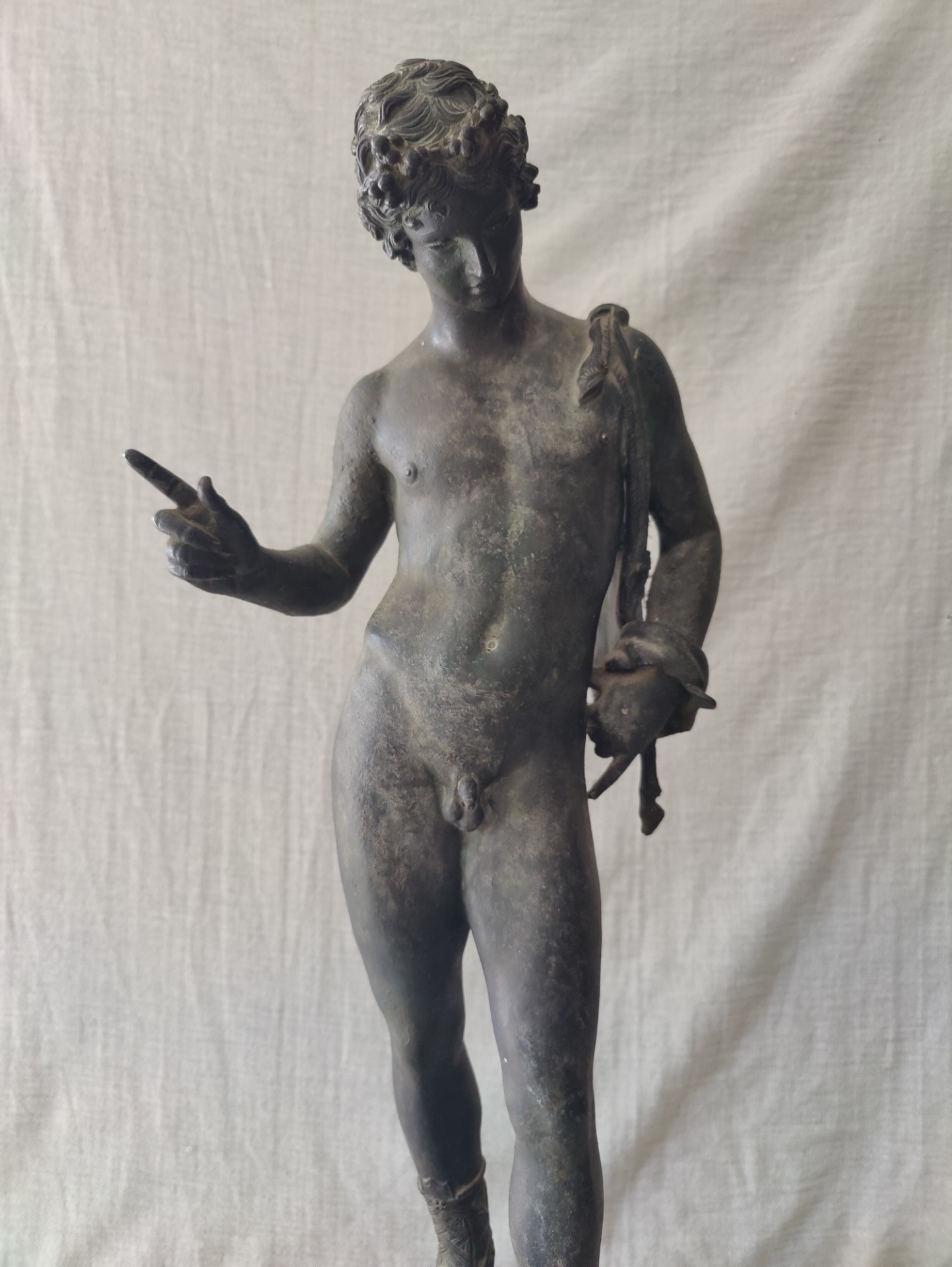 Elegante scultura in bronzo raffigurante Narciso, figura della mitologia greca nota per la sua straordinaria bellezza e l'amore per il proprio riflesso.