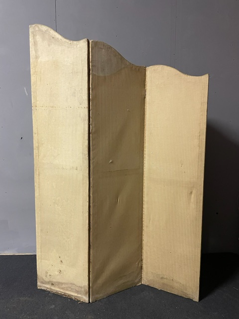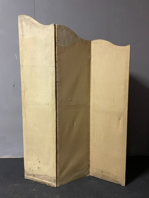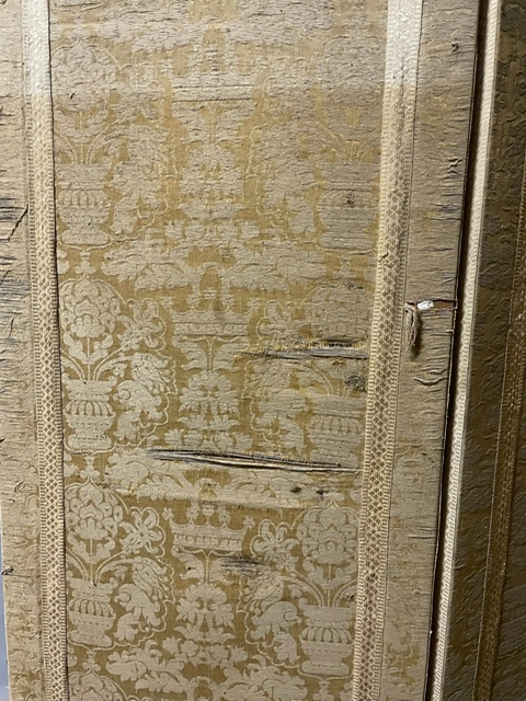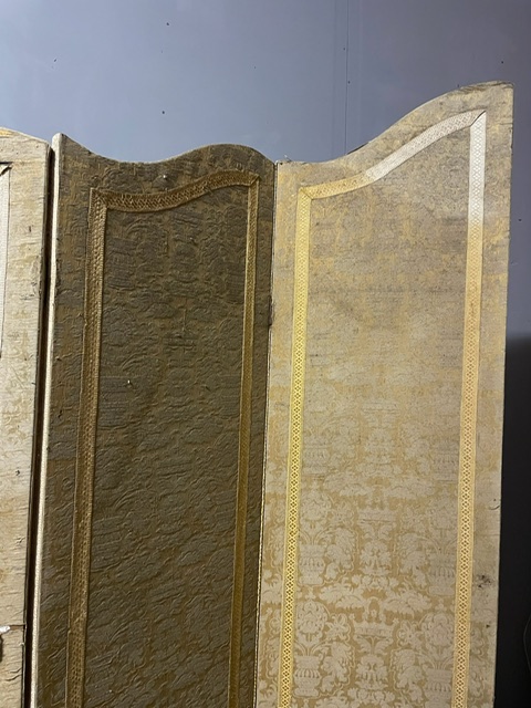 Antico separè in seta, a 3 pannelli o ante apribili, agganciate in ordine crescente e forma mossa, tappezzato double face da centro, stoffe da restaurare ma molto pregiato