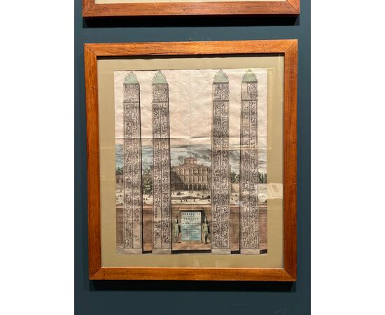 Stampa seicentesca con rappresentato l'obeliscus flaminius, opera dell'incisore Joan Blaeu (1596-1673) realizzata con tecnica a bulino su rame. Colorazione acquerellata originale dell'epoca. Ottime condizioni come da foto. Misure: 84x74cm (cornice)