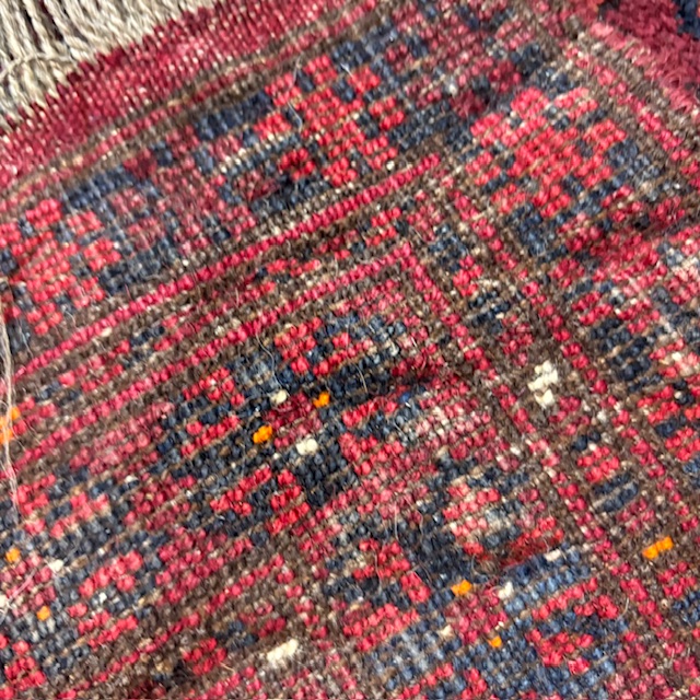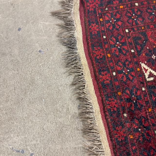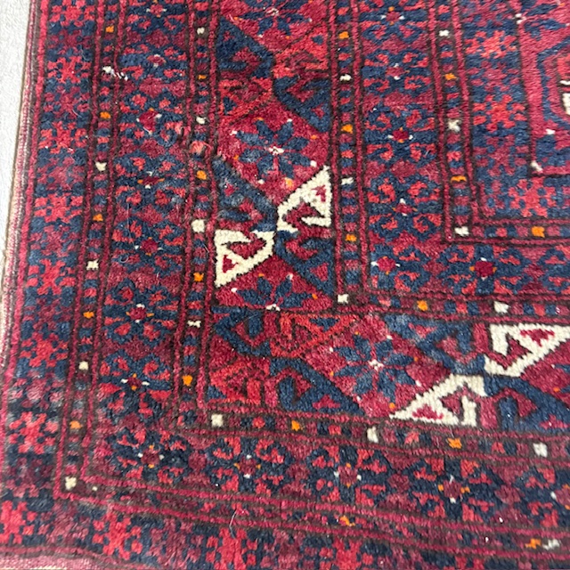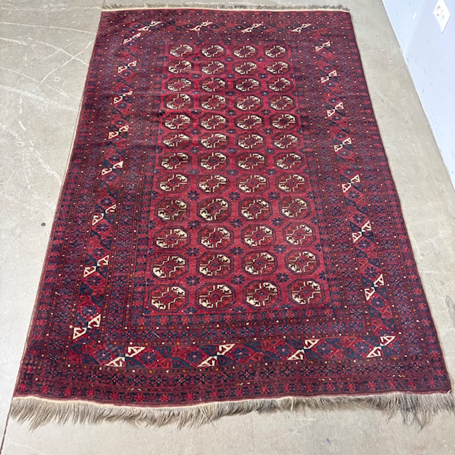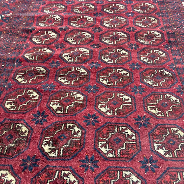 Bellissimo Tappeto metà 900 lana e seta alta qualità Turkmenistan Bukhara a motivi geometrici fondo rosso con sfumature blu. mis 210 x 130 . Stato molto buono .