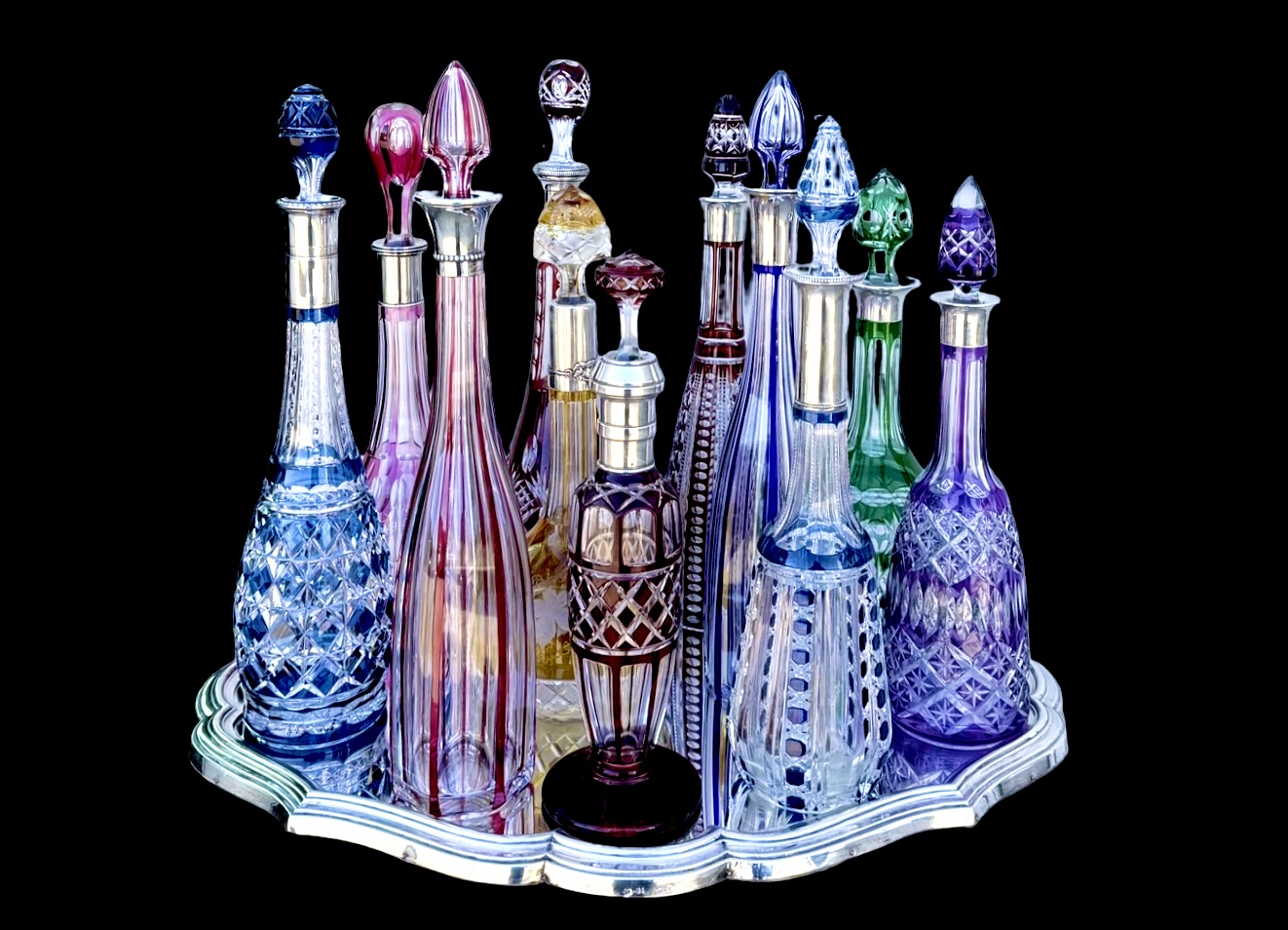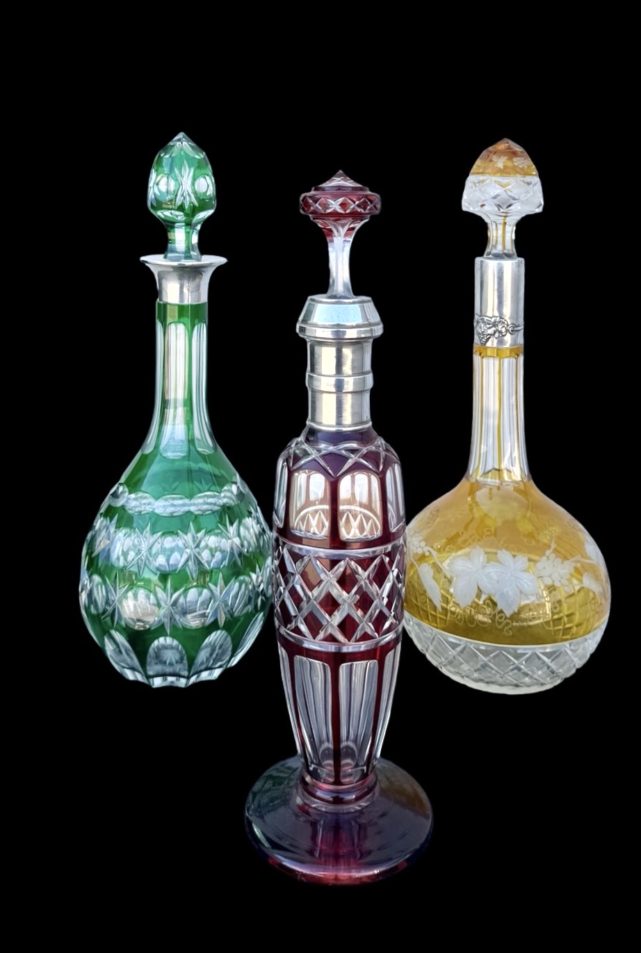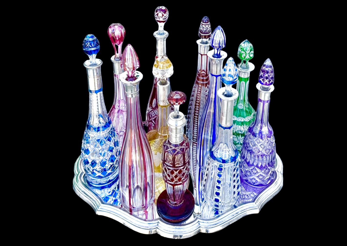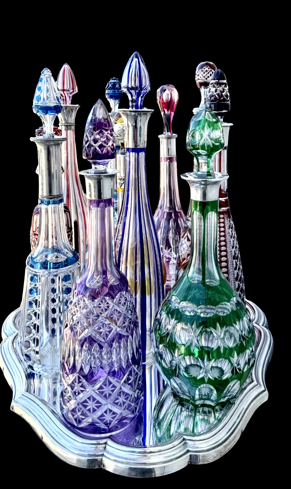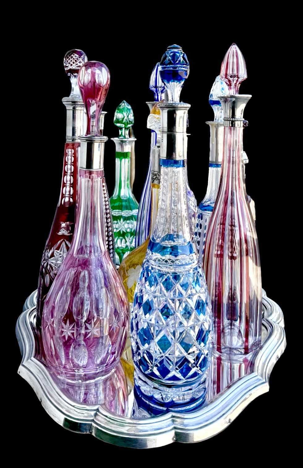 Serie di 11 bottiglie in cristallo molato di diversi colori.Produzione Boemia con collo in argento ( punzoni prevalentemente italiani). Misure da cm 35 a cm 45. Vassoio vendibile separatamente.
