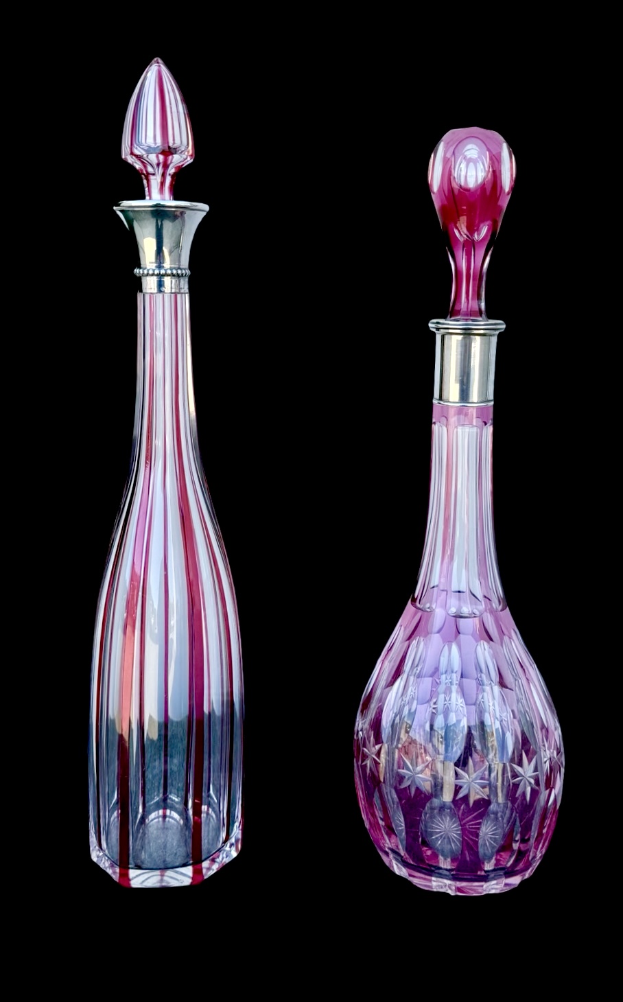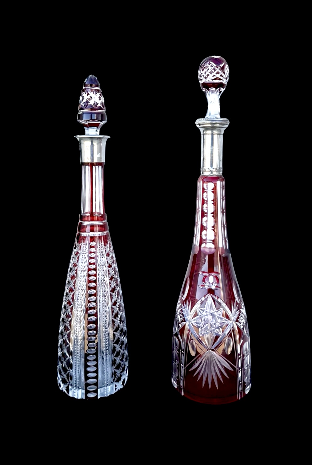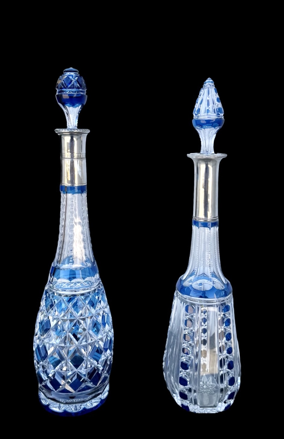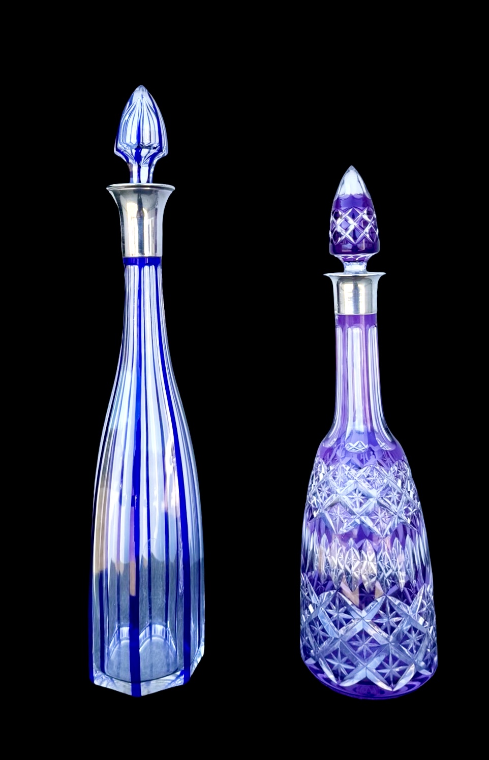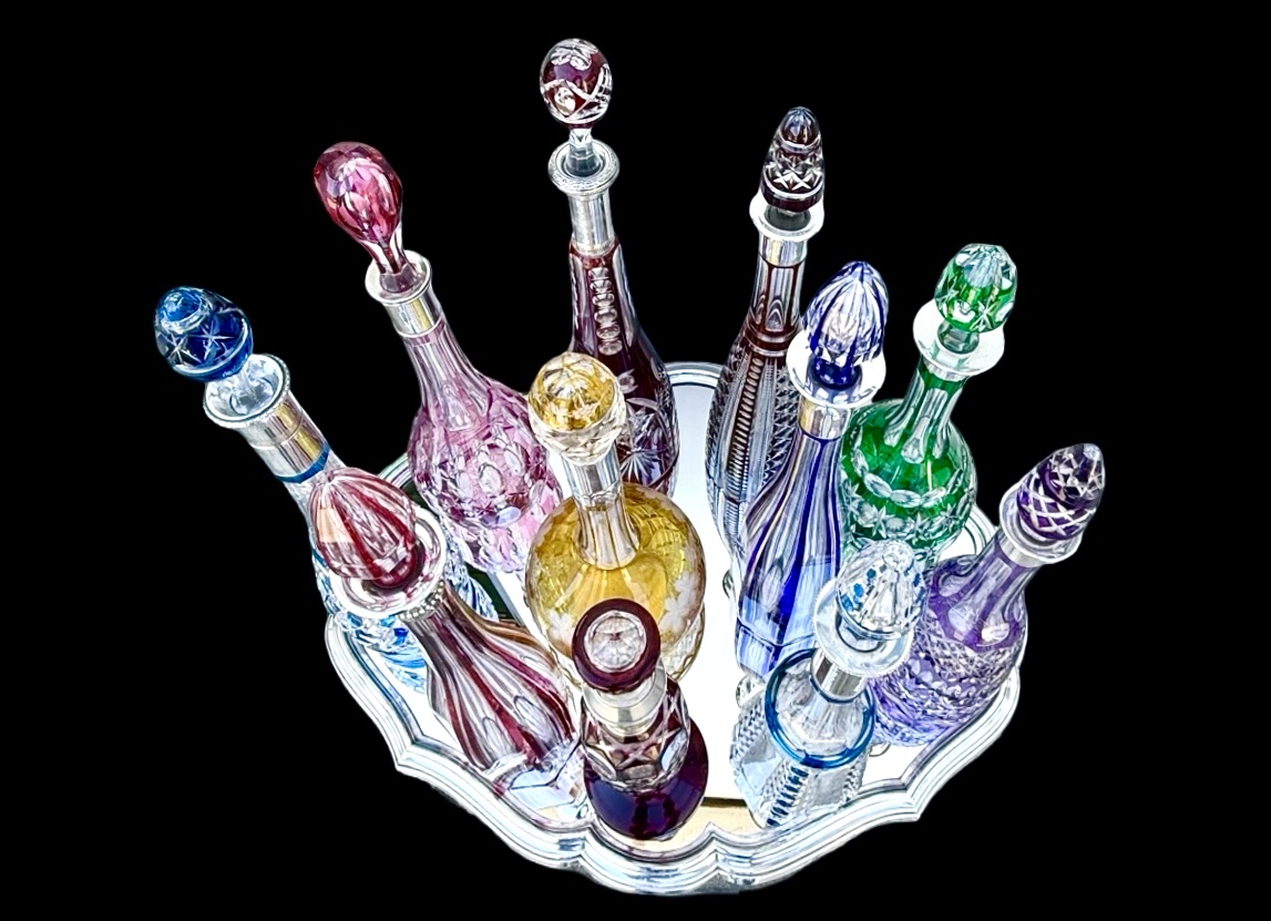 Serie di 11 bottiglie in cristallo molato di diversi colori.Produzione Boemia con collo in argento ( punzoni prevalentemente italiani). Misure da cm 35 a cm 45. Vassoio vendibile separatamente.