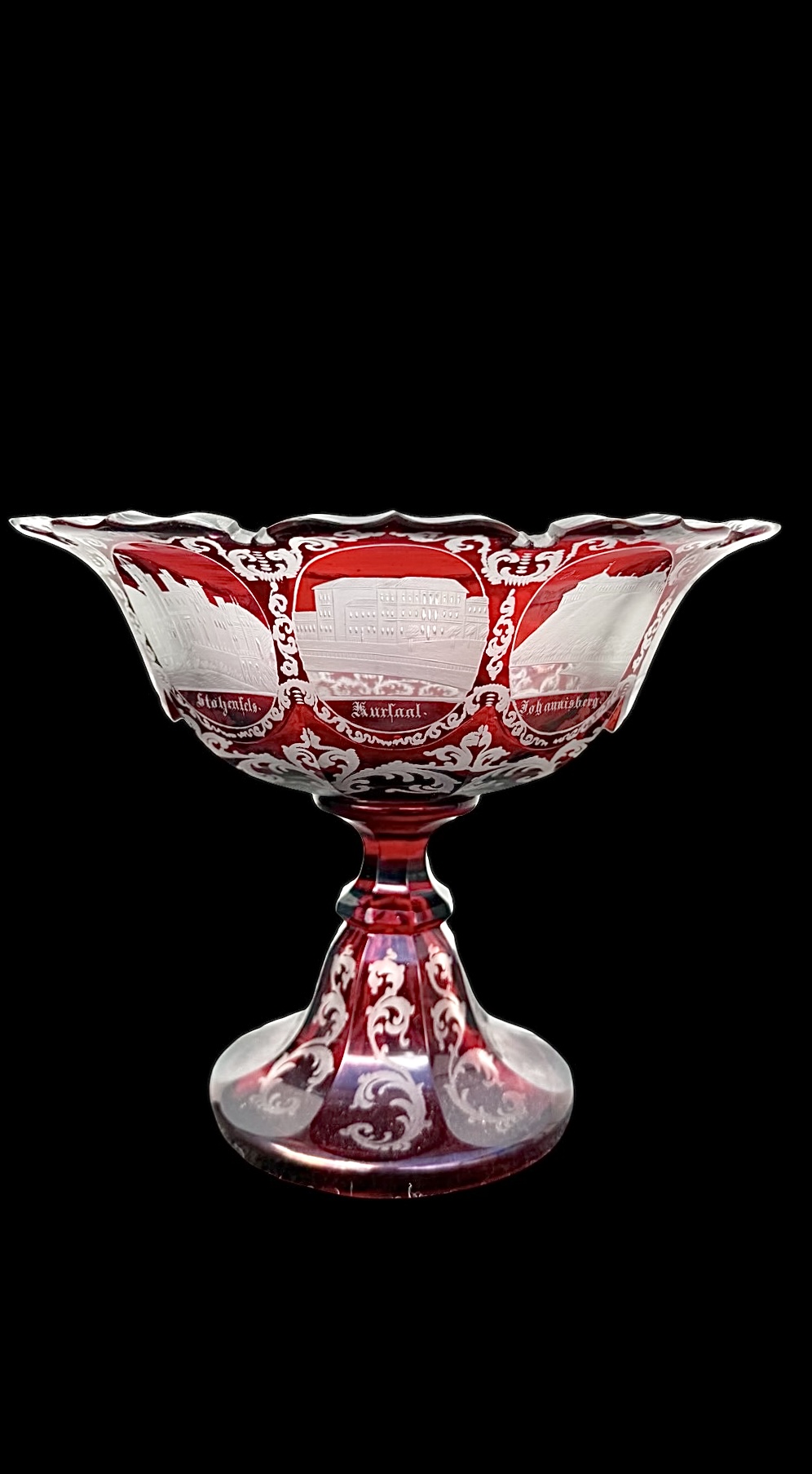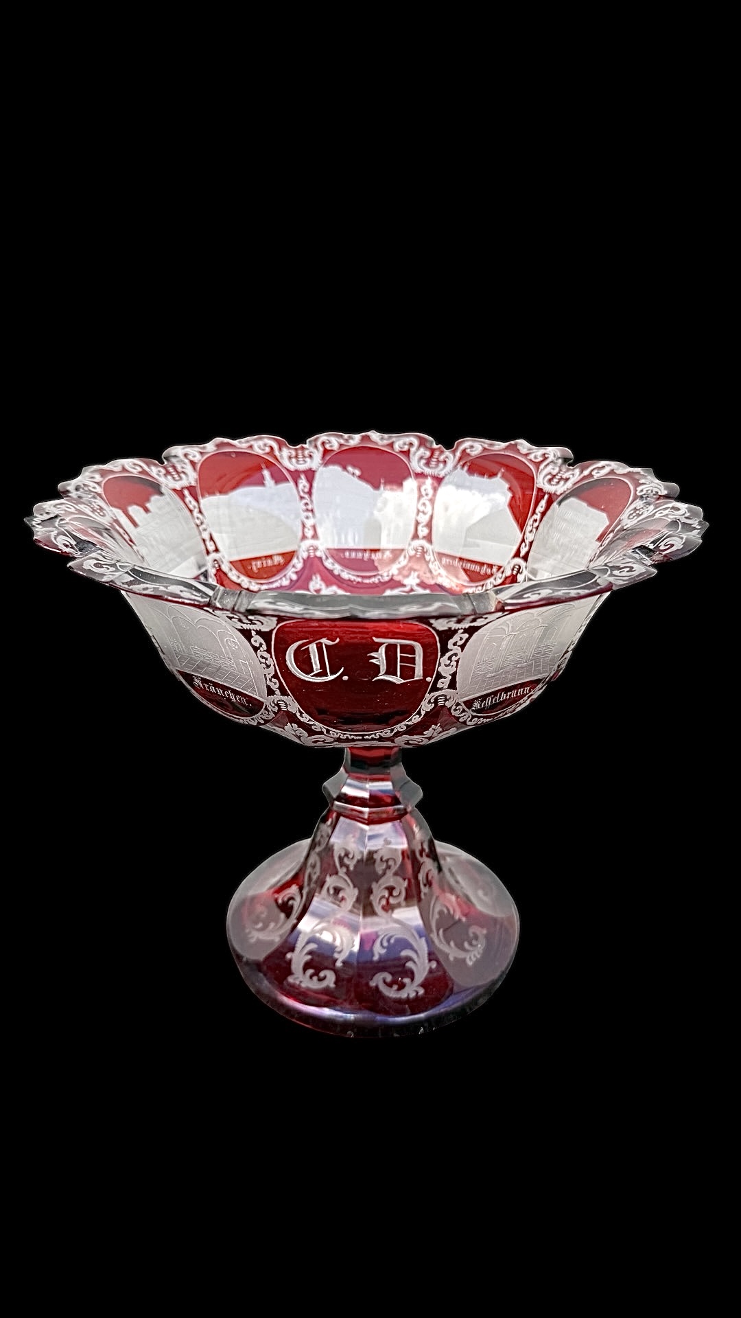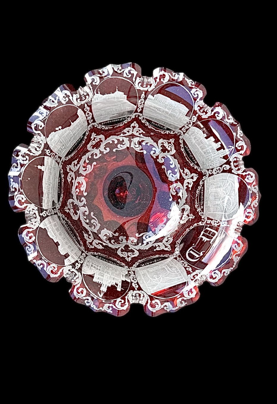 Coppa centrotavola in cristallo incamiciato e molato con motivi vegetali stilizzati e scene architettoniche in nove medaglioni e iniziali .Boemia.Periodo Biedermeier.Cm 20x17.Base:cm 10.