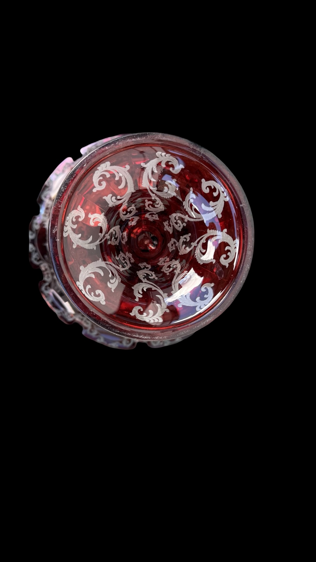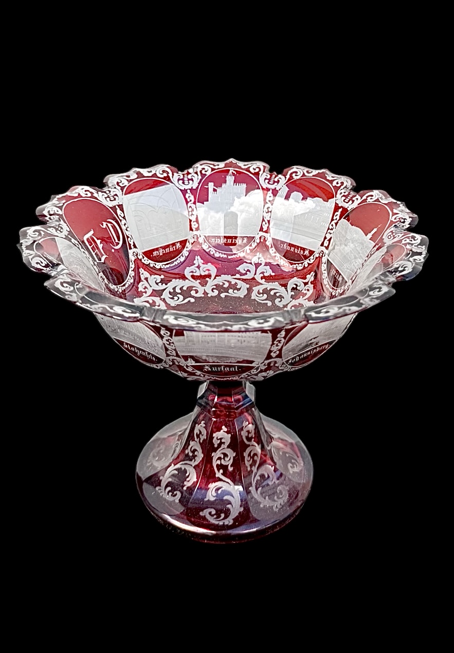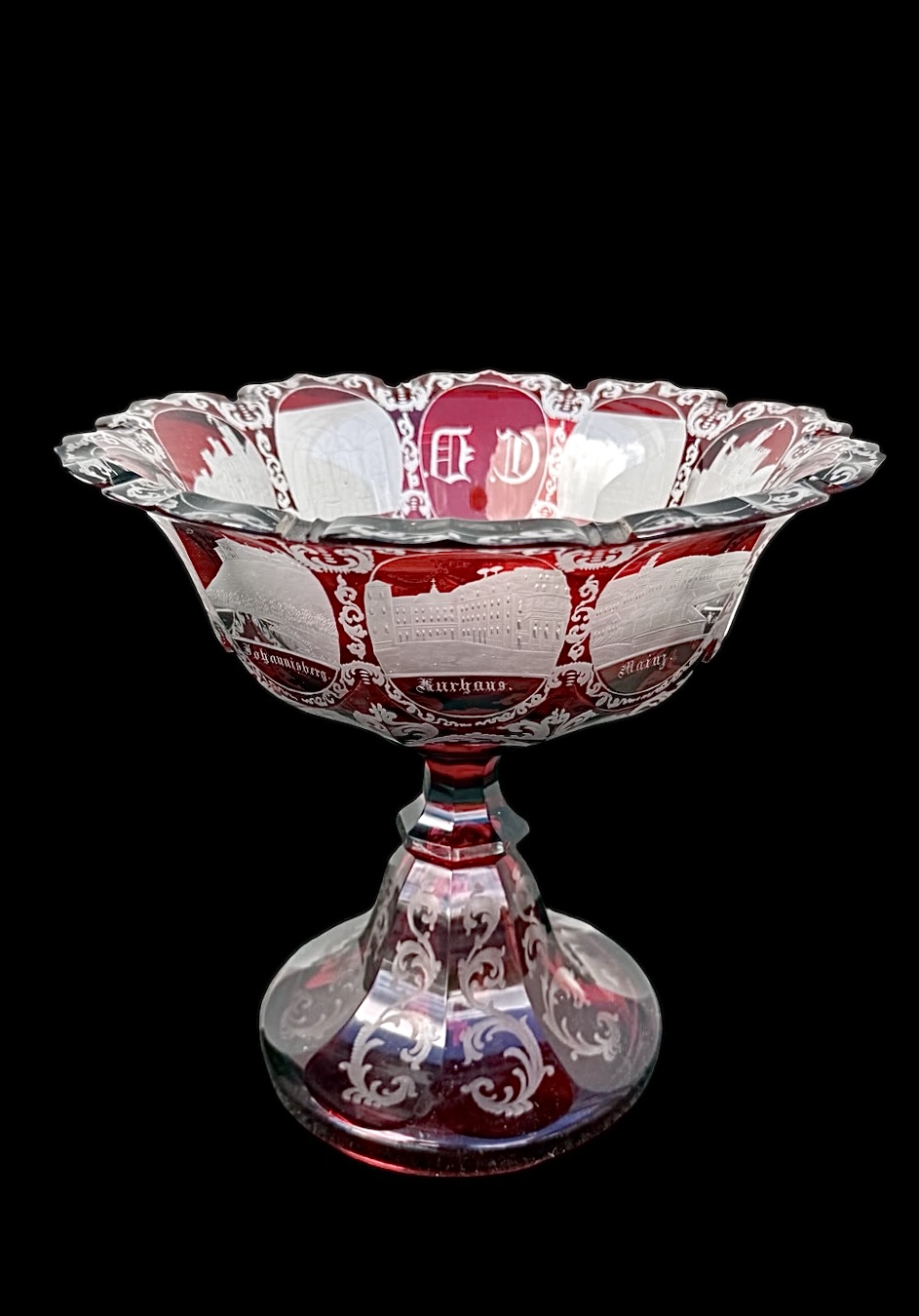 Coppa centrotavola in cristallo incamiciato e molato con motivi vegetali stilizzati e scene architettoniche in nove medaglioni e iniziali .Boemia.Periodo Biedermeier.Cm 20x17.Base:cm 10.