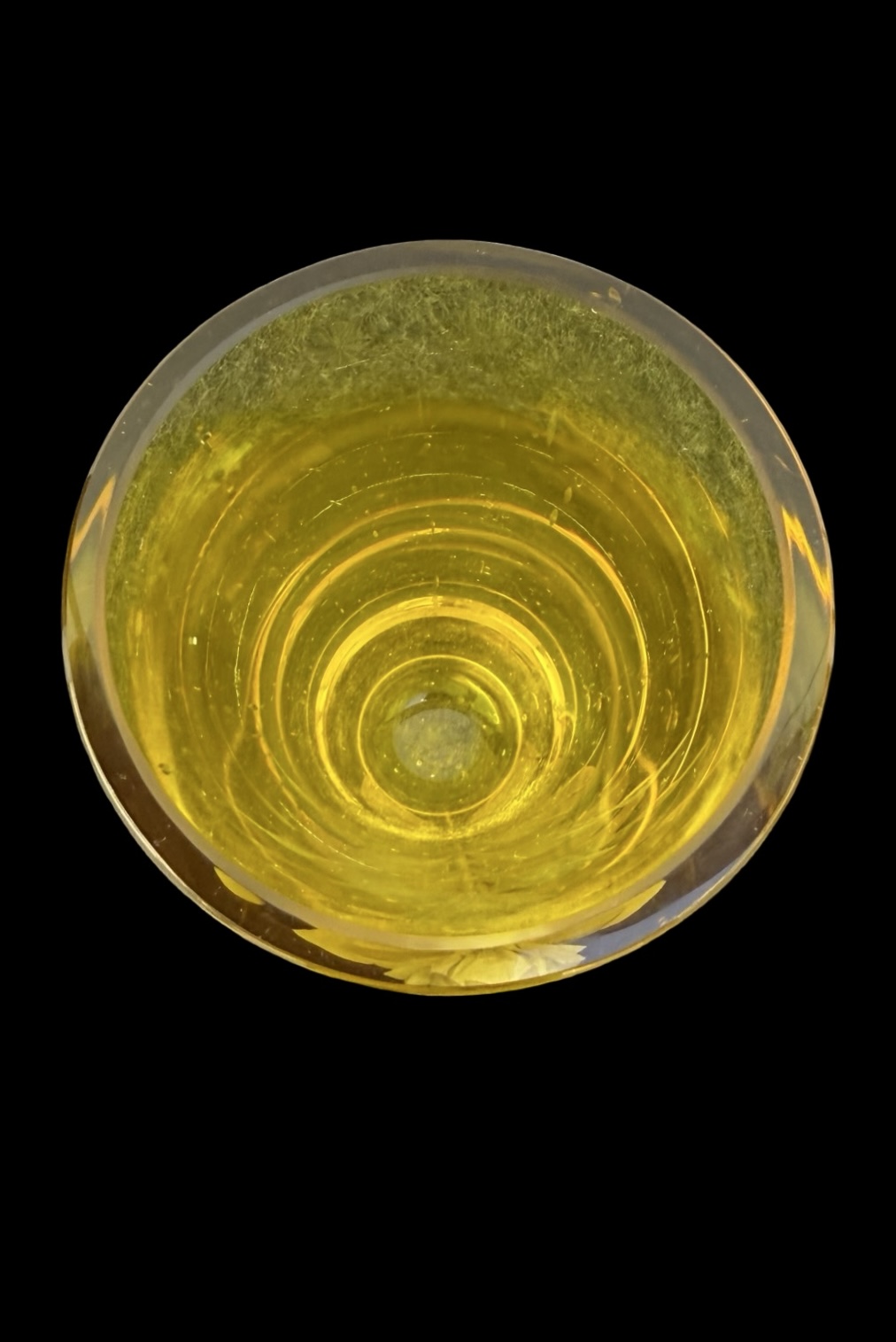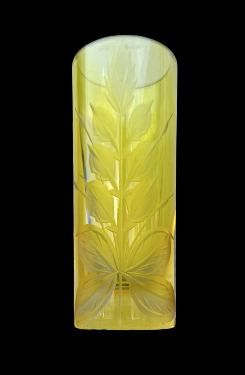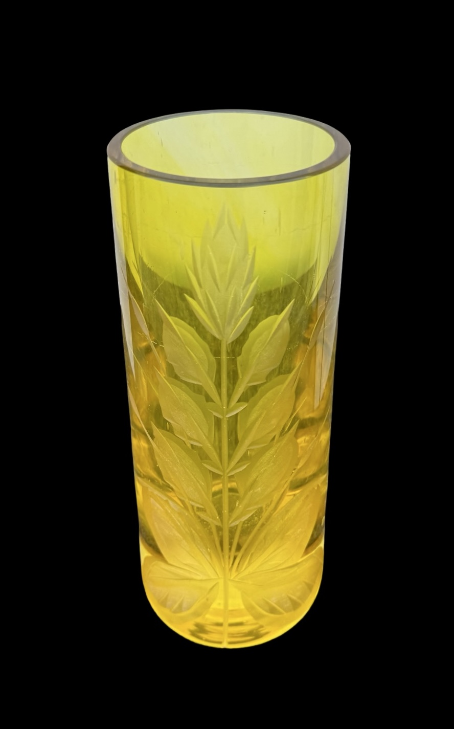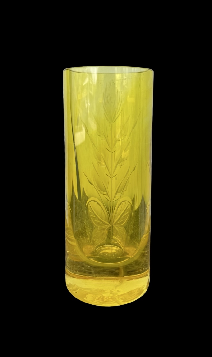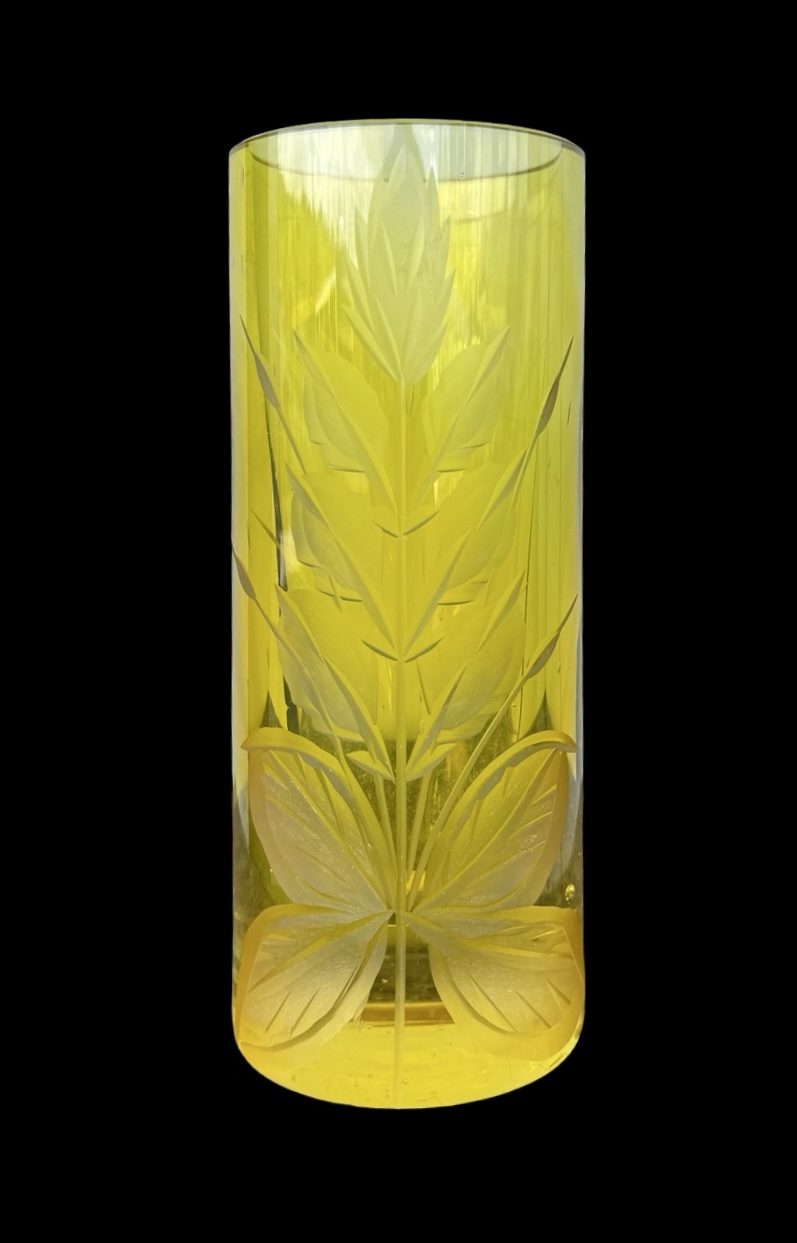 Vaso in cristallo giallo pesante cilindrico,inciso con motivo floreale.Boemia.Cm 23x9. Base:cm 14.