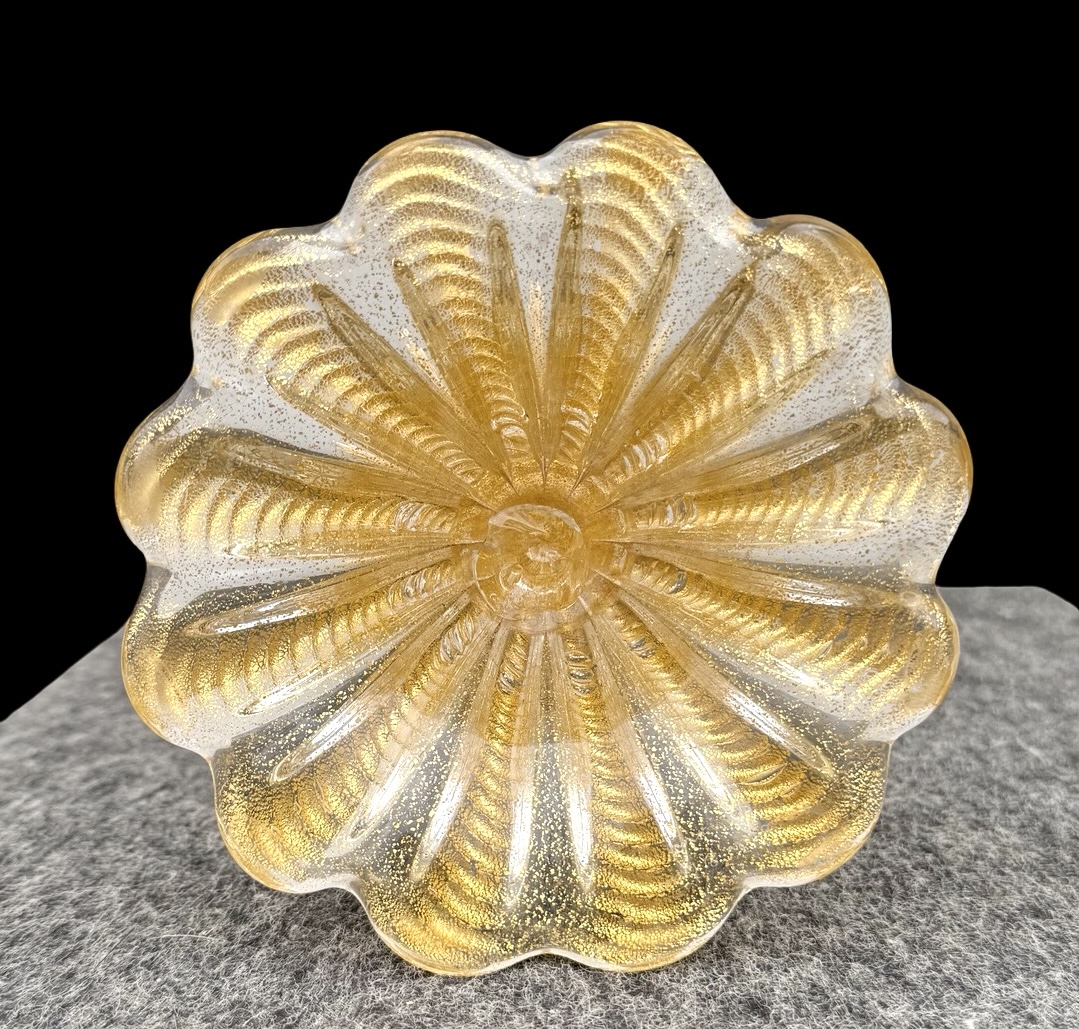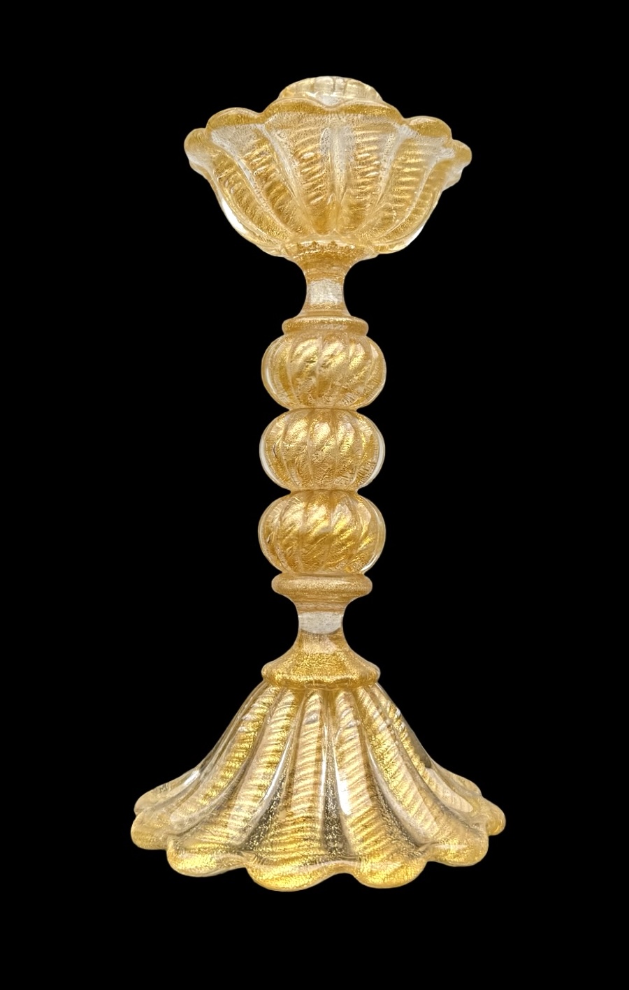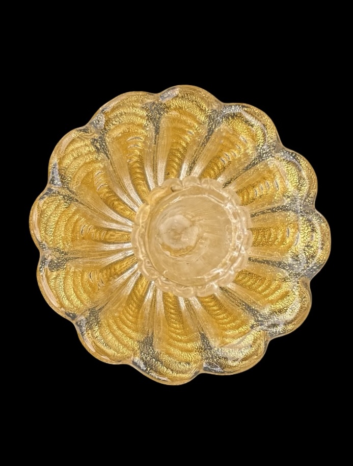 Candeliere in vetro pesante ‘cordonato oro’ con base e coppa baccellata e corpo con parti globulari rastremate.Barovier & Toso.Murano.Cm 32x15.Coppa:cm 12.