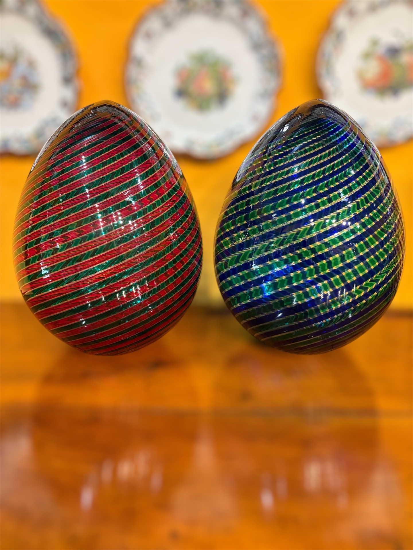 Coppia di grandi uova a canne ritorte , in vetro , manifattura Venini , firma a graffio , altezza cm 30