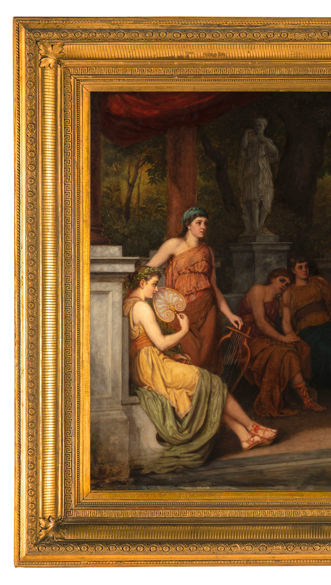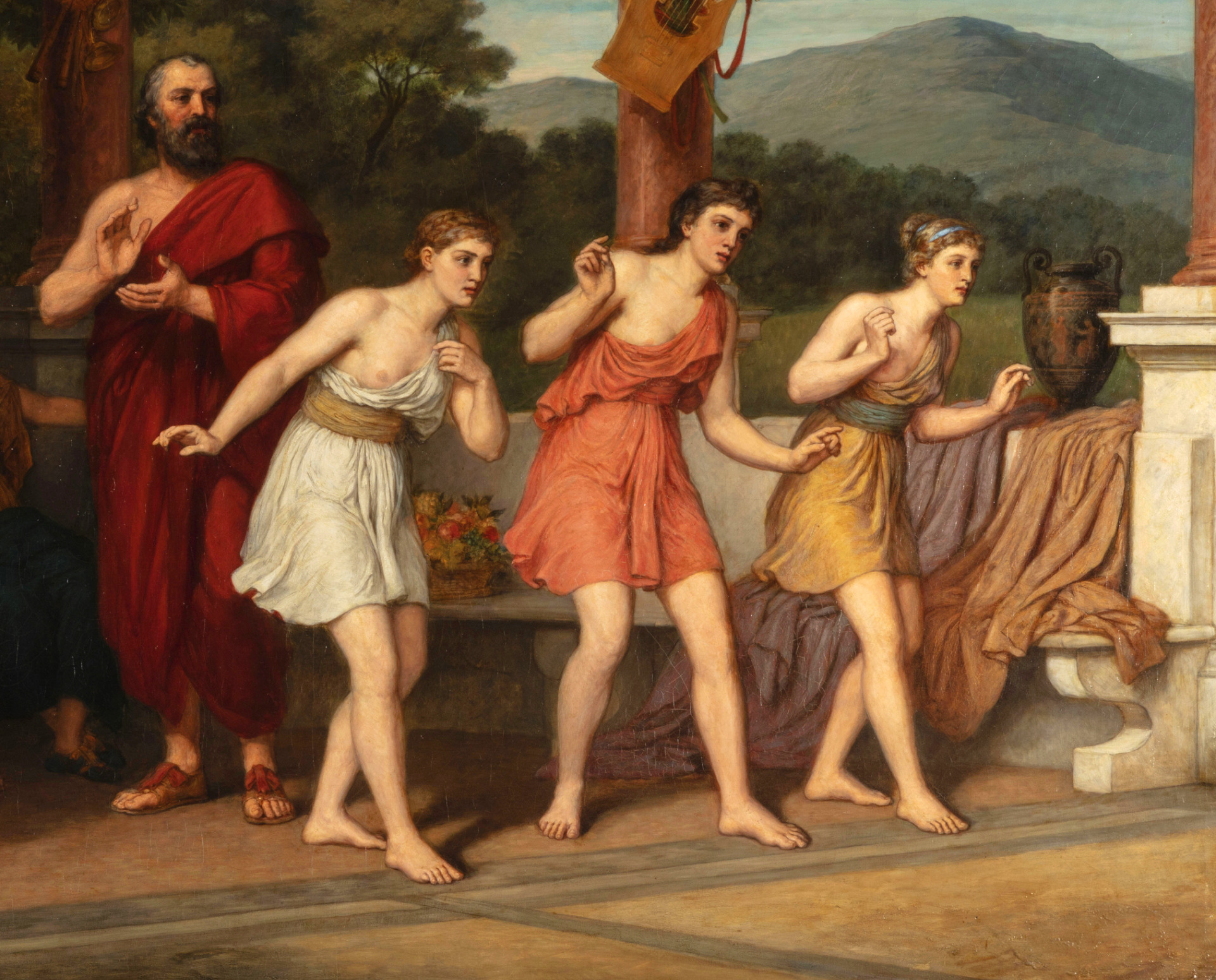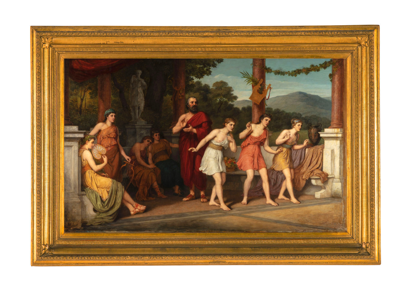 The painting, of considerable size and great decorative effect, depicts three young women dancing while a man marks time by clapping his hands. Around the scene, other women observe attentively; one holds a zither, while another waves a fan. The scene takes place in an open space, in neoclassical style, decorated with a colonnade and marble statues. The scene appears to be the moment dedicated to music and dance during a symposium in ancient Greece.