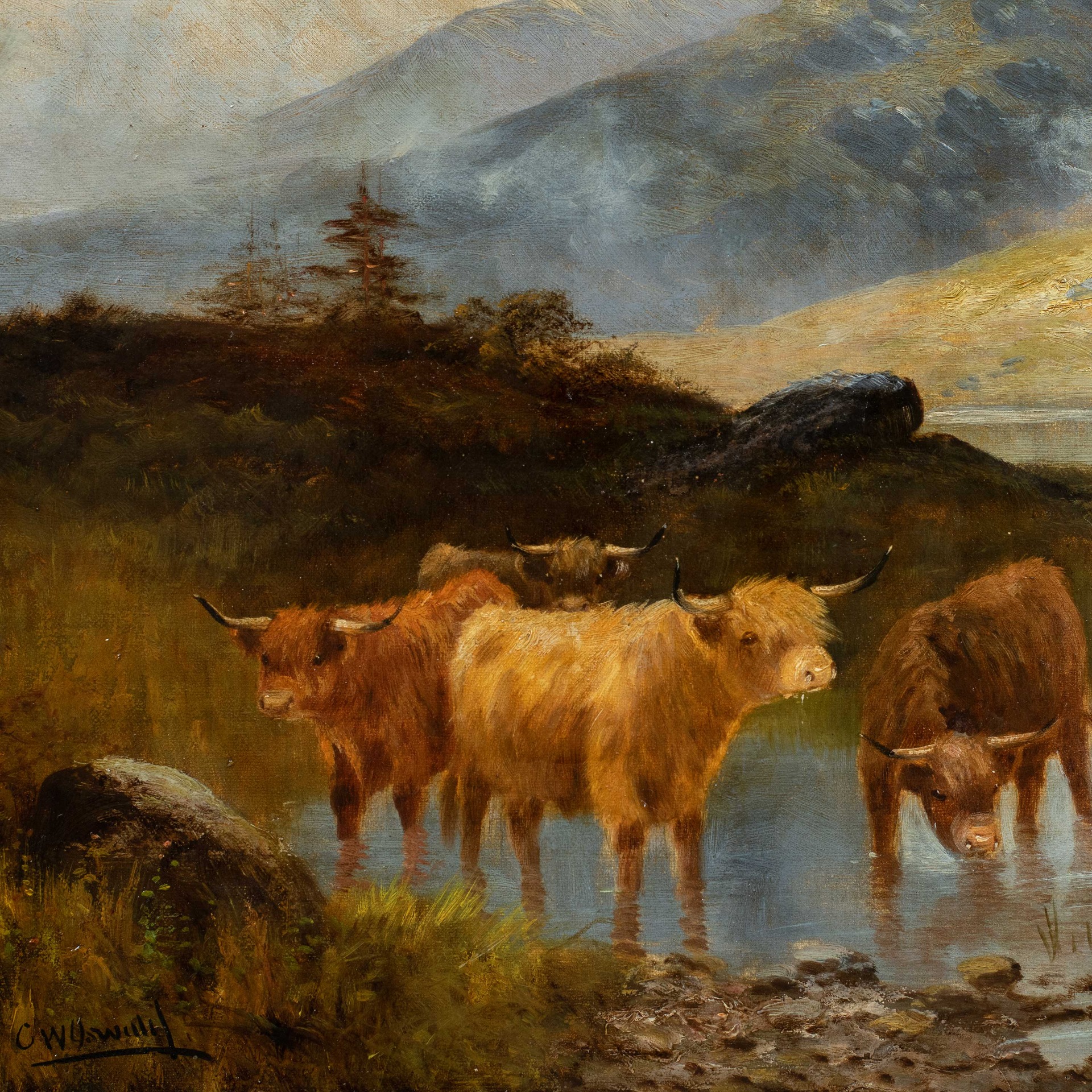 British painter (late 19th century) - Landscape with a Herd of Highlanders by the lake.