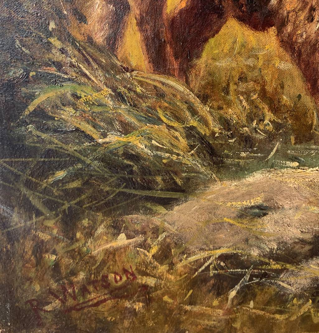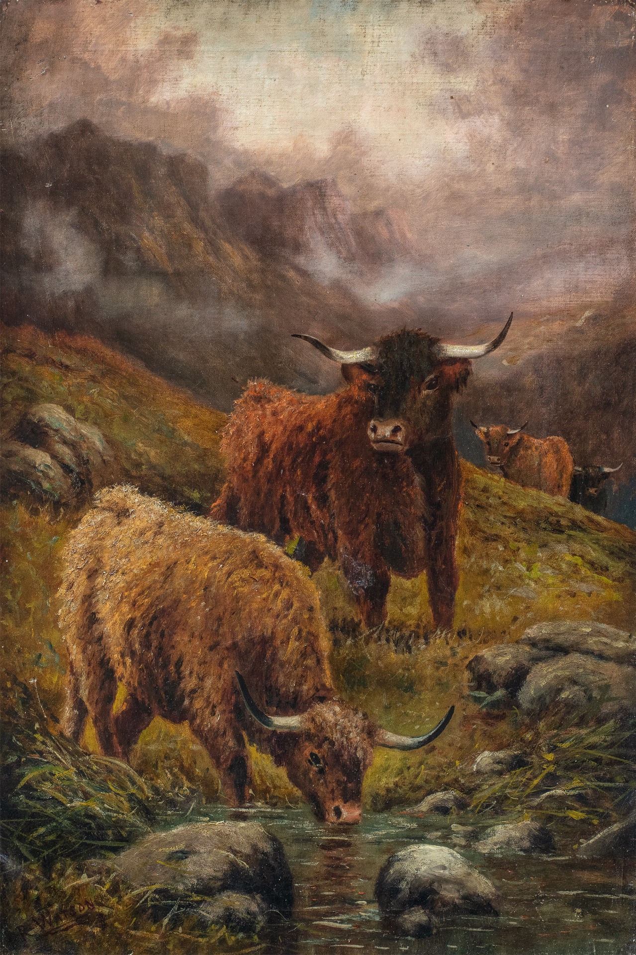 R. Watson (British, late 19th century) - Herd of Highland cattle grazing.